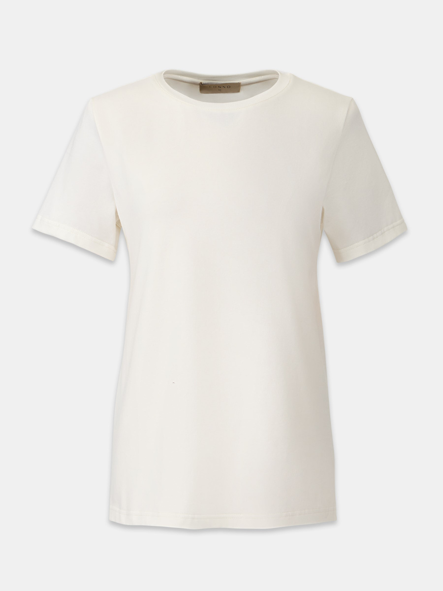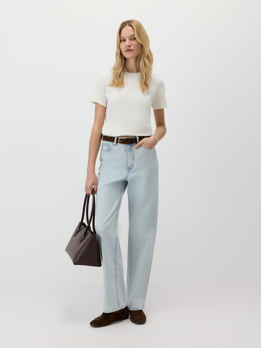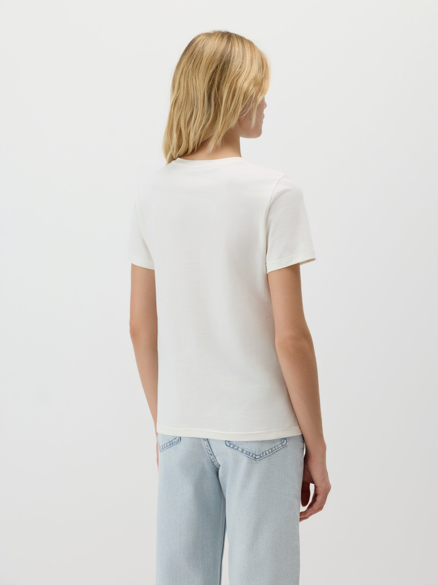 Универсальная базовая футболка — полуприлегающего силуэта, среднего облегания без обтягивания и с классическим круглым вырезом. Длина до линии бедер позволяет легко заправлять или носить изделие навыпуск. Мягкий хлопок с лайкрой обеспечивает комфорт и чуть тянется, адаптируясь под особенности фигуры.