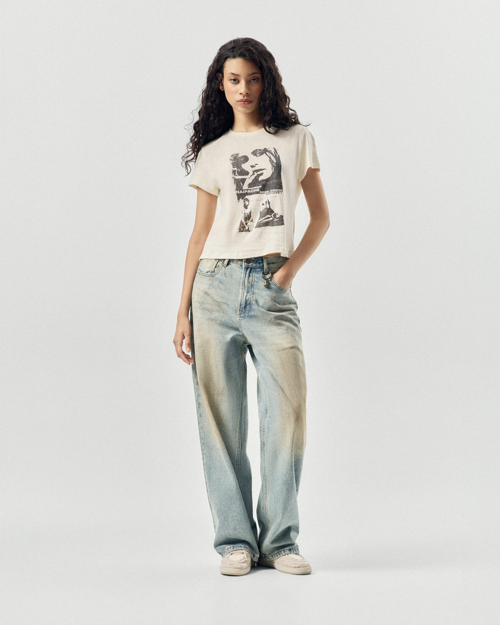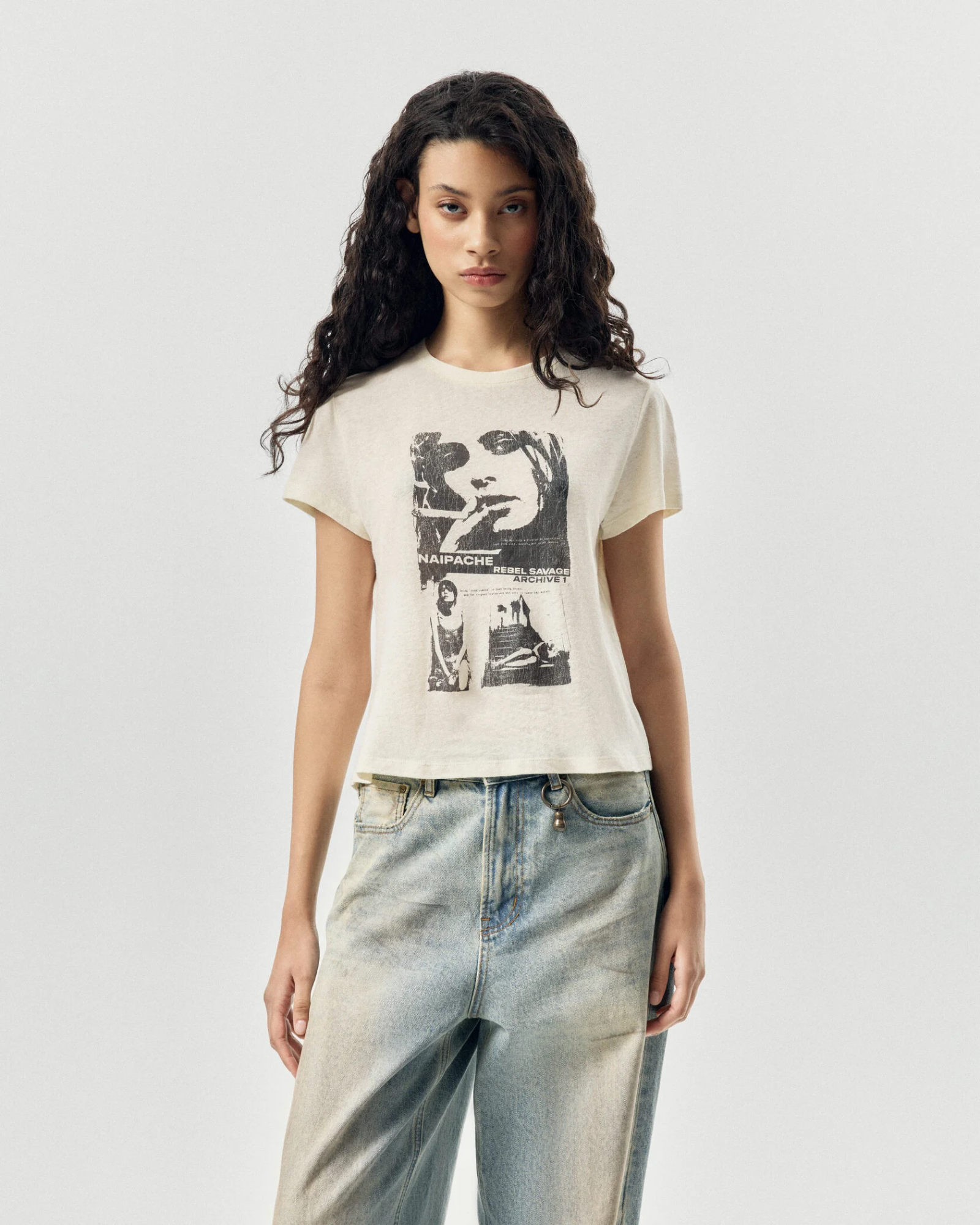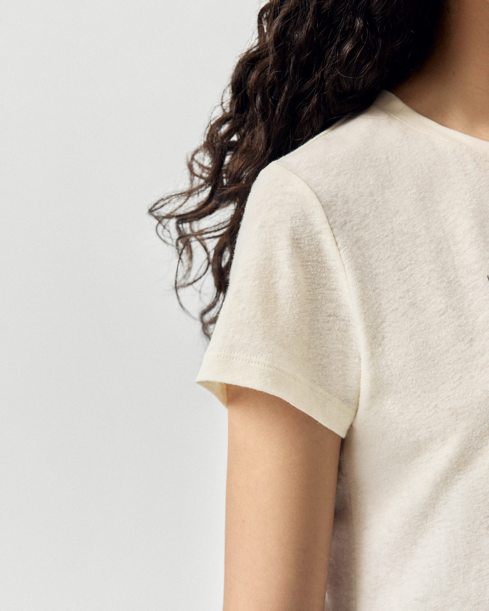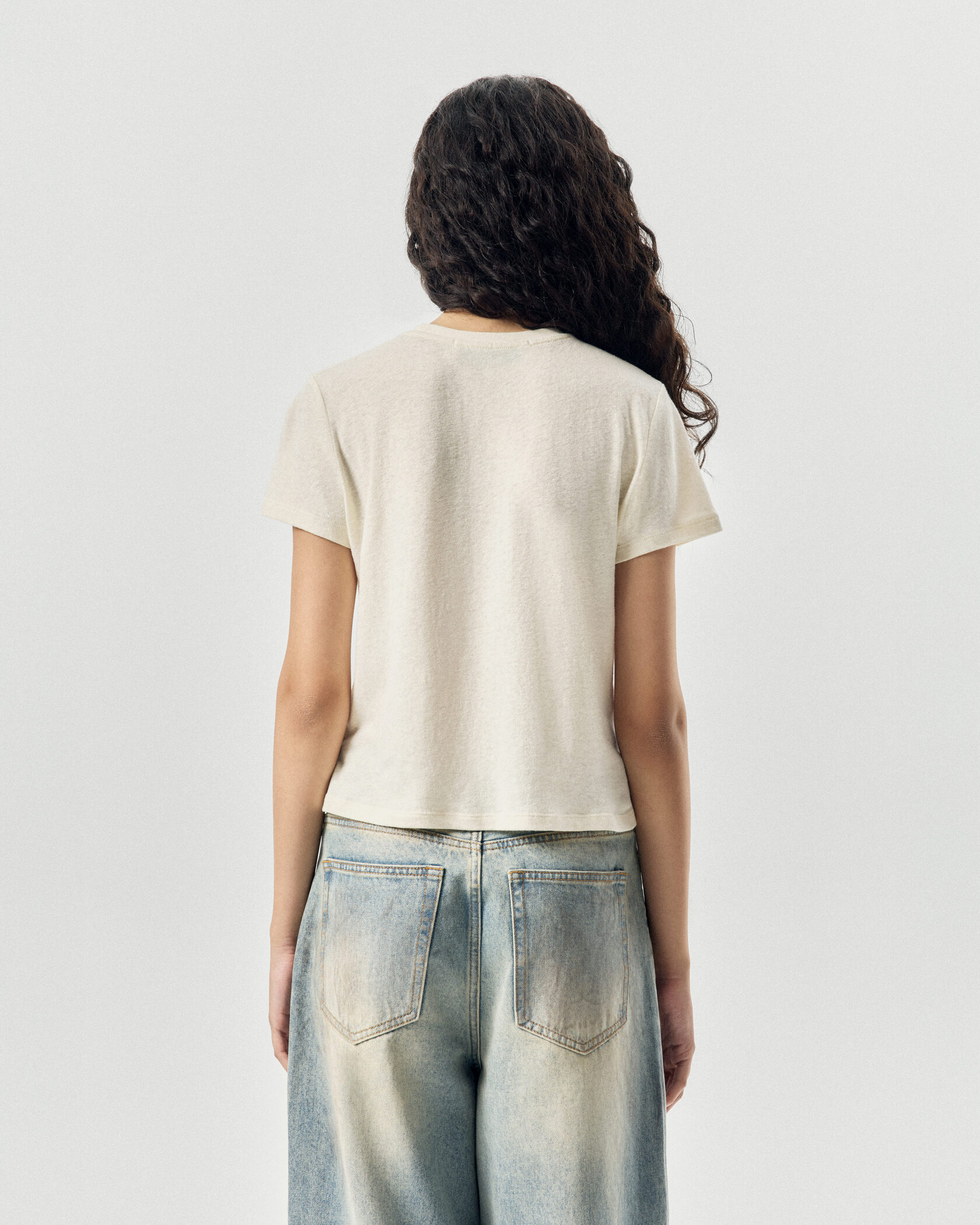 Женская футболка из льна и хлопка, плотностью ткани 145 г/м² обладает легкостью и тактильной мягкостью, напоминающей вторую кожу. Модель сочетает приталенный крой, подчеркивающий линию талии, с естественной фактурностью и воздухопроницаемостью льна. Принт нанесен методом ручной печати, что придает каждому изделию индивидуальный характер. Финальная обработка материала придает ему дополнительную мягкость и создает эффект легкого естественного износа. Футболка легко интегрируется в гардероб, сочетаясь с брюками на низкой посадке, джинсами или худи.