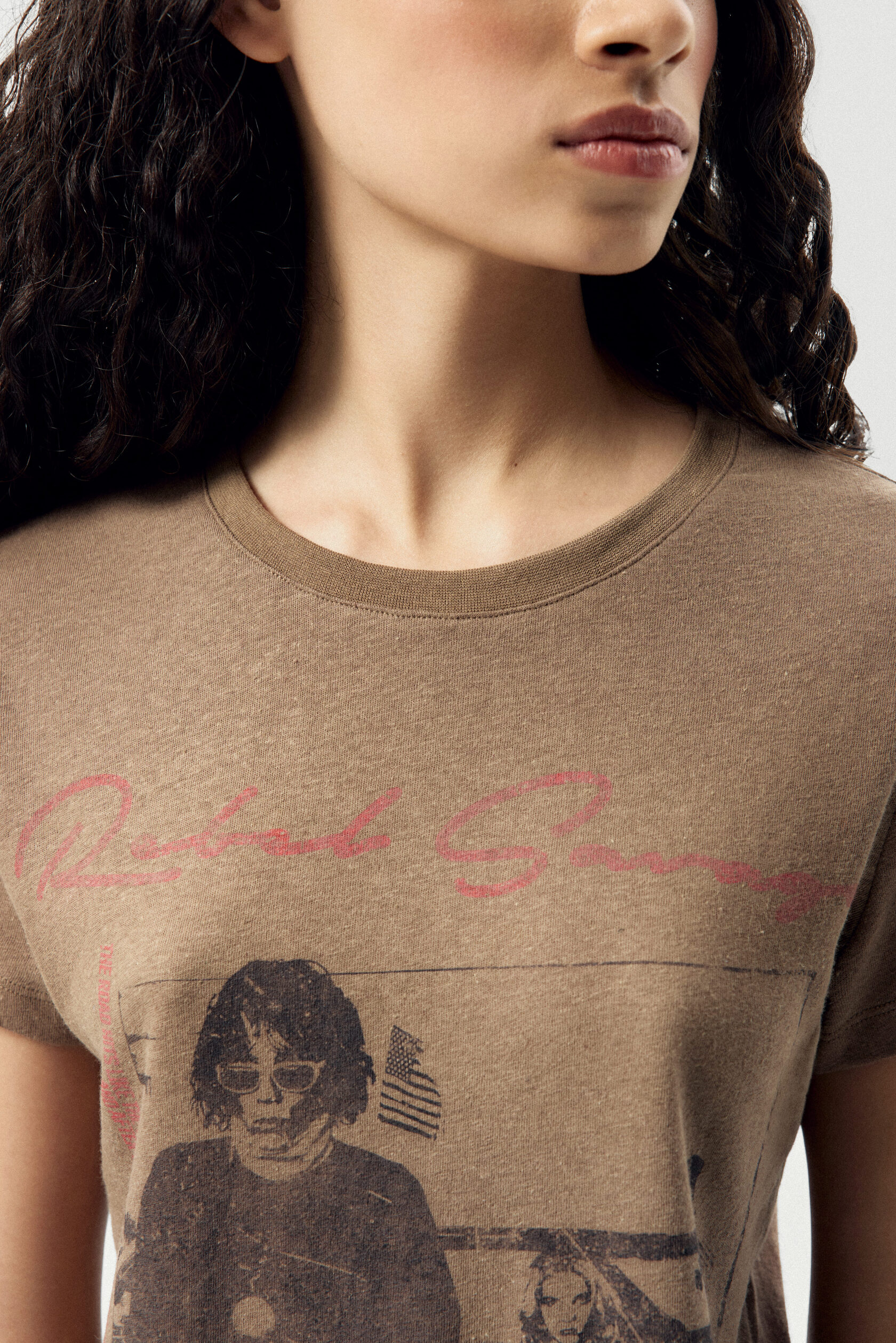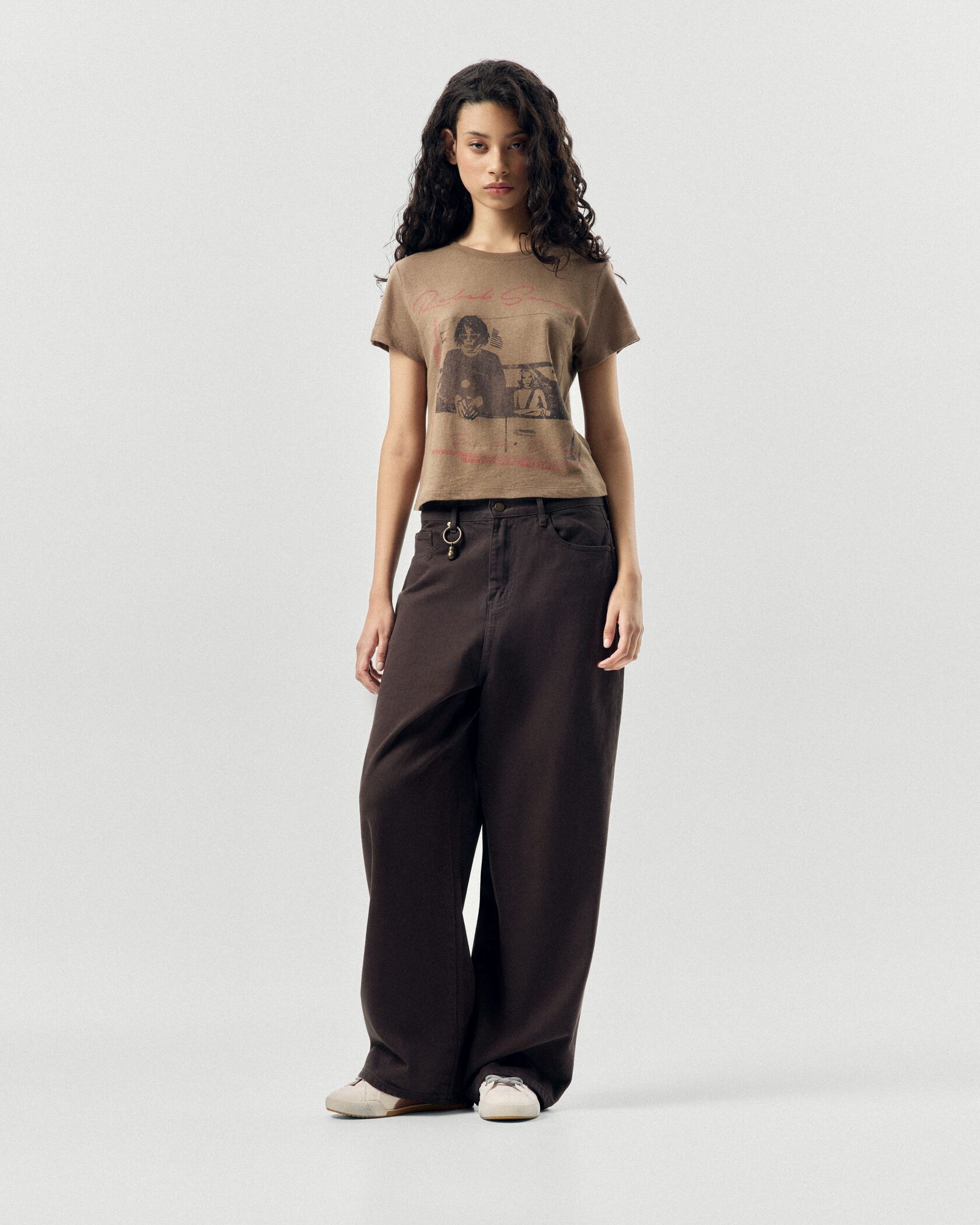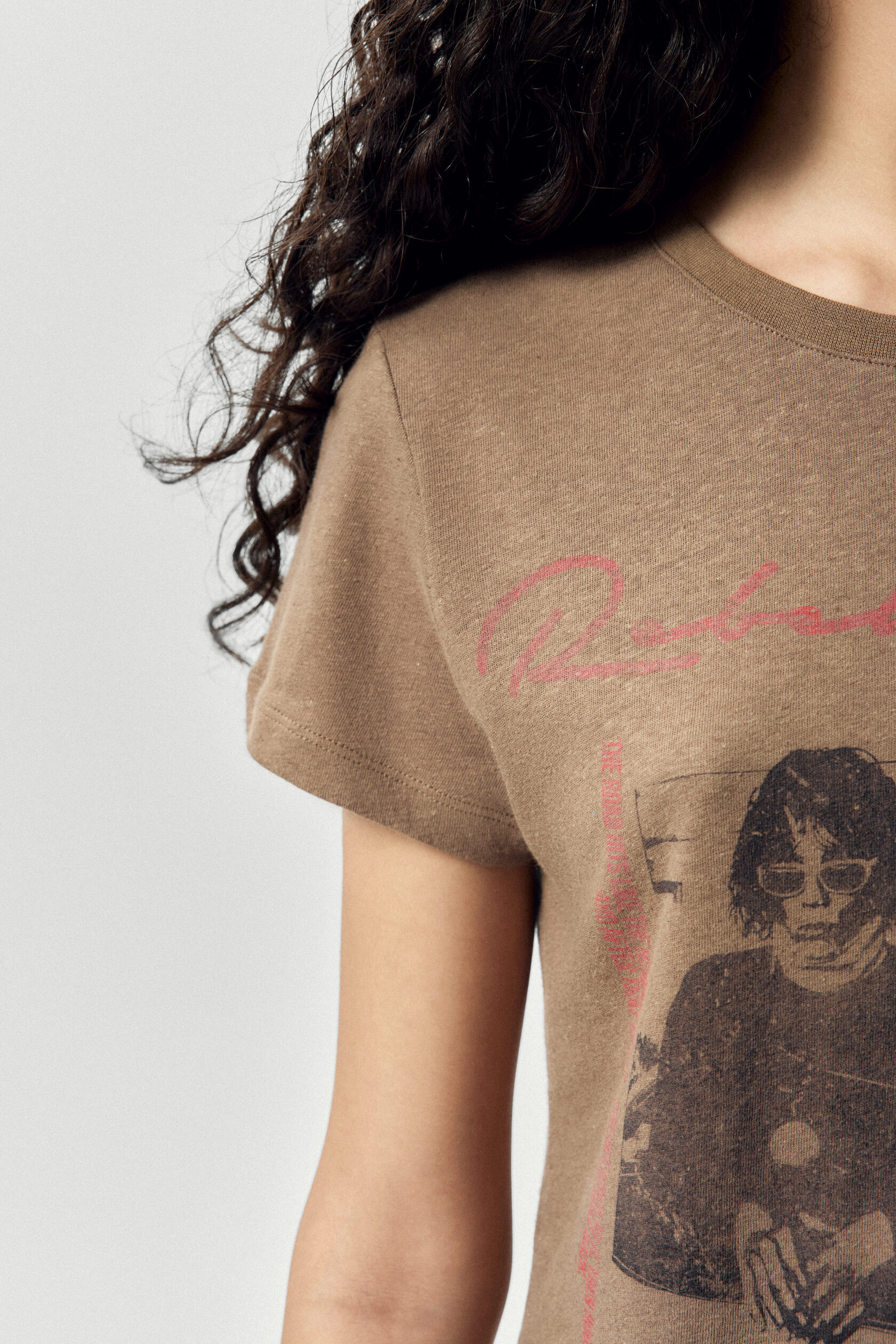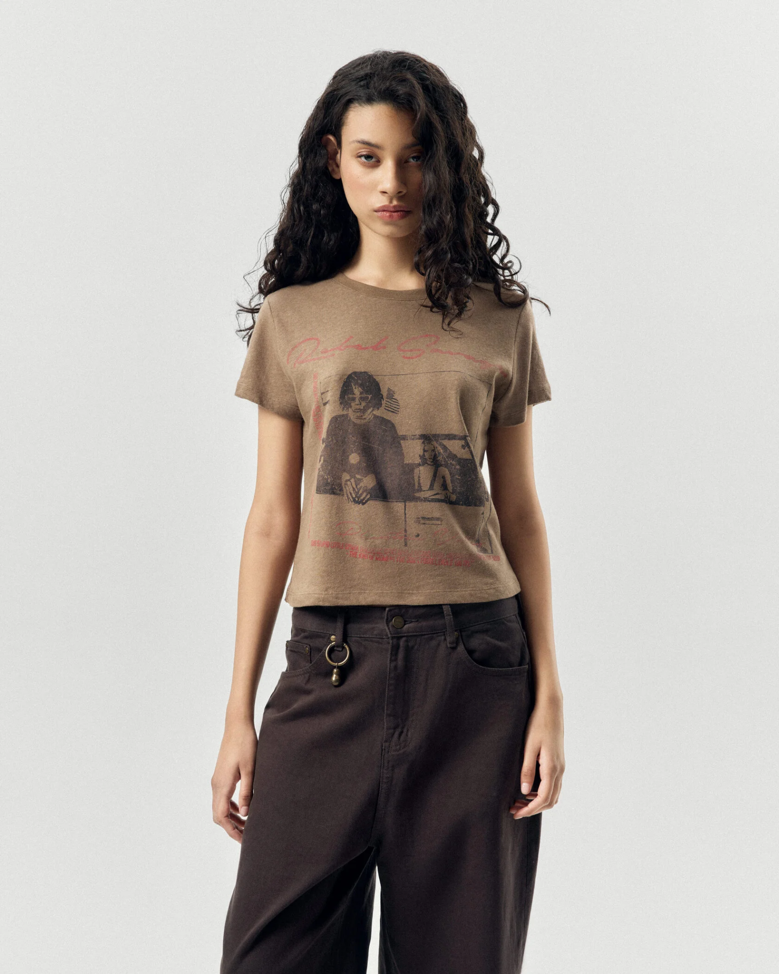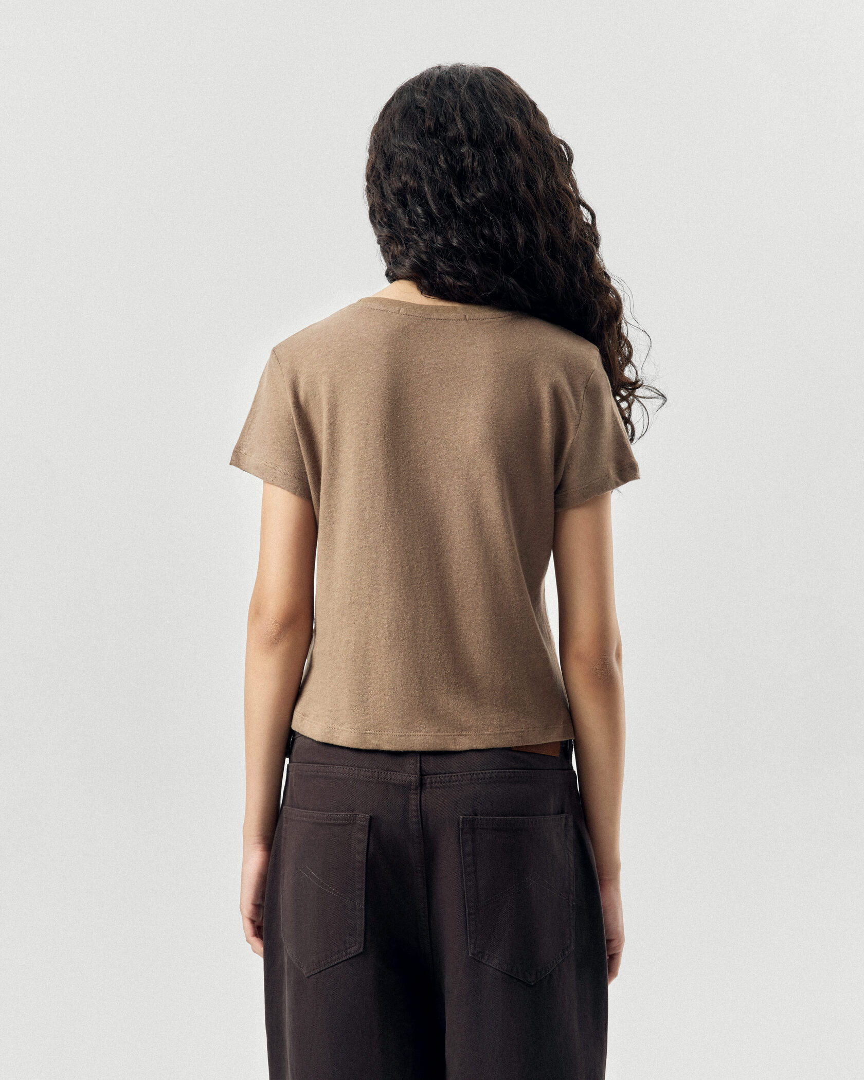 Женская футболка из льна и хлопка, плотностью ткани 145 г/м² обладает легкостью и тактильной мягкостью, напоминающей вторую кожу. Модель сочетает приталенный крой, подчеркивающий линию талии, с естественной фактурностью и воздухопроницаемостью льна. Принт нанесен методом ручной печати, что придает каждому изделию индивидуальный характер. Финальная обработка материала придает ему дополнительную мягкость и создает эффект легкого естественного износа. Футболка легко интегрируется в гардероб, сочетаясь с брюками на низкой посадке, джинсами или худи.