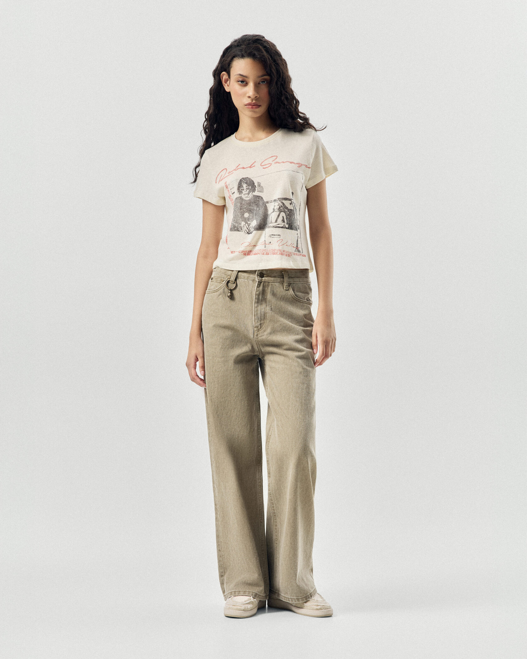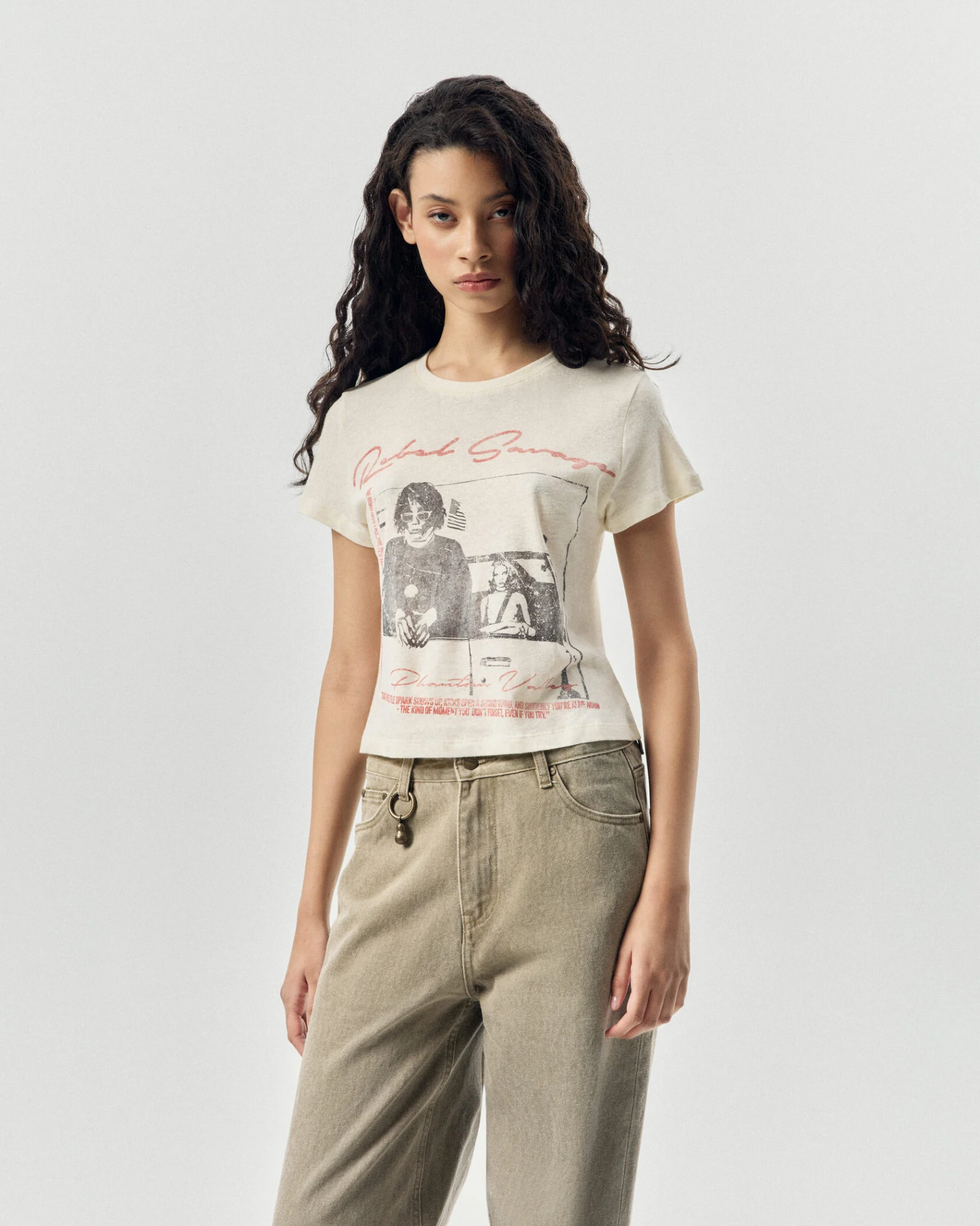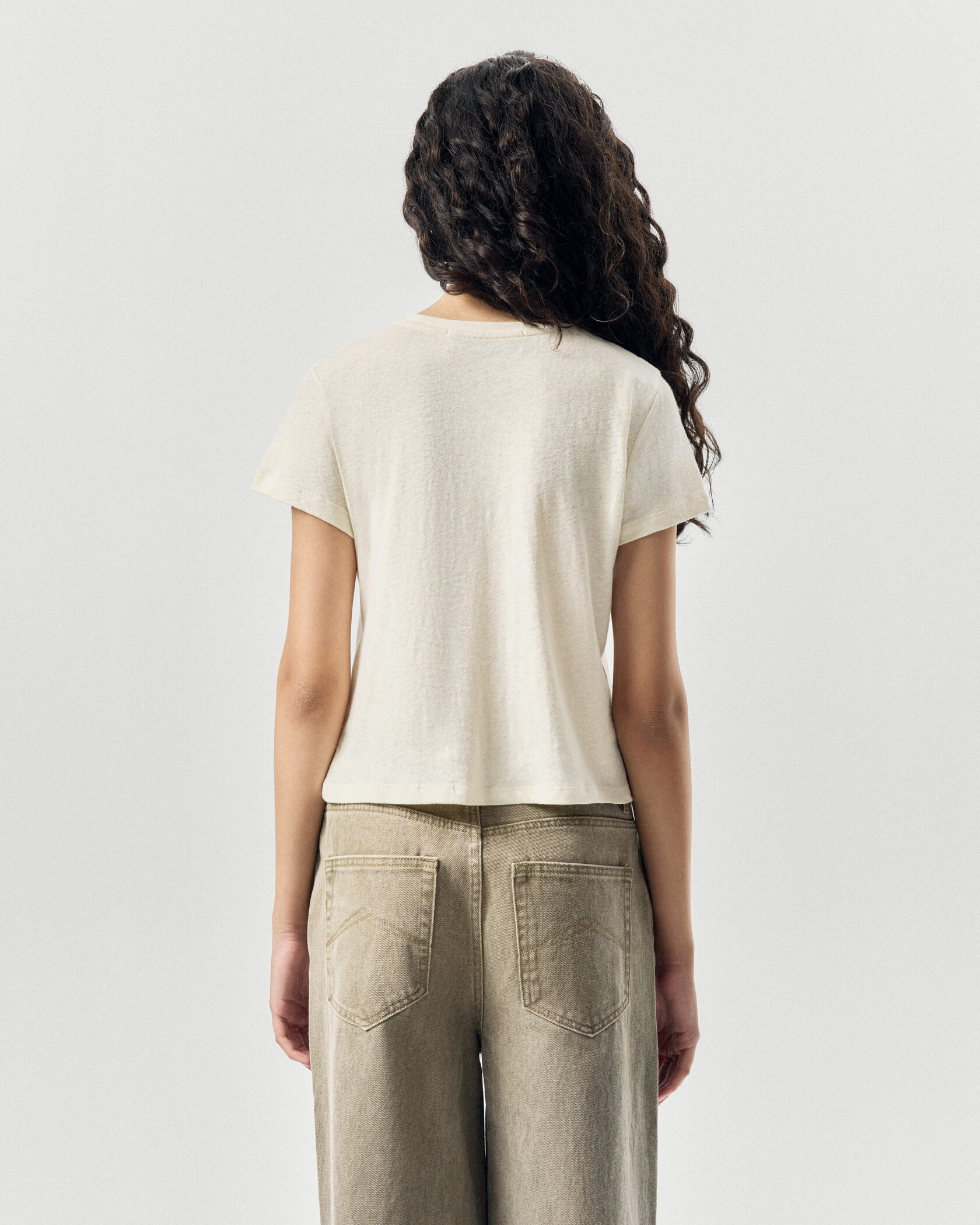 Женская футболка из льна и хлопка, плотностью ткани 145 г/м² обладает легкостью и тактильной мягкостью, напоминающей вторую кожу. Модель сочетает приталенный крой, подчеркивающий линию талии, с естественной фактурностью и воздухопроницаемостью льна. Принт нанесен методом ручной печати, что придает каждому изделию индивидуальный характер. Финальная обработка материала придает ему дополнительную мягкость и создает эффект легкого естественного износа. Футболка легко интегрируется в гардероб, сочетаясь с брюками на низкой посадке, джинсами или худи.