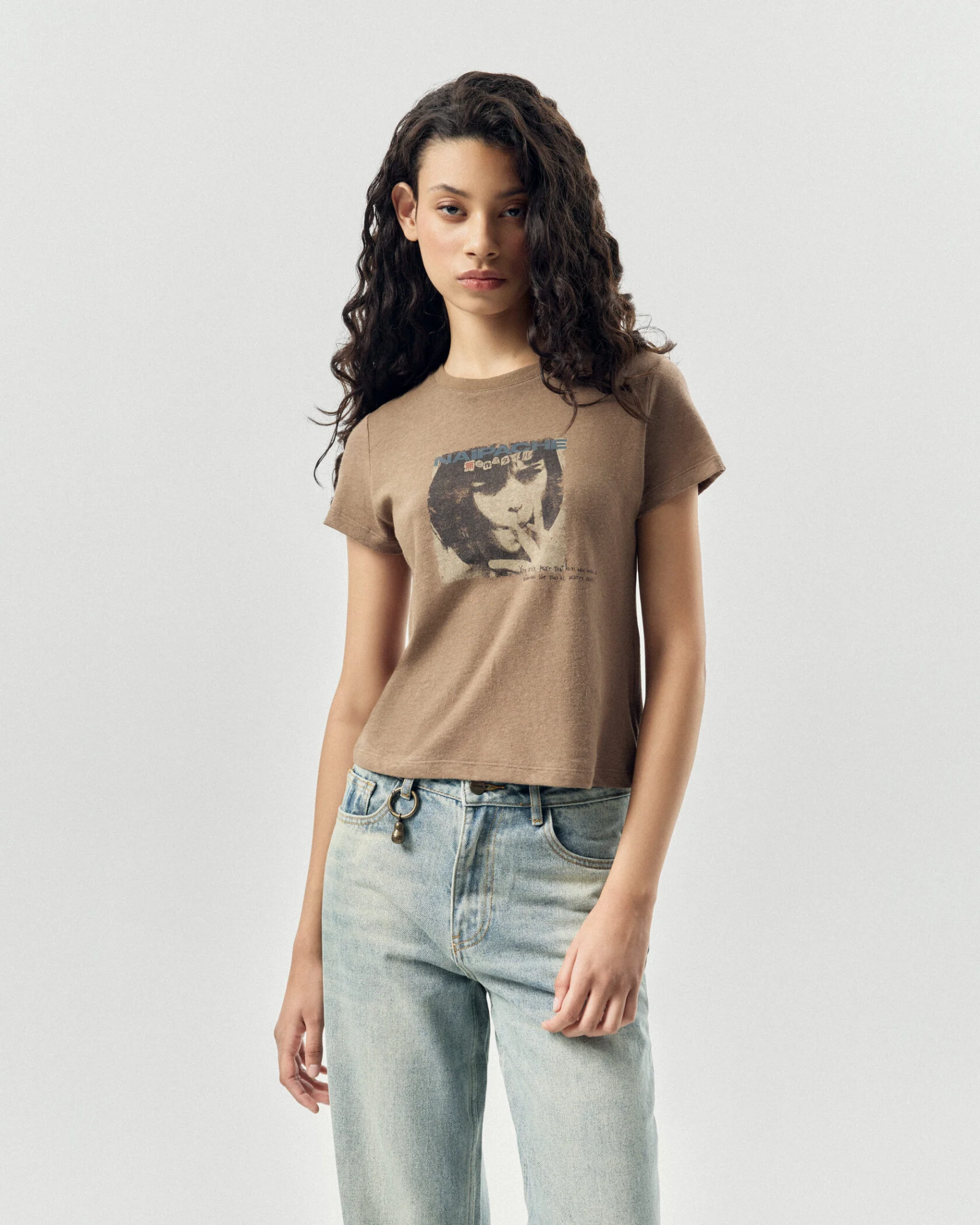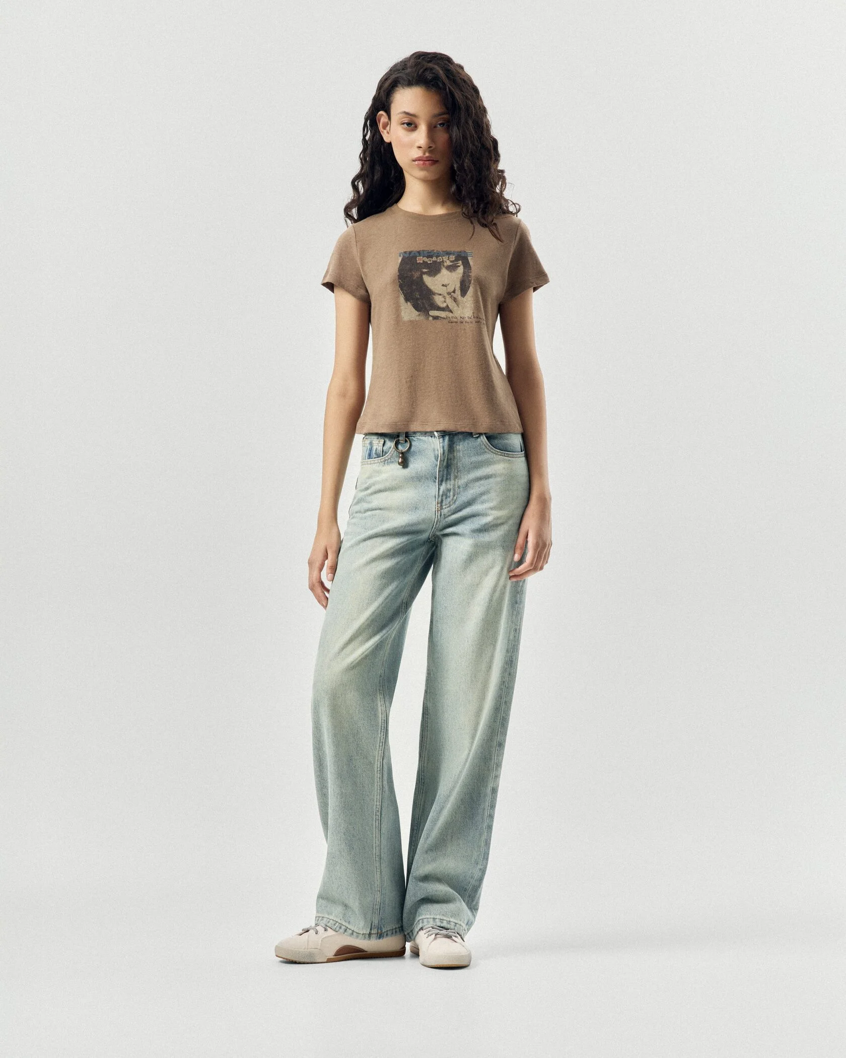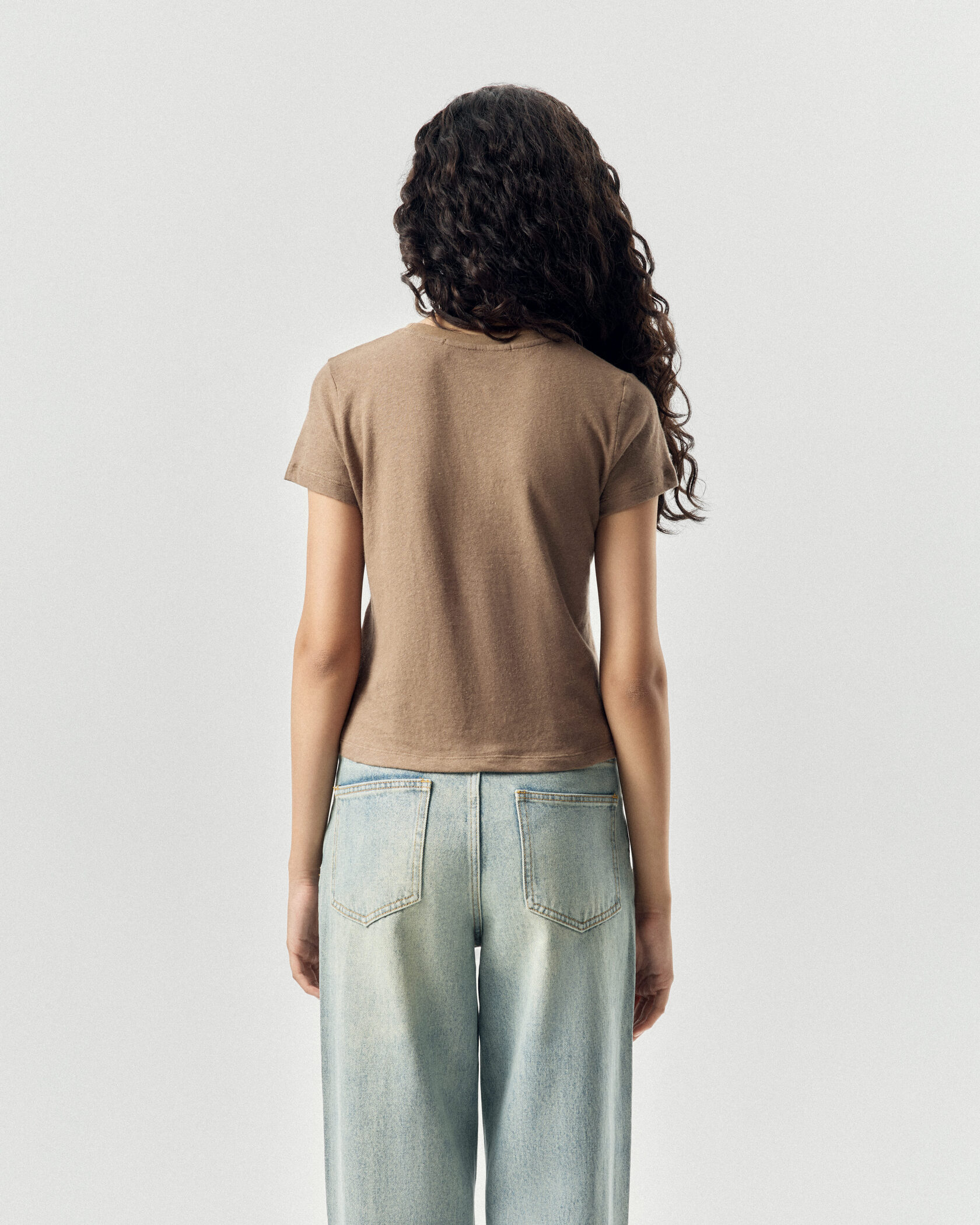 Женская футболка из льна и хлопка, плотностью ткани 145 г/м² обладает легкостью и тактильной мягкостью, напоминающей вторую кожу. Модель сочетает приталенный крой, подчеркивающий линию талии, с естественной фактурностью и воздухопроницаемостью льна. Принт нанесен методом ручной печати, что придает каждому изделию индивидуальный характер. Финальная обработка материала придает ему дополнительную мягкость и создает эффект легкого естественного износа. Футболка легко интегрируется в гардероб, сочетаясь с брюками на низкой посадке, джинсами или худи.