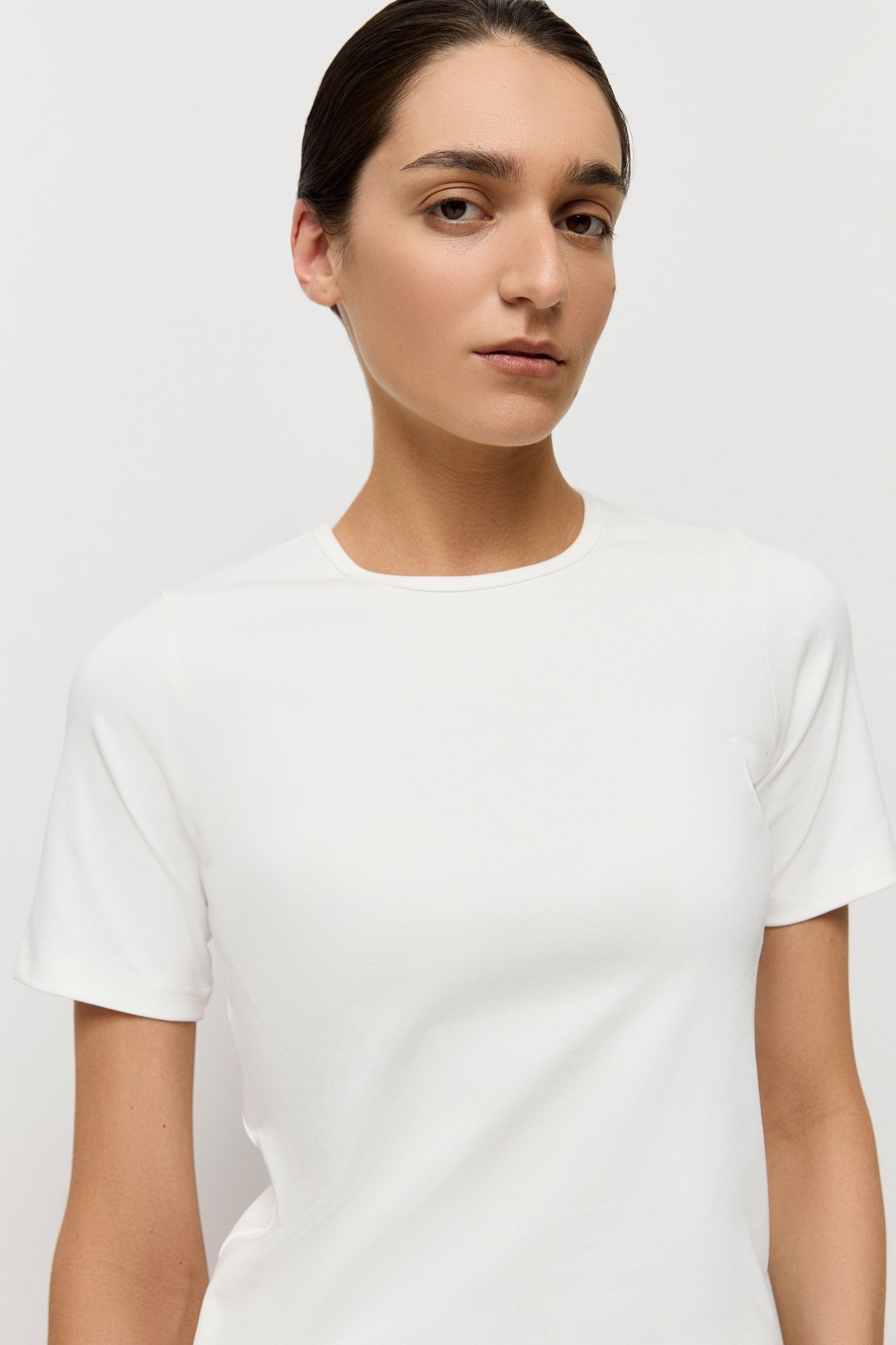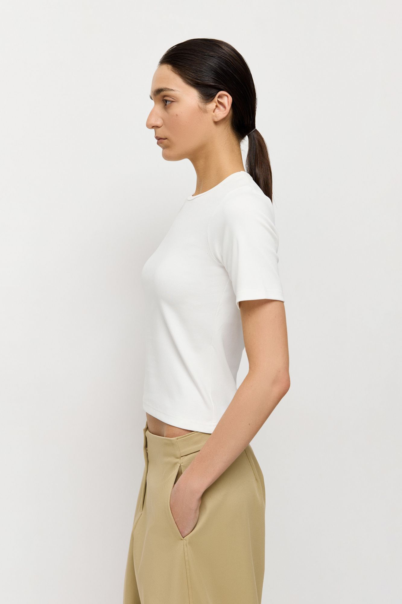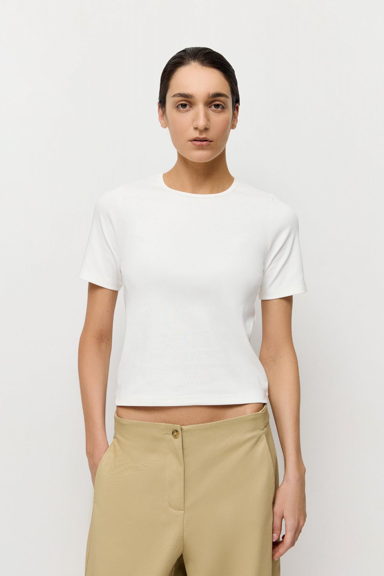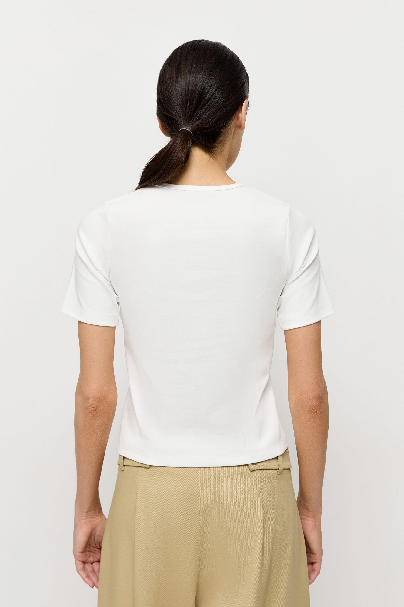 Дизайн изделия отсылает к облегающим коротким футболкам в стиле девяностых и нулевых. Позаимствовали у этой эпохи лаконичный крой, округлый вырез горловины и короткие рукава.