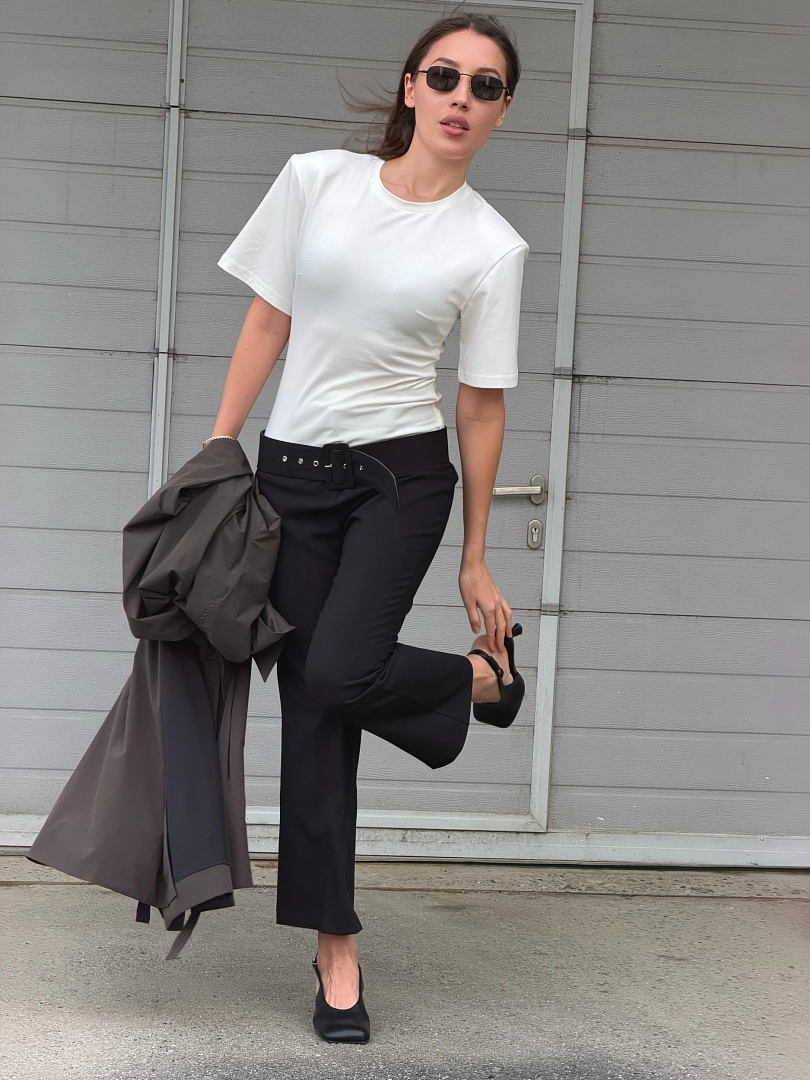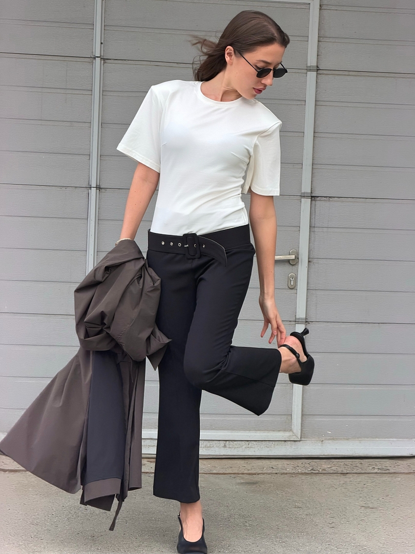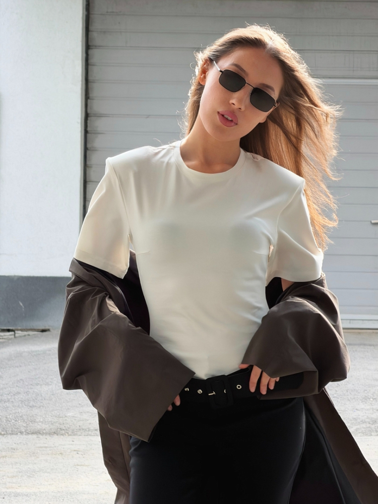 Футболка приталенного кроя с подплечниками — стильная и современная модель, которая красиво подчеркивает силуэт и добавляет образу выразительности. Приталенная посадка делает акцент на фигуре, а подплечники помогают создать более собранный и актуальный силуэт. Футболка легко вписывается в повседневные и более стильные образы, отлично сочетается с джинсами, брюками, юбками и жакетами. Это универсальный вариант для тех, кто ценит комфорт, лаконичность и модный акцент в базовом гардеробе.