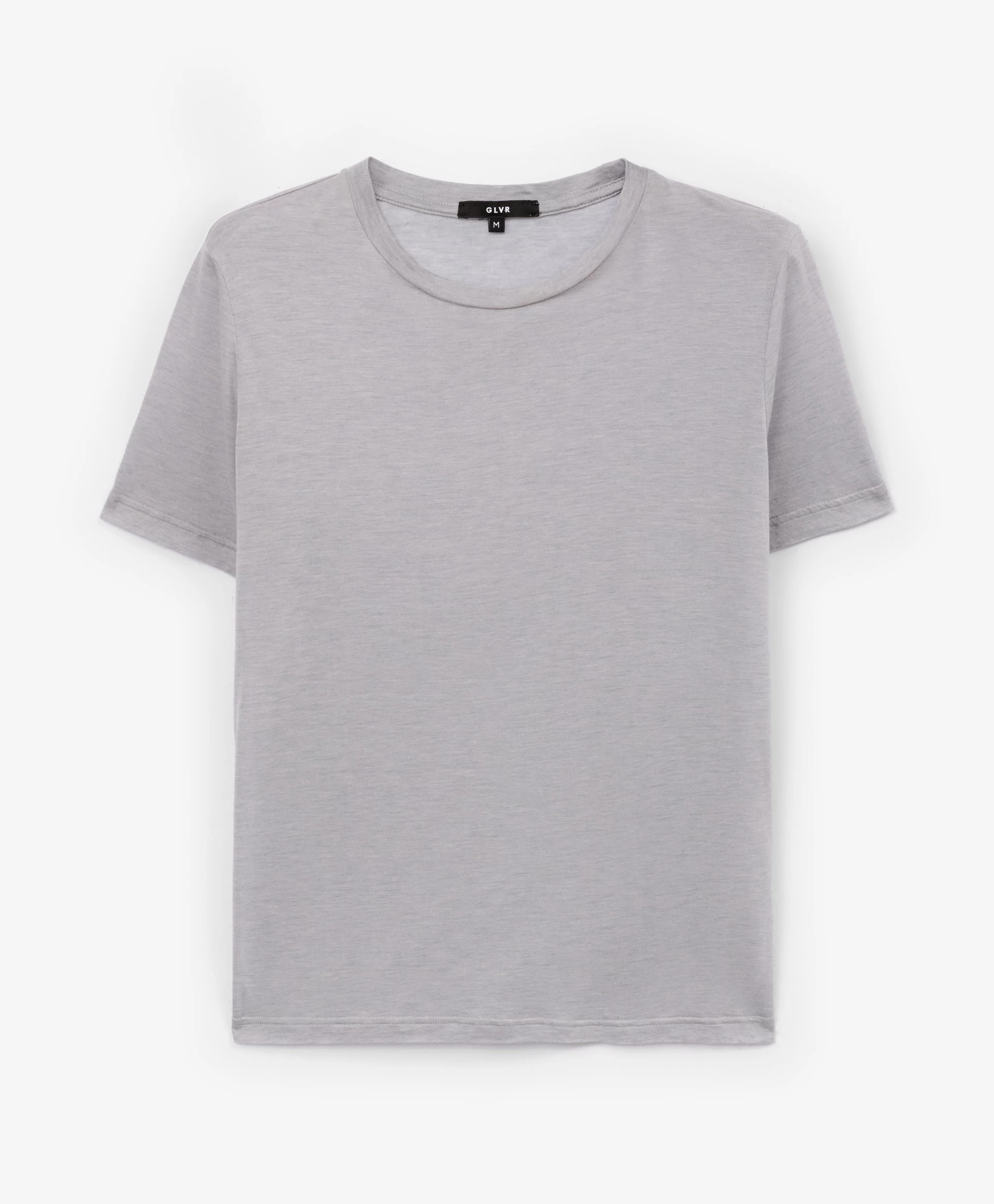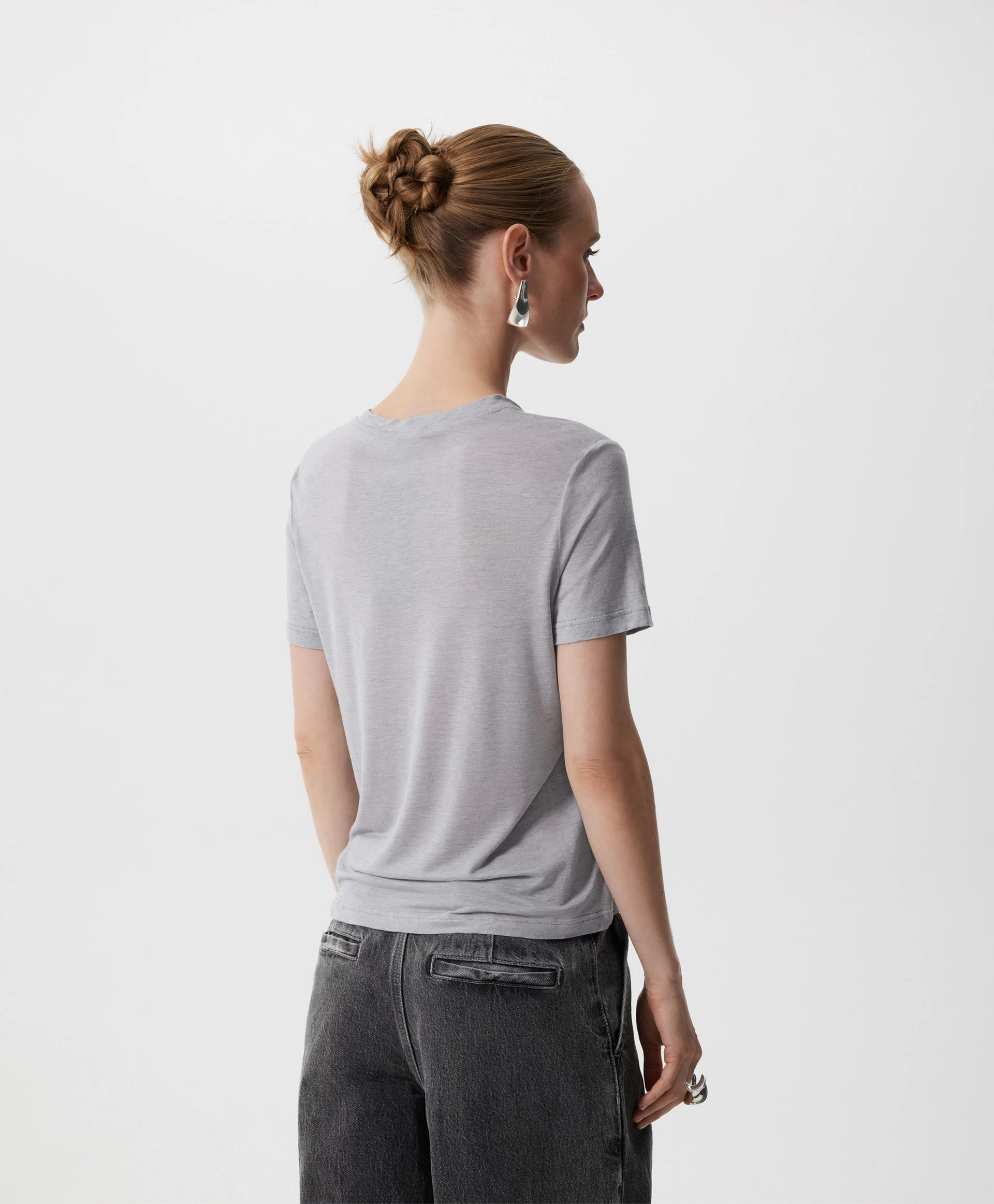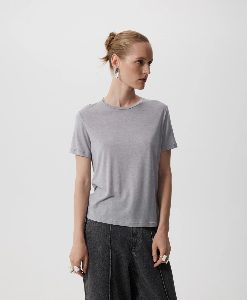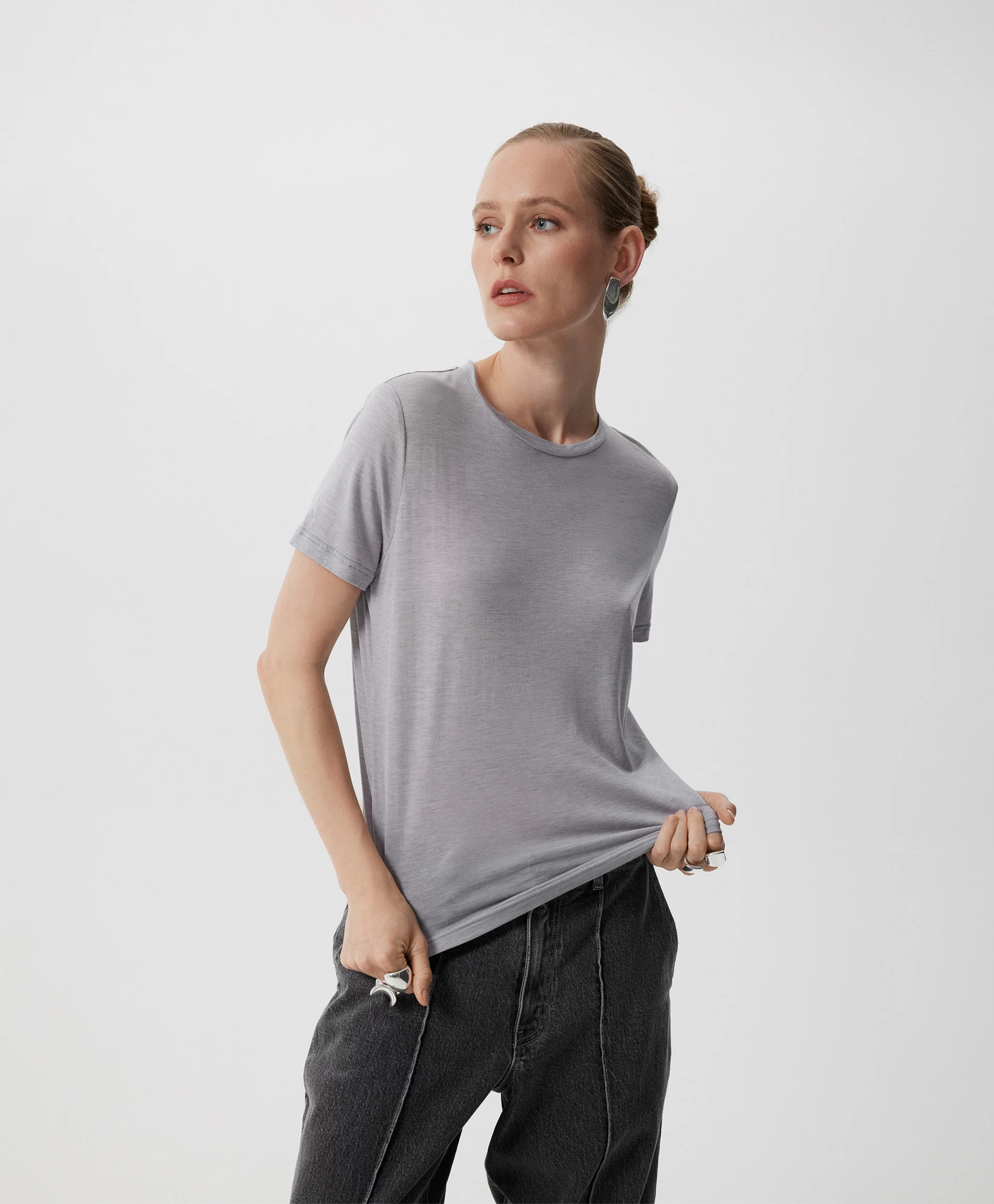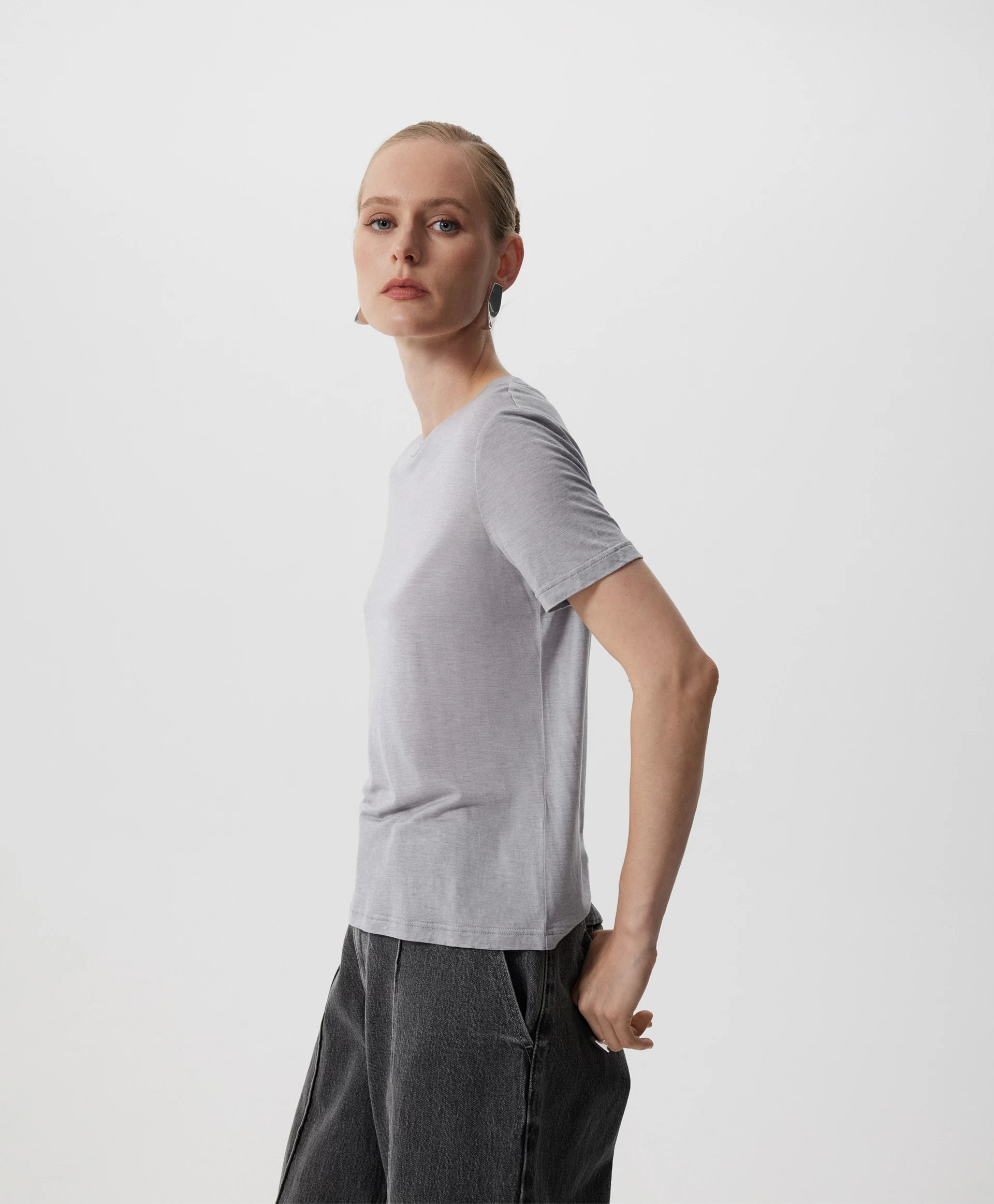 Тонкая футболка полуприлегающего силуэта — необходимый первый слой для создания многослойных комплектов. Прекрасный состав с преобладанием лиоцелла (разновидность вискозы) с шерстью гарантирует мягкость, пластичность, тактильный комфорт. Меланжевая структура трикотажного полотна наделяет футболку благородством сложного жемчужно-серого цвета, делает её идеальной основой образов в ахроматической гамме и не только.