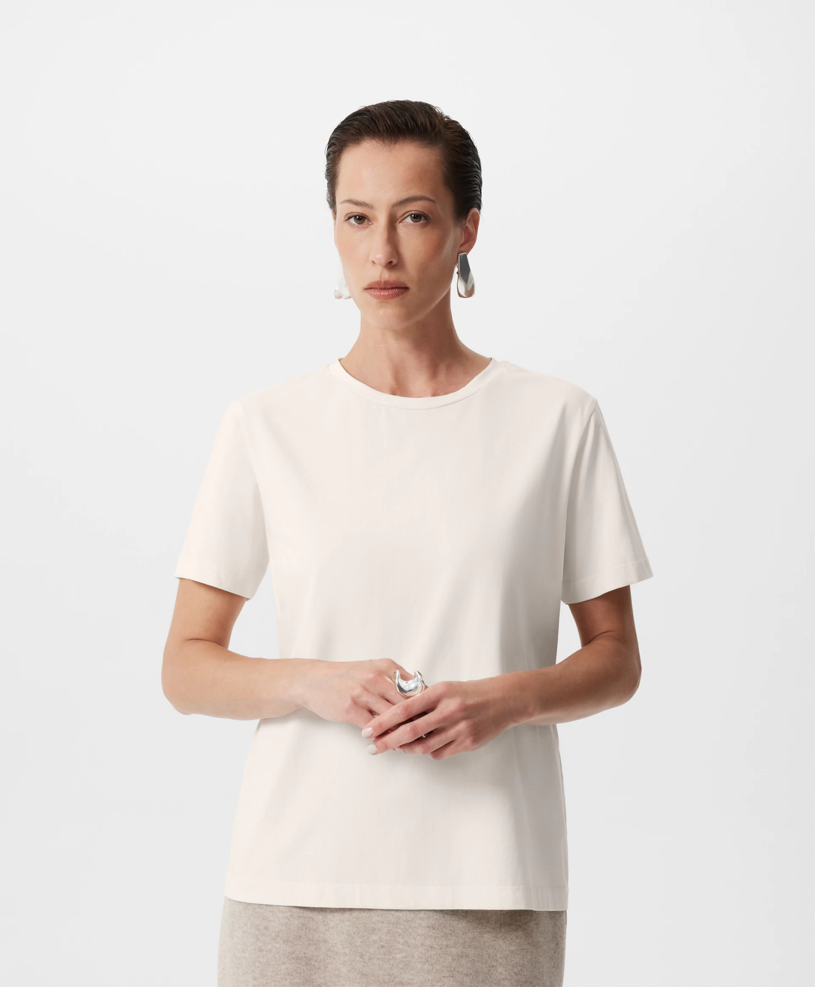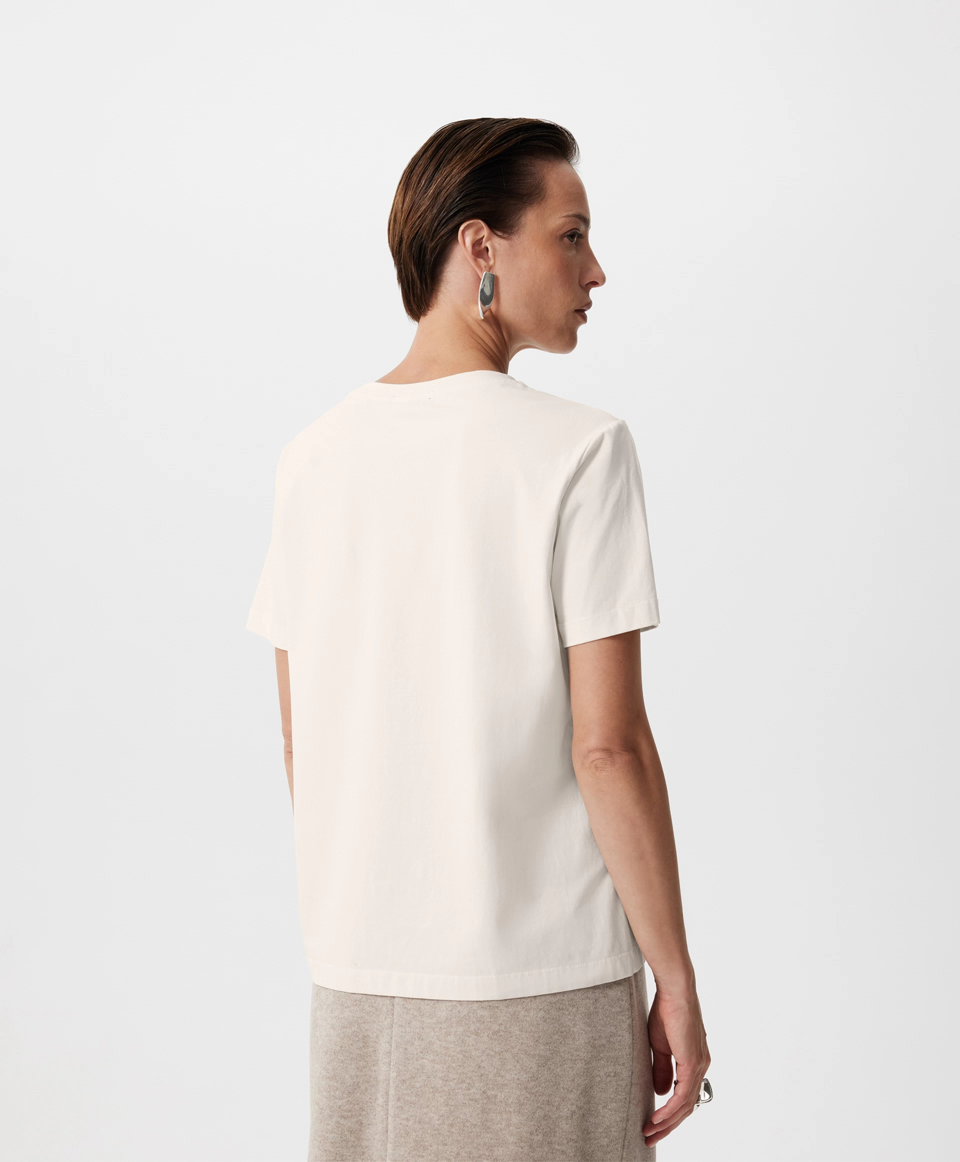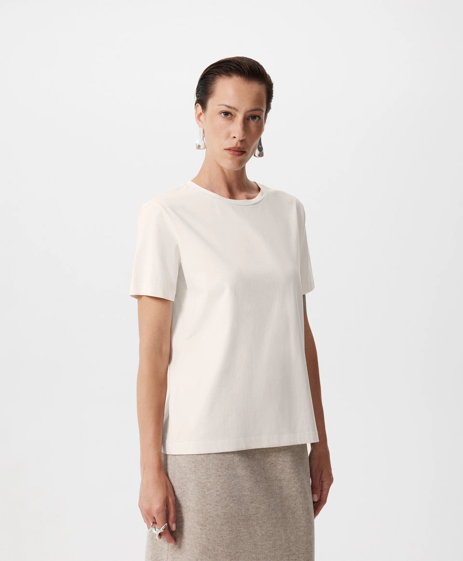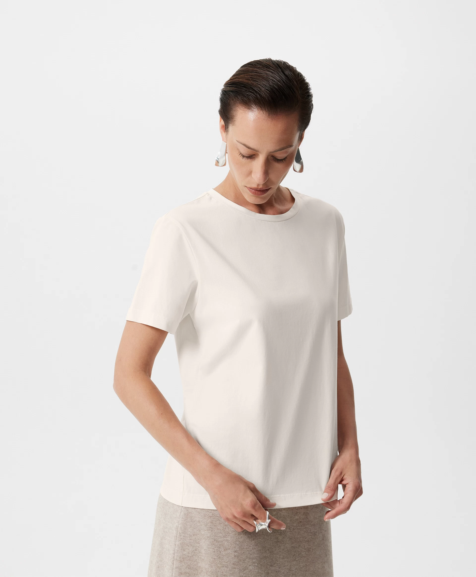 Футболка с коротким рукавом прямой свободной формы — необходимая базовая вещь, основа многослойных комплектов. Прекрасный состав с преобладанием хлопка с эластаном гарантирует мягкость, пластичность, тактильный комфорт. Благородный молочный цвет, освежающий контрастное цветовое сочетание и усиливающий концептуальность монохромного решения, делает футболку универсальной, отвечающей всем требованиям лаконичного, элегантного, умного гардероба.