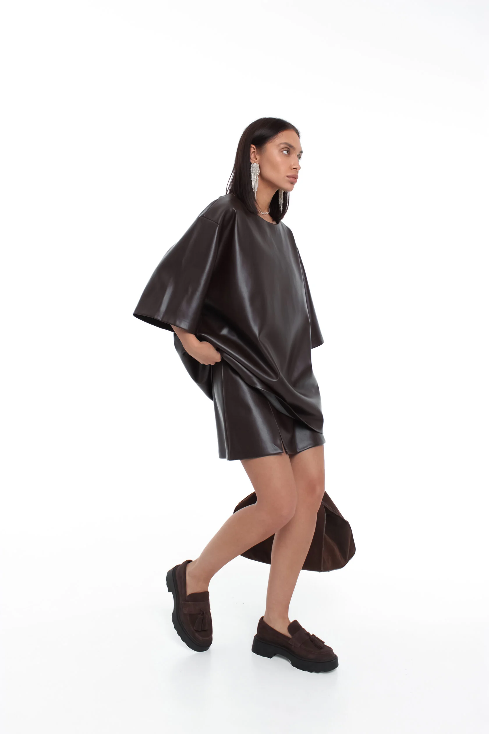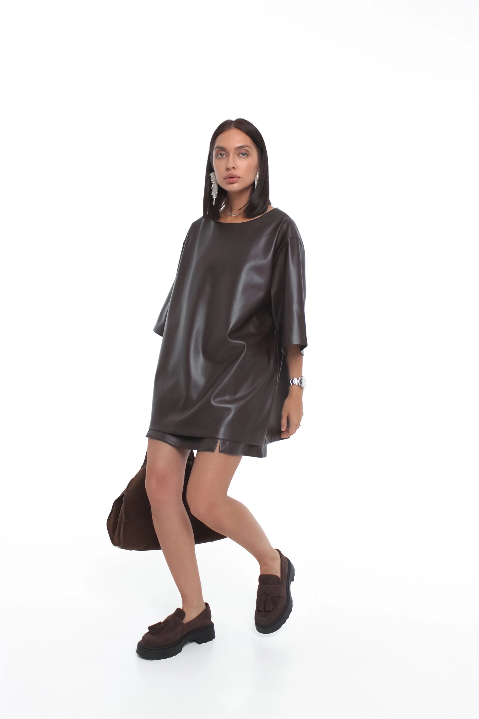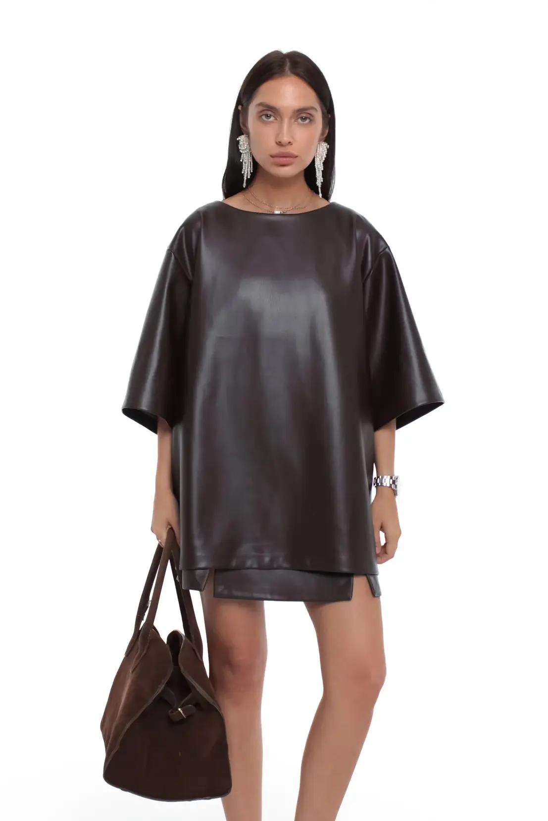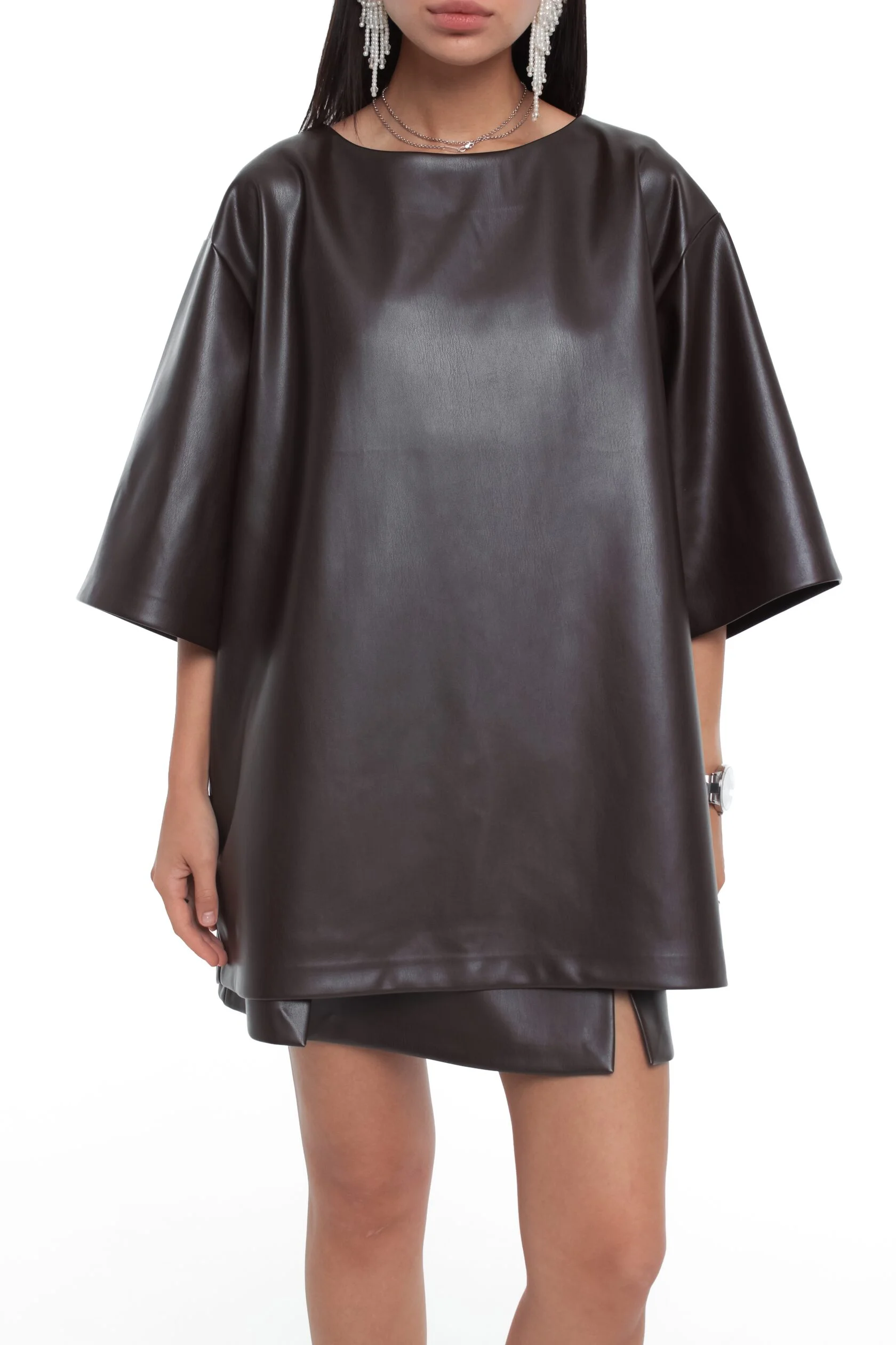 Футболка оверсайз из мягкой экокожи. База на каждый день которую легко стилизовать. С изнанки мягкая и очень приятная к телу замша, благодаря этому изделие можно отпаривать и даже гладить на низкой температуре с изнаночной стороны