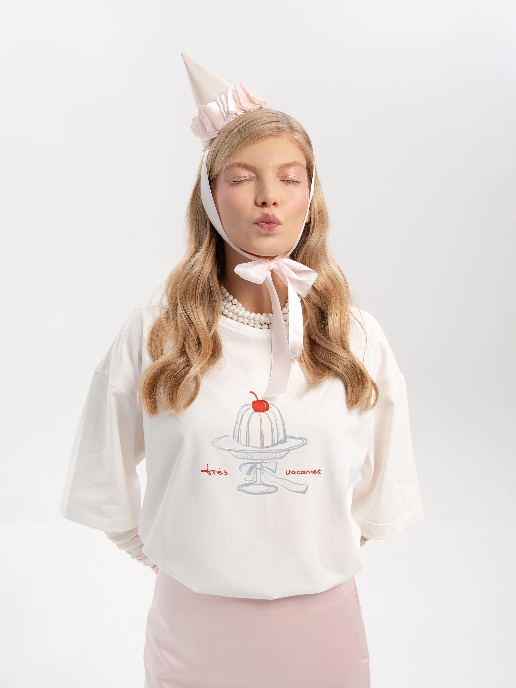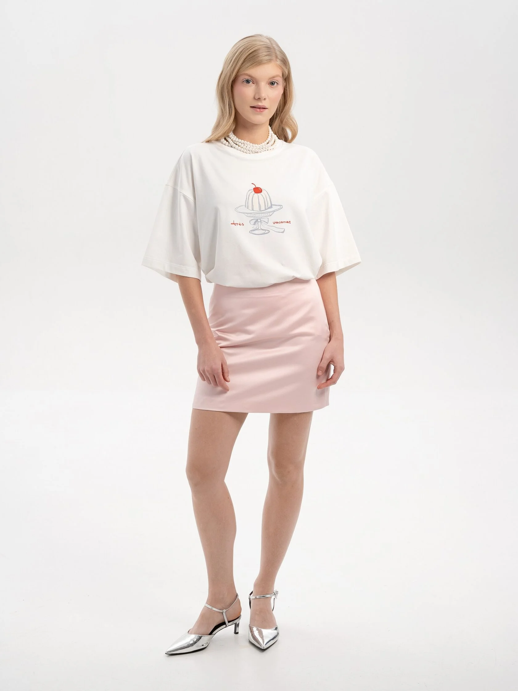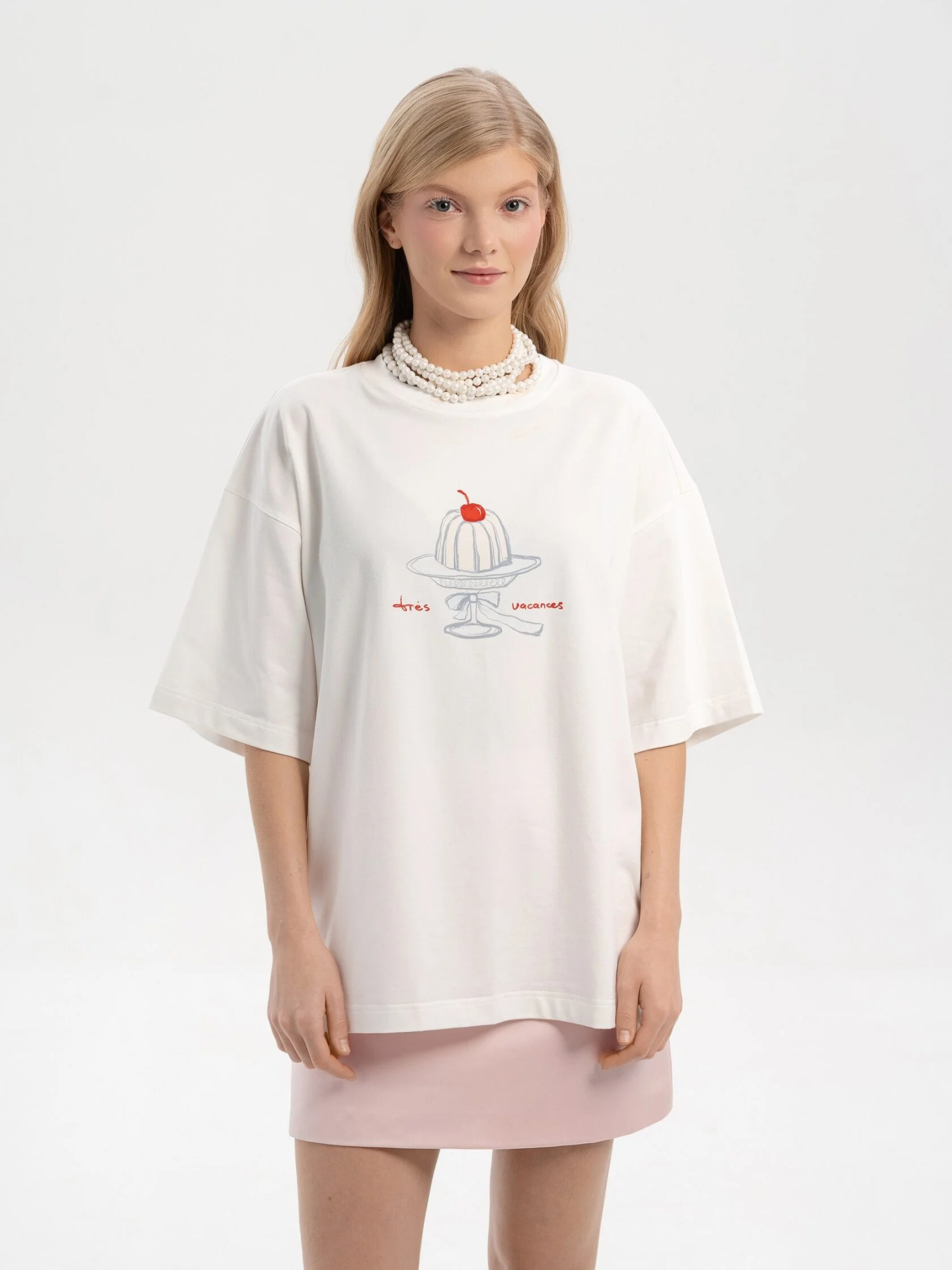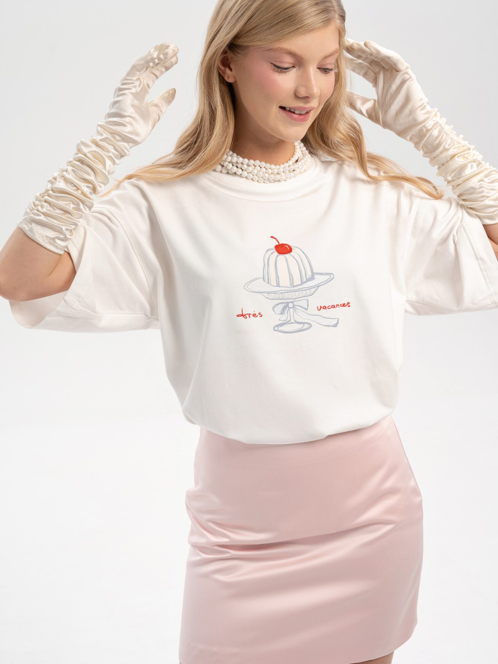 Молочная футболка с принтом в винтажном стиле – легкая и ироничная деталь, которая сделает образ более выразительным. Она создает настроение домашнего тепла и сладких праздничных ритуалов. Подходит для расслабленных выходных, уютных встреч с друзьями и многослойных комбинаций с кардиганами и жакетами.