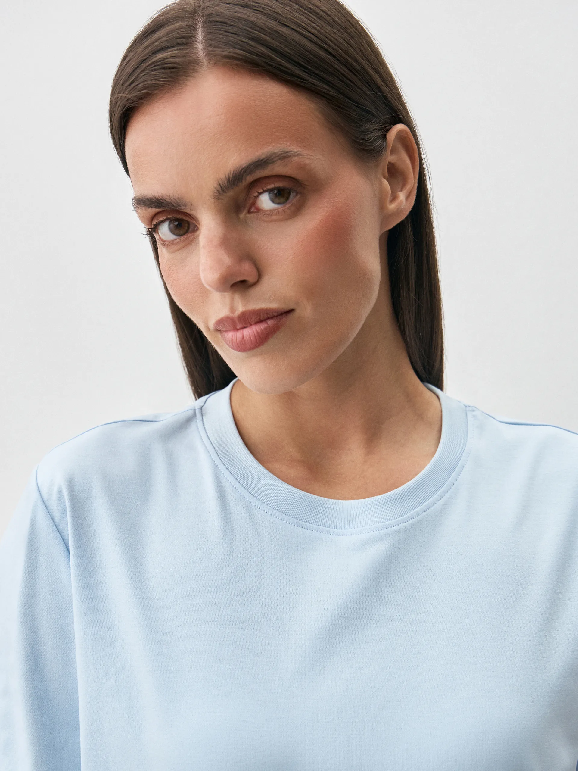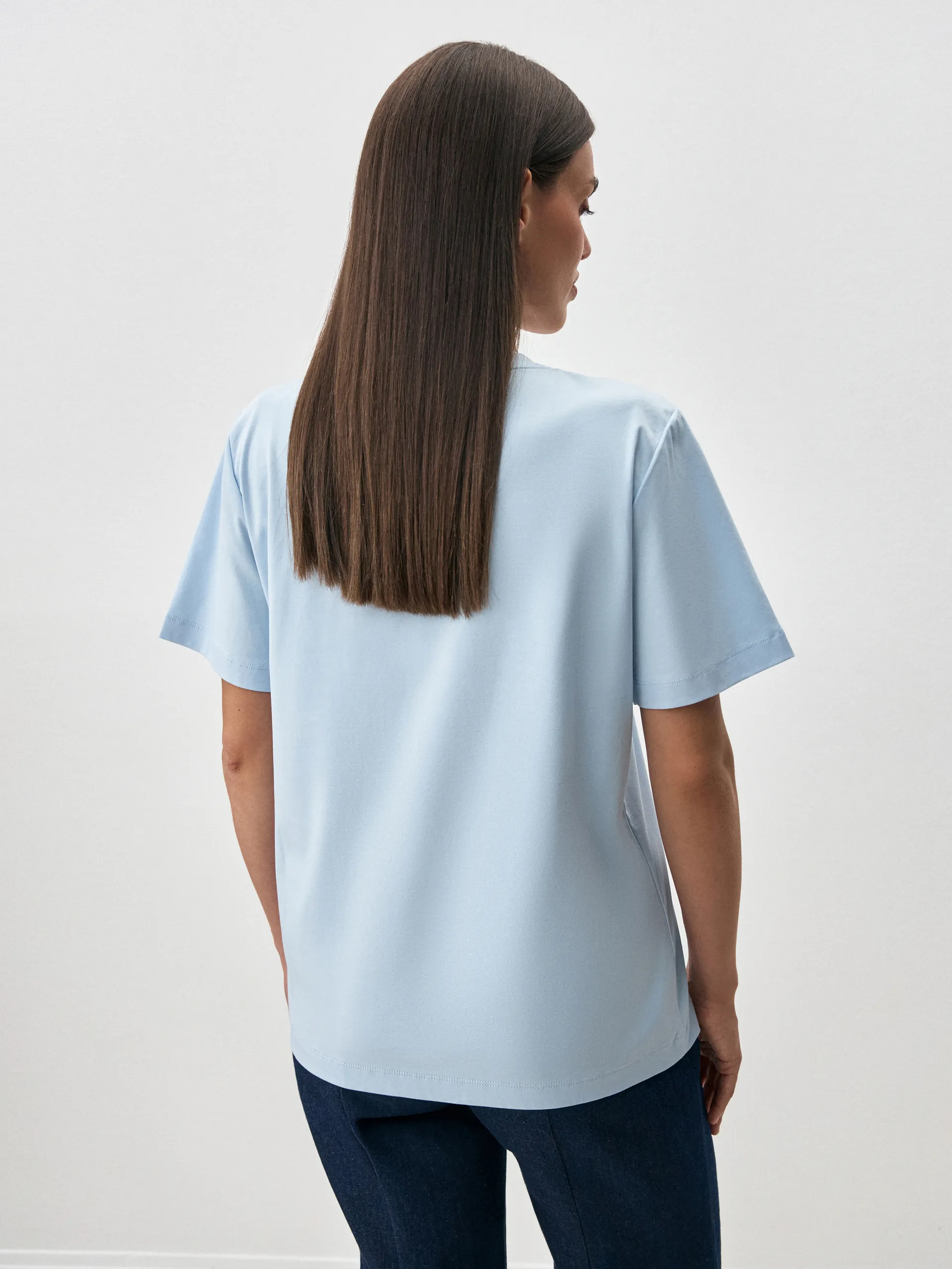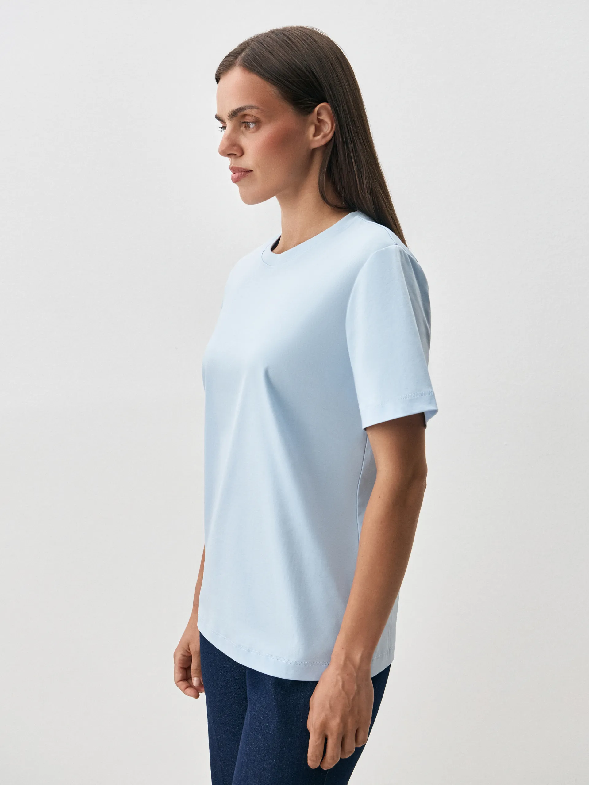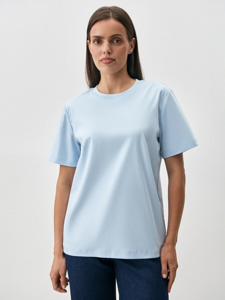 Футболка Seven. Футболка из 100% хлопка умеренного объёма с посадкой слегка слим — повторяет силуэт, подчёркивая фигуру, но не стесняет движений и не прилипает к телу. Универсальная и комфортная, она идеально подходит для ношения под жакеты и станет базой для множества образов.