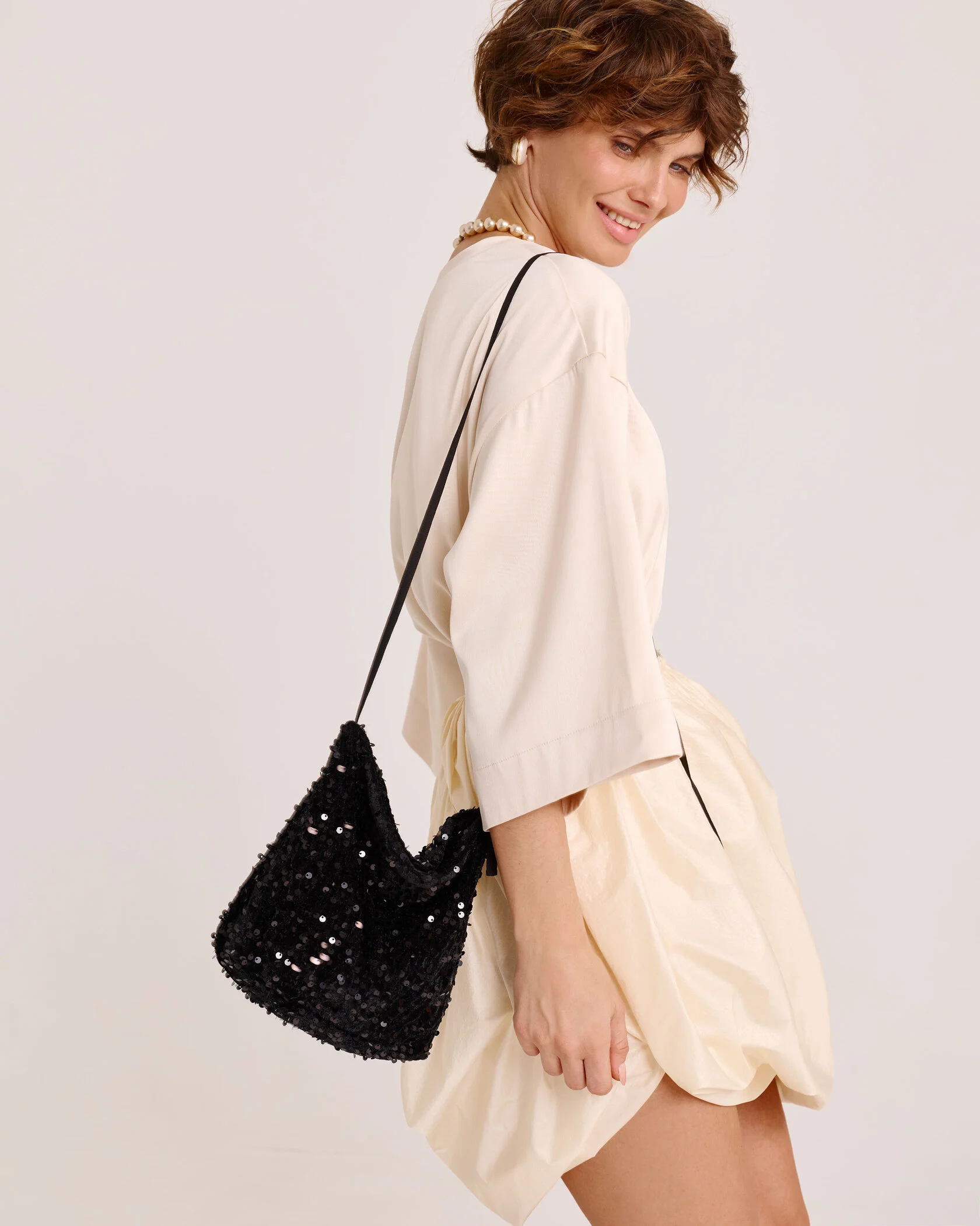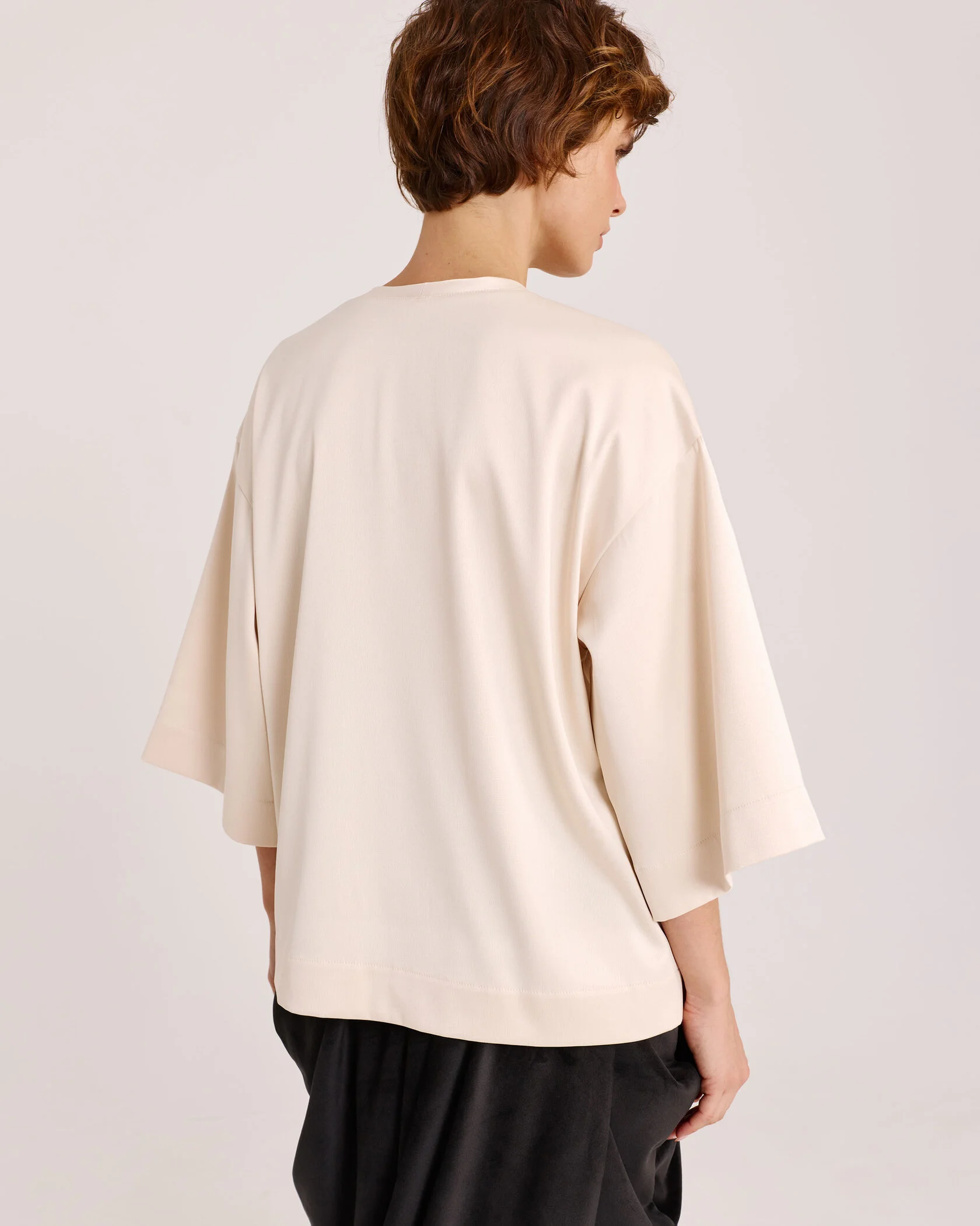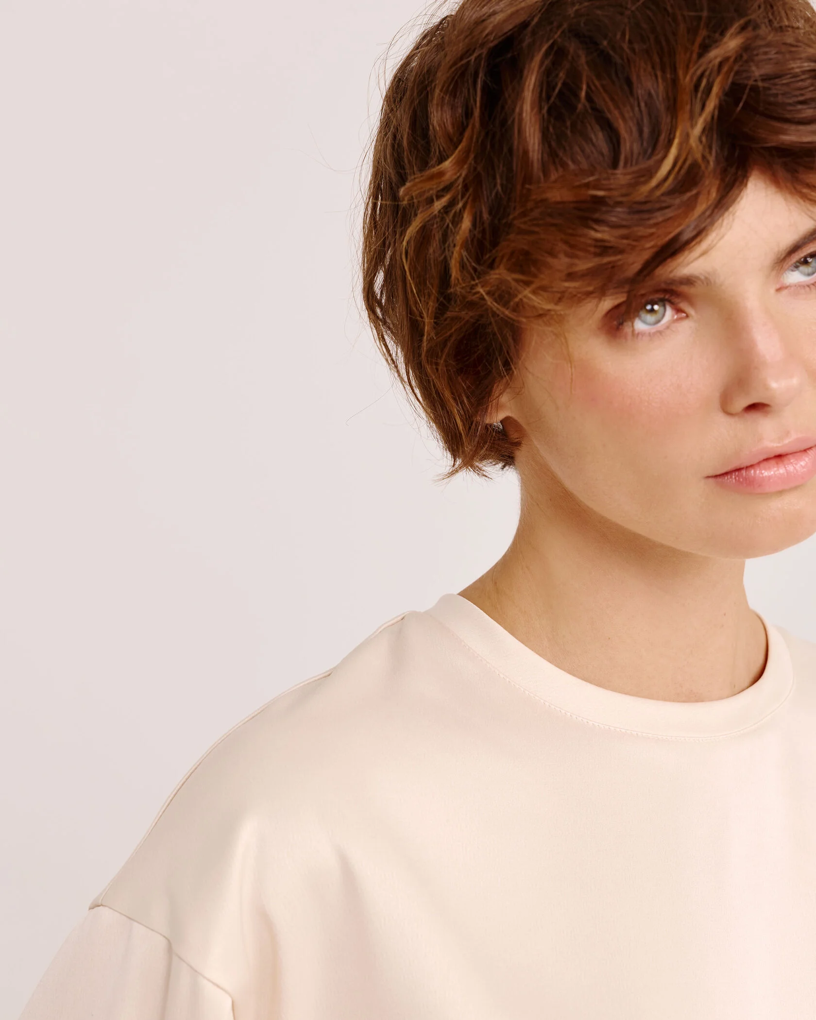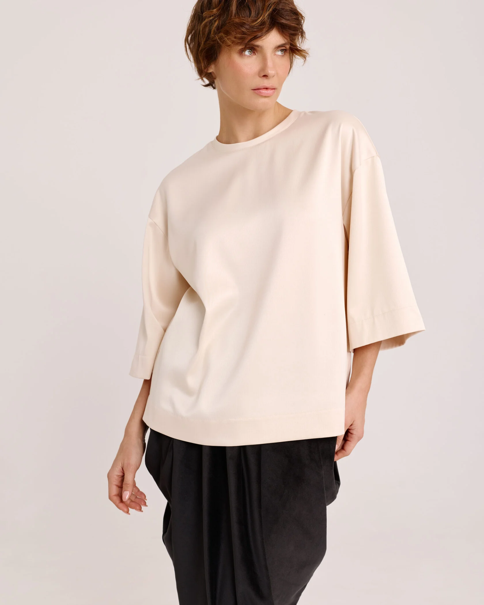 Один из самых функциональных элементов гардероба – футболка – может стать лучше только по одной причине: если создать футболку из другого материала. Дизайнеры бренда использовали струящийся томный атлас в жемчужном оттенке, чтобы привнести в привычный и комфортный крой повседневности лёгкого шика, игривости и женственности.