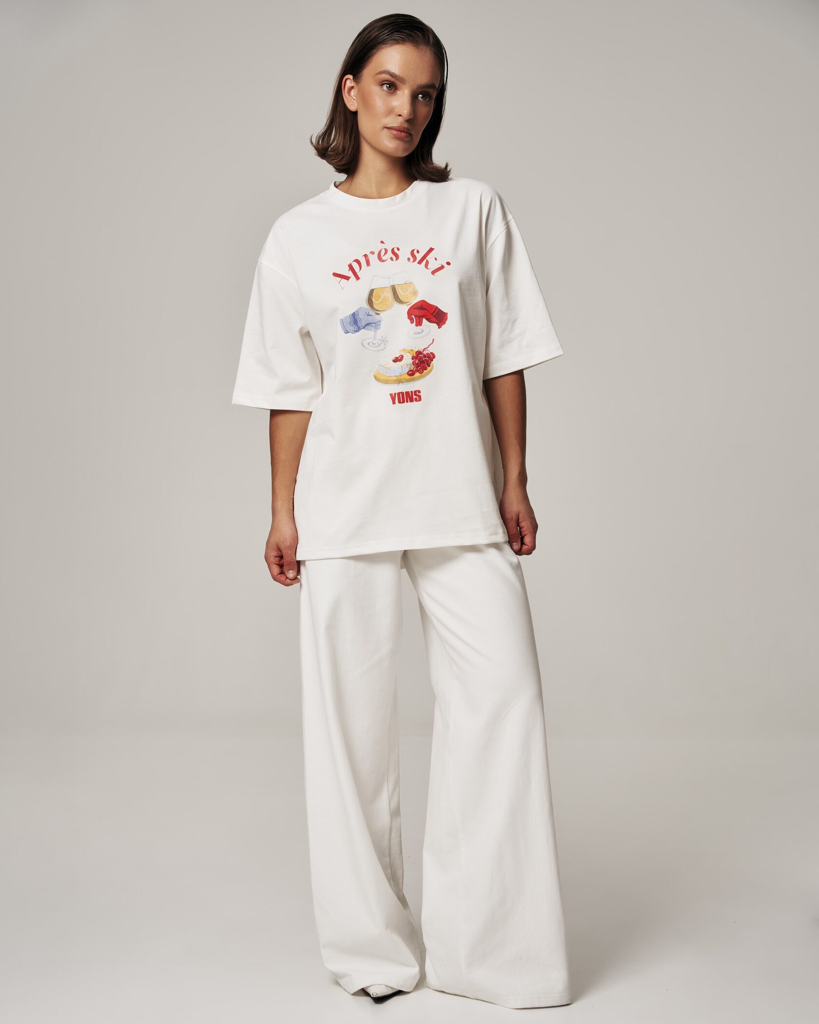 Молочно‑белая футболка с ярким тематическим принтом «Après ski» — стильный и комфортный базовый предмет гардероба в расслабленном оверсайз‑крое
