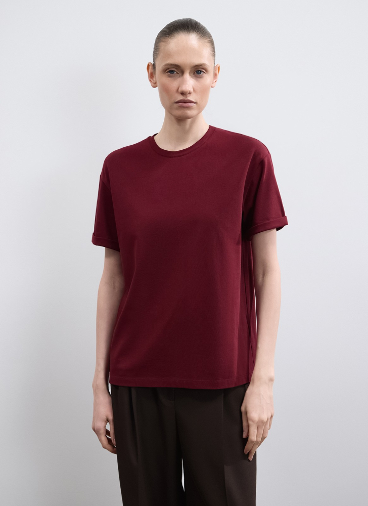 Футболка идеально сочетается с широкими джинсами и юбками.