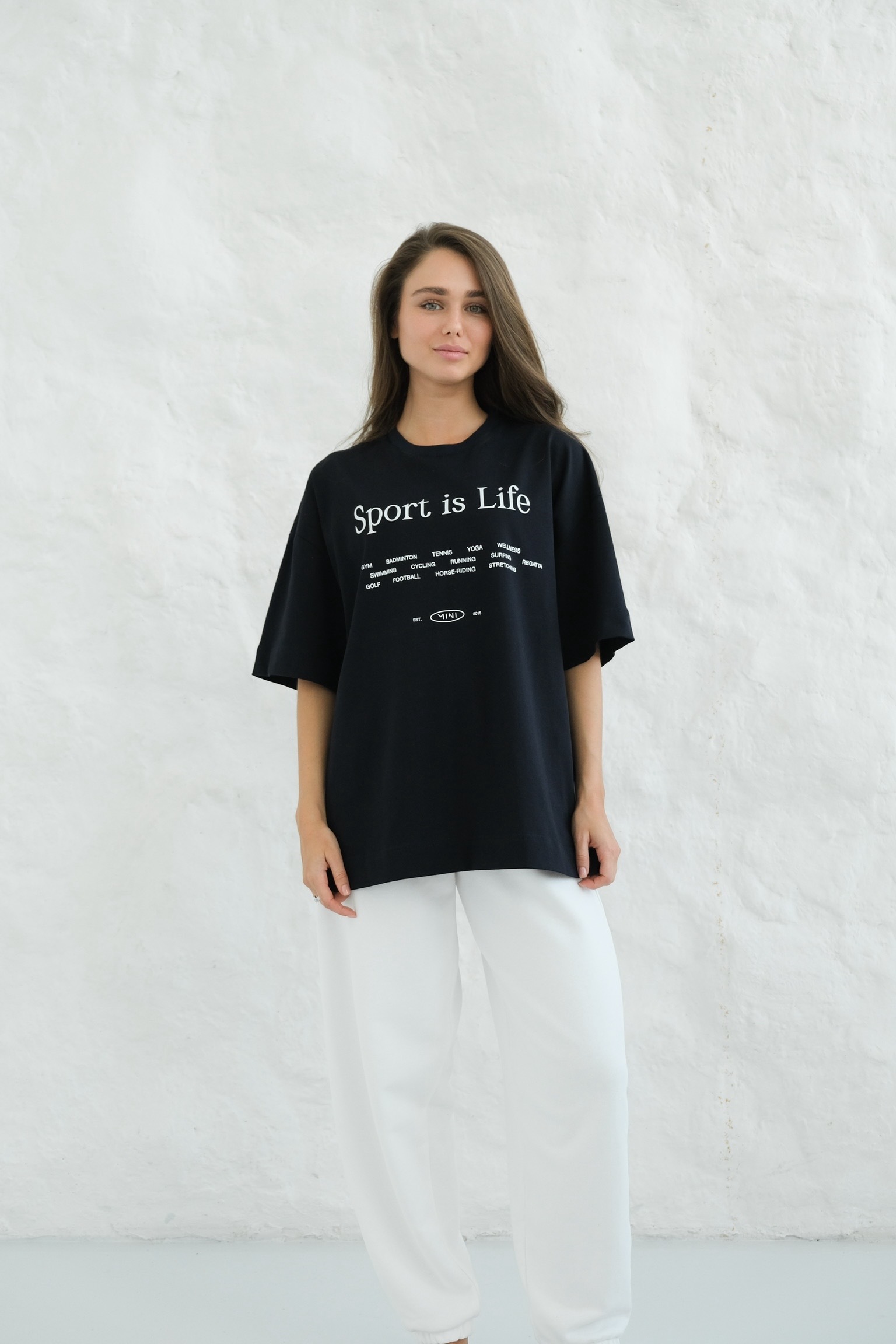 Футболка объемная, кроя oversize, со спущенной линией плеча, с принтом на полочке.