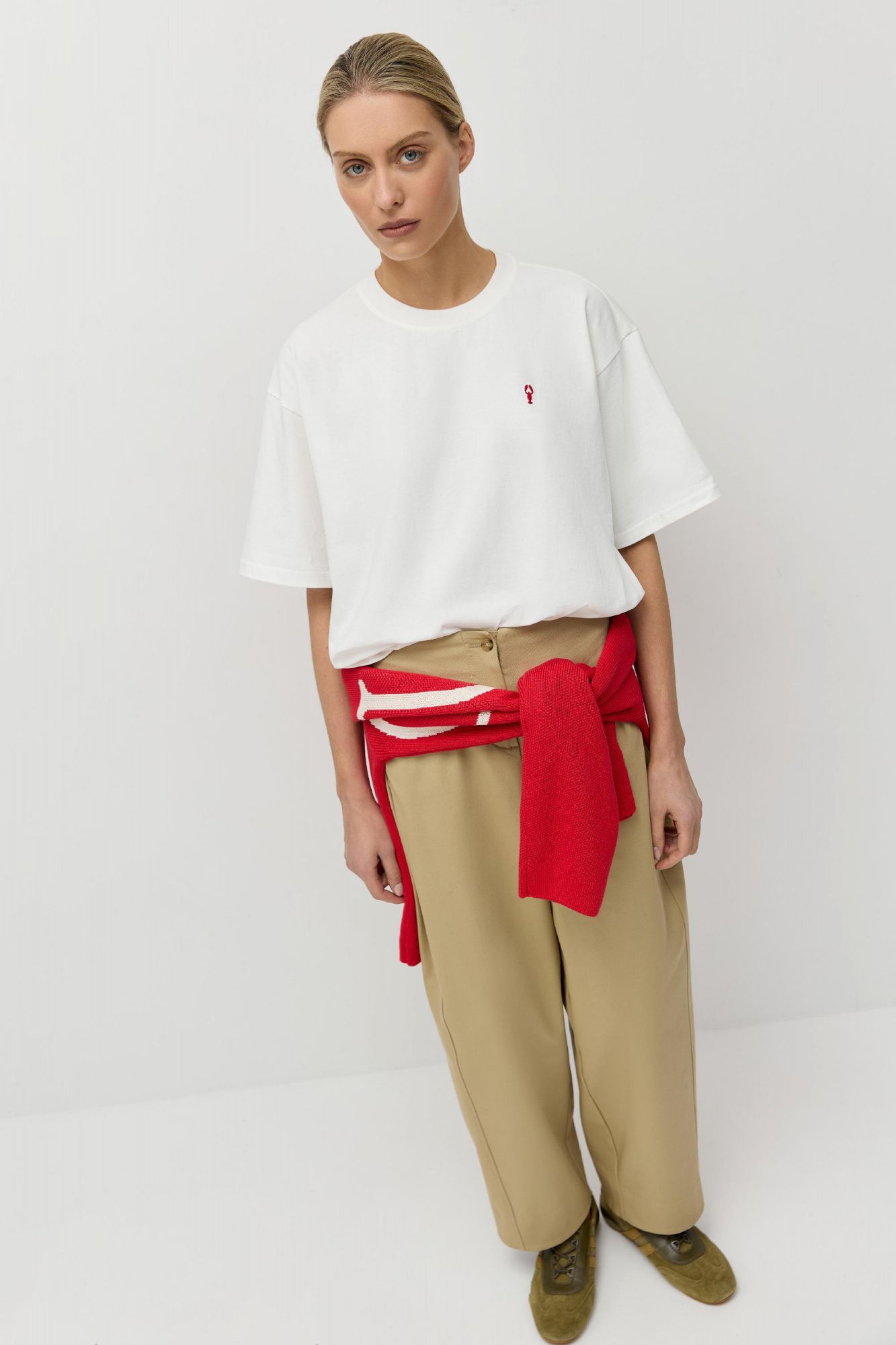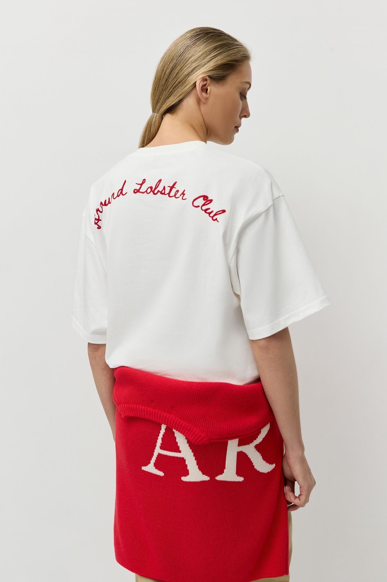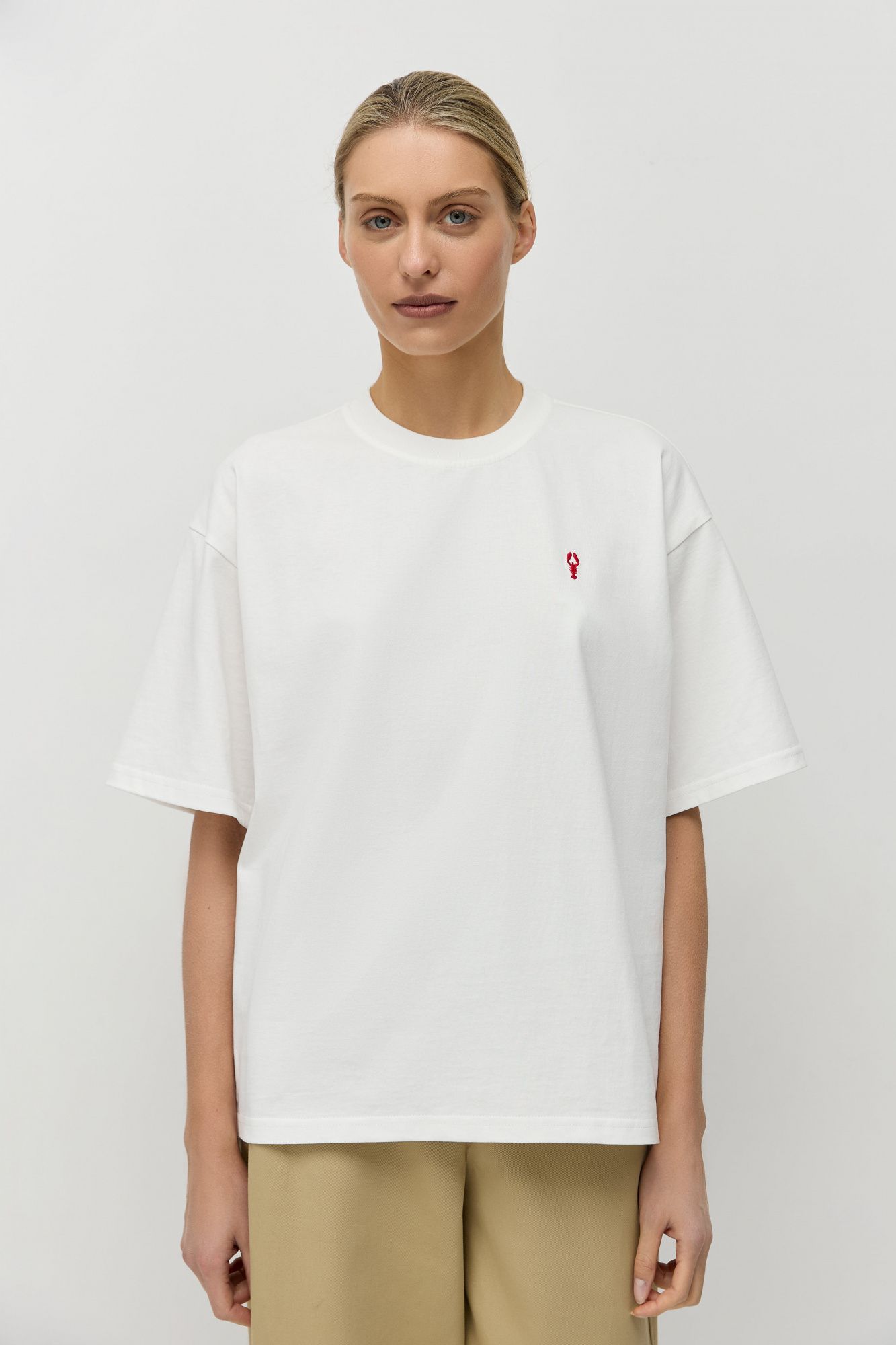 Спереди расположена машинная вышивка в форме лобстера. Сзади крупный печатный принт Around Lobster Crub, отражающий тему коллекции SS26, выполненый шелкографией водными красками — методом печати высокого качества.