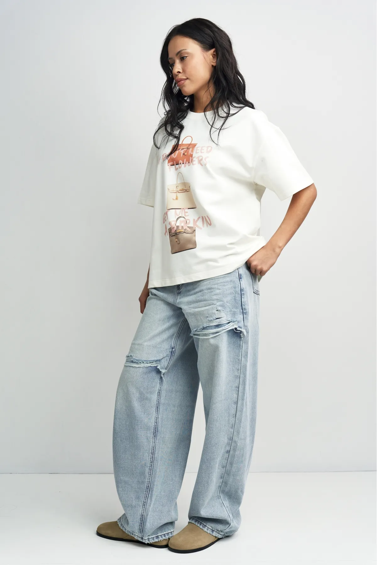 Материал не просвечивает и прекрасно дышит, обеспечивая комфорт в течение всего дня. Свободный силуэт оверсайз легко вписать в повседневные образы. Принт выполнен с помощью высокотехнологичной печати, а значит, изделие надолго сохранит свой безупречный вид.