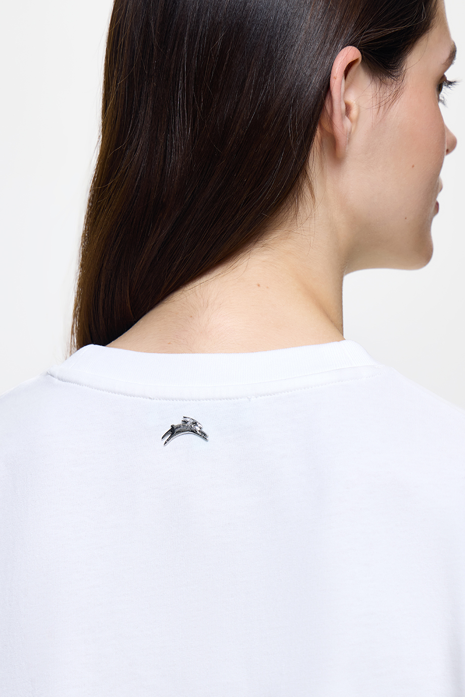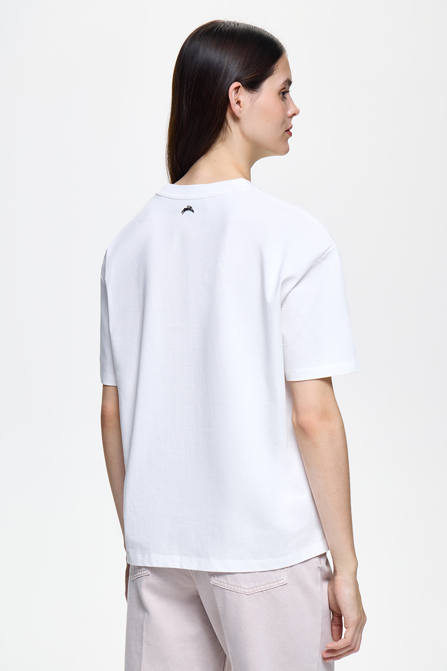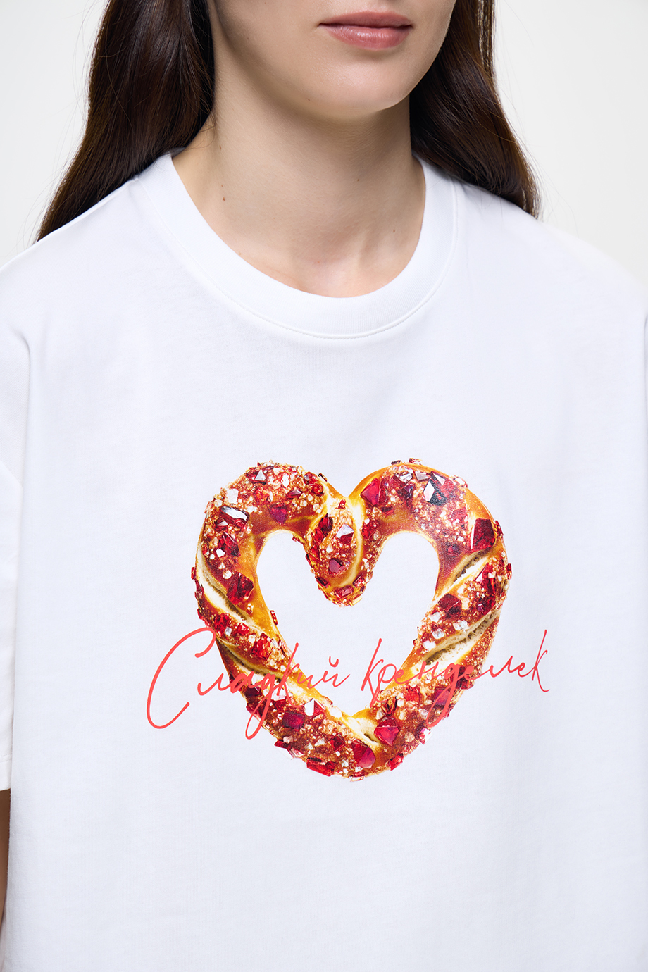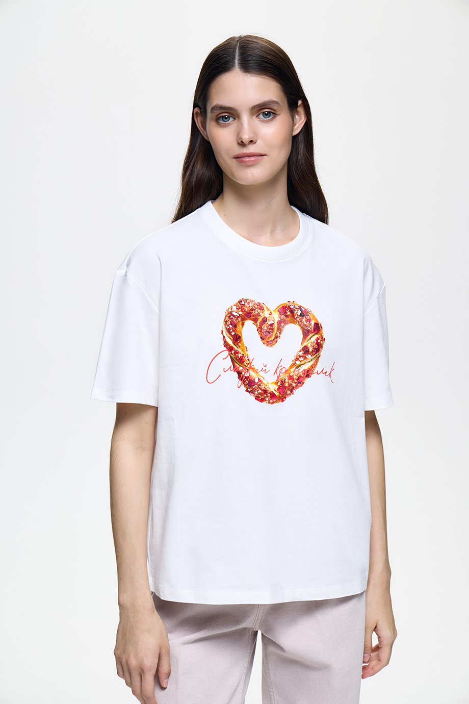 Белоснежная футболка с забавным тематическим принтом, разработанным для весенней коллекции бренда. Модель классического прямого силуэта выполнена из мягкого хлопка.