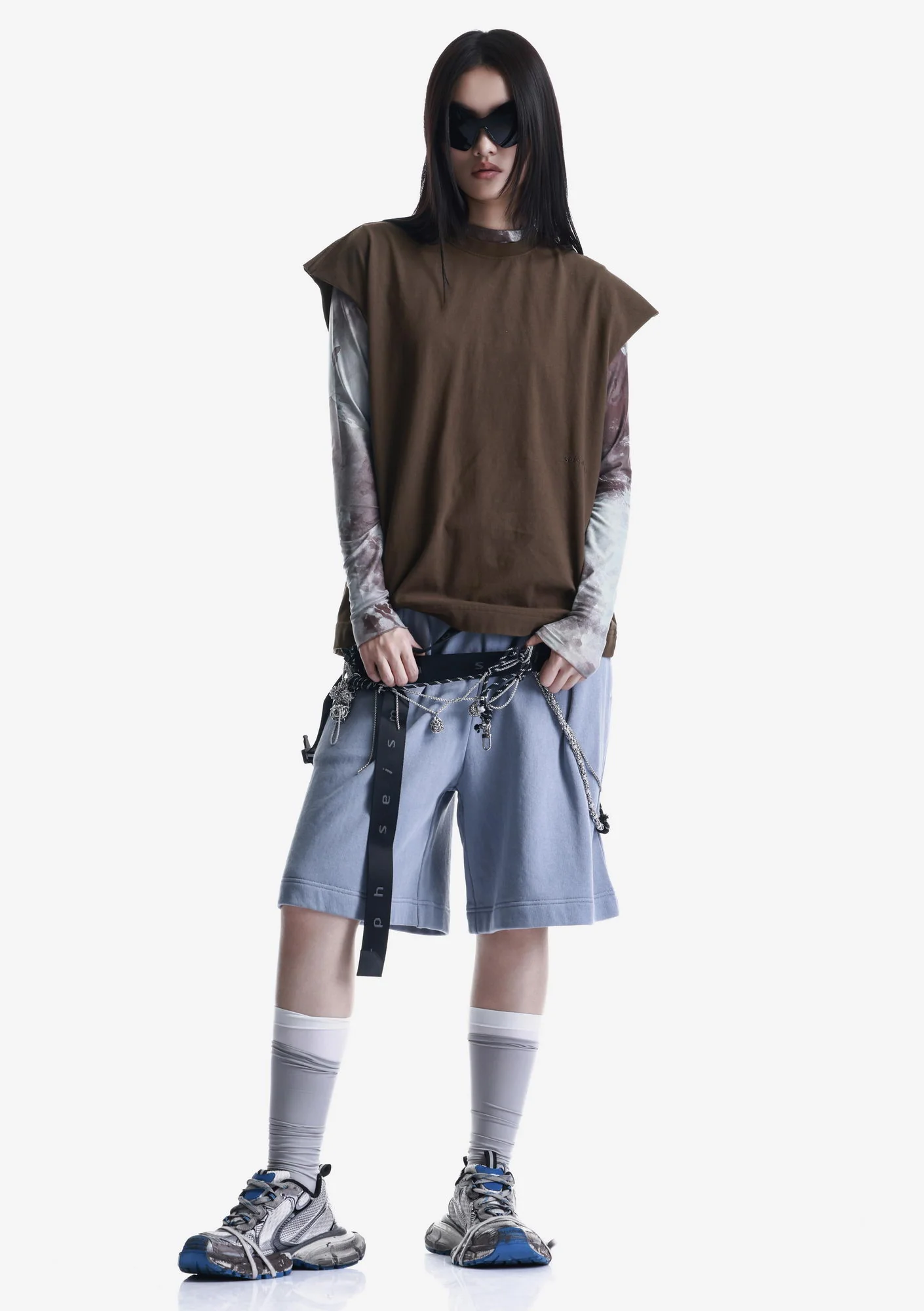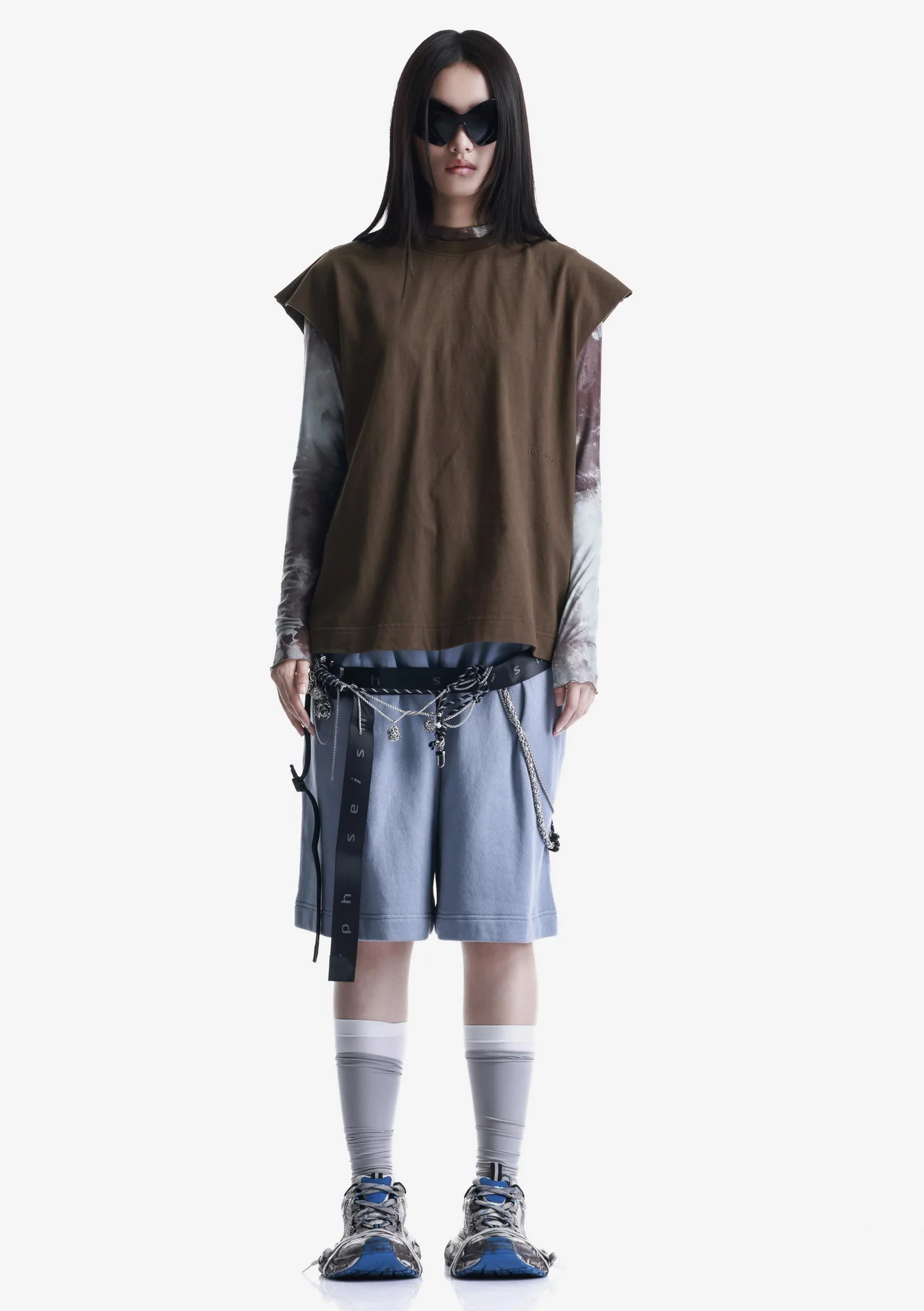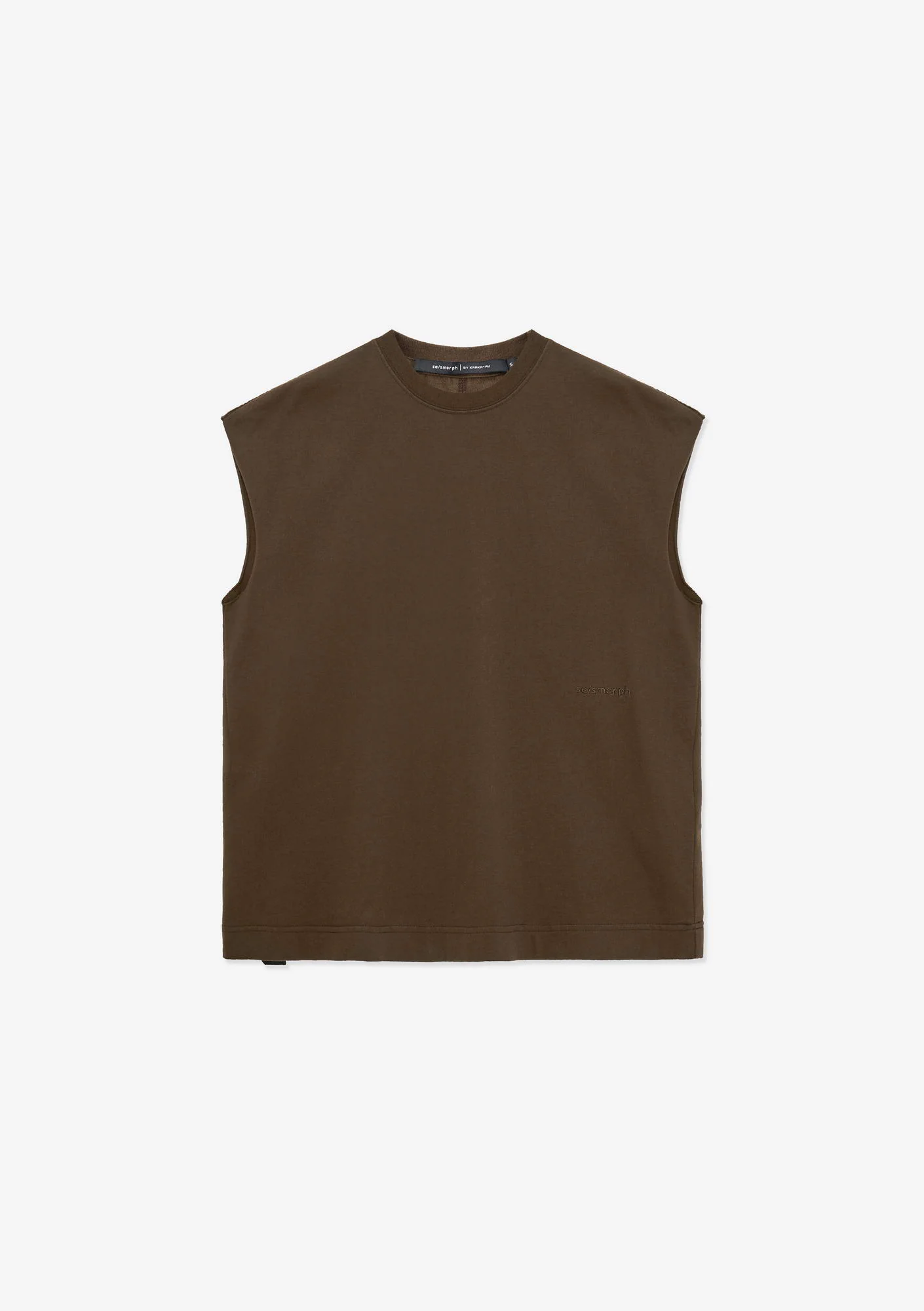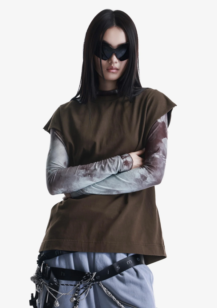 Футболка-безрукавка из мягкого хлопкового джерси с начёсом. Вышивка и открытый шов по центру спинки создают графичный акцент, необработанные проймы поддерживают свободный характер модели.