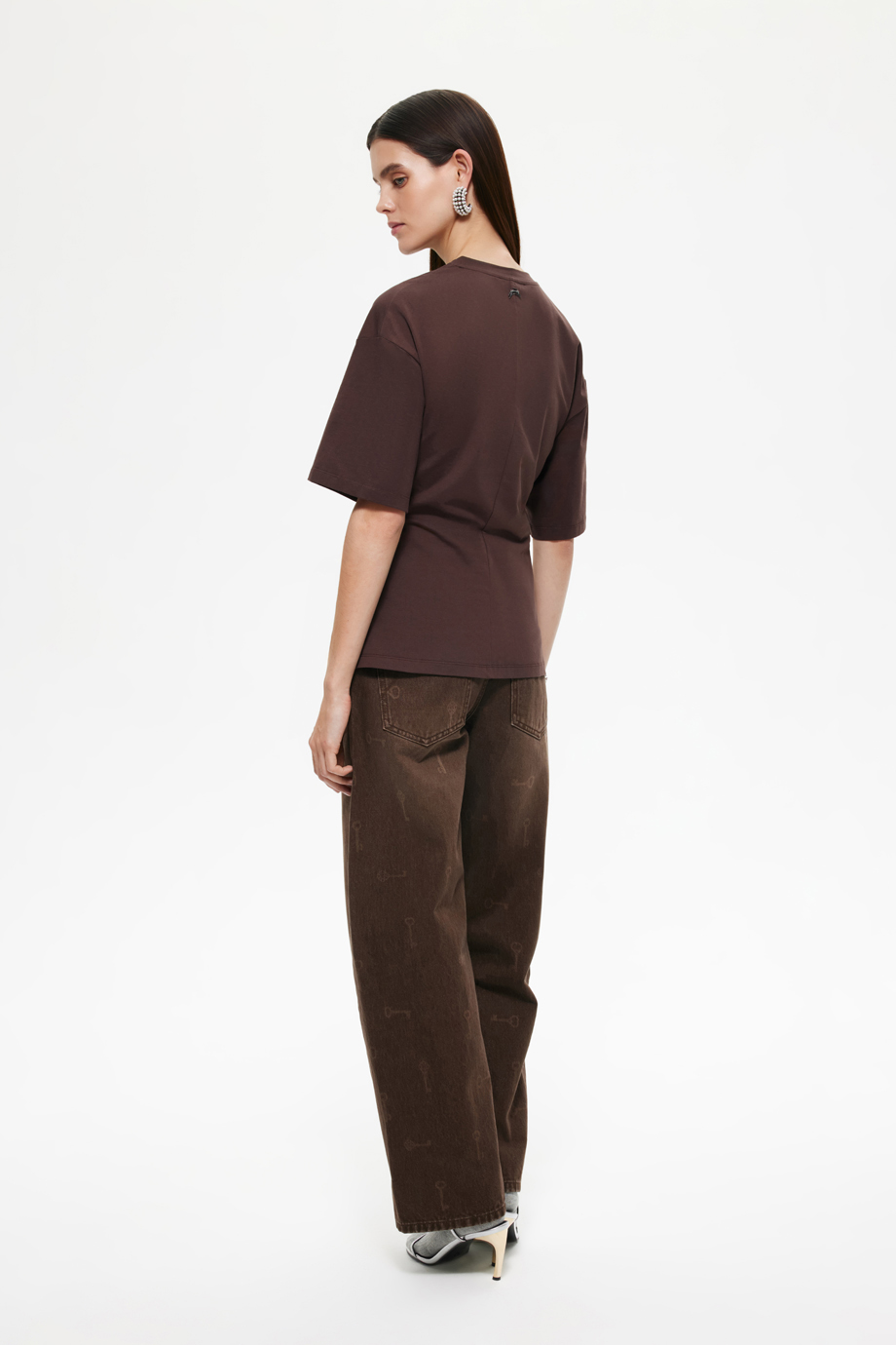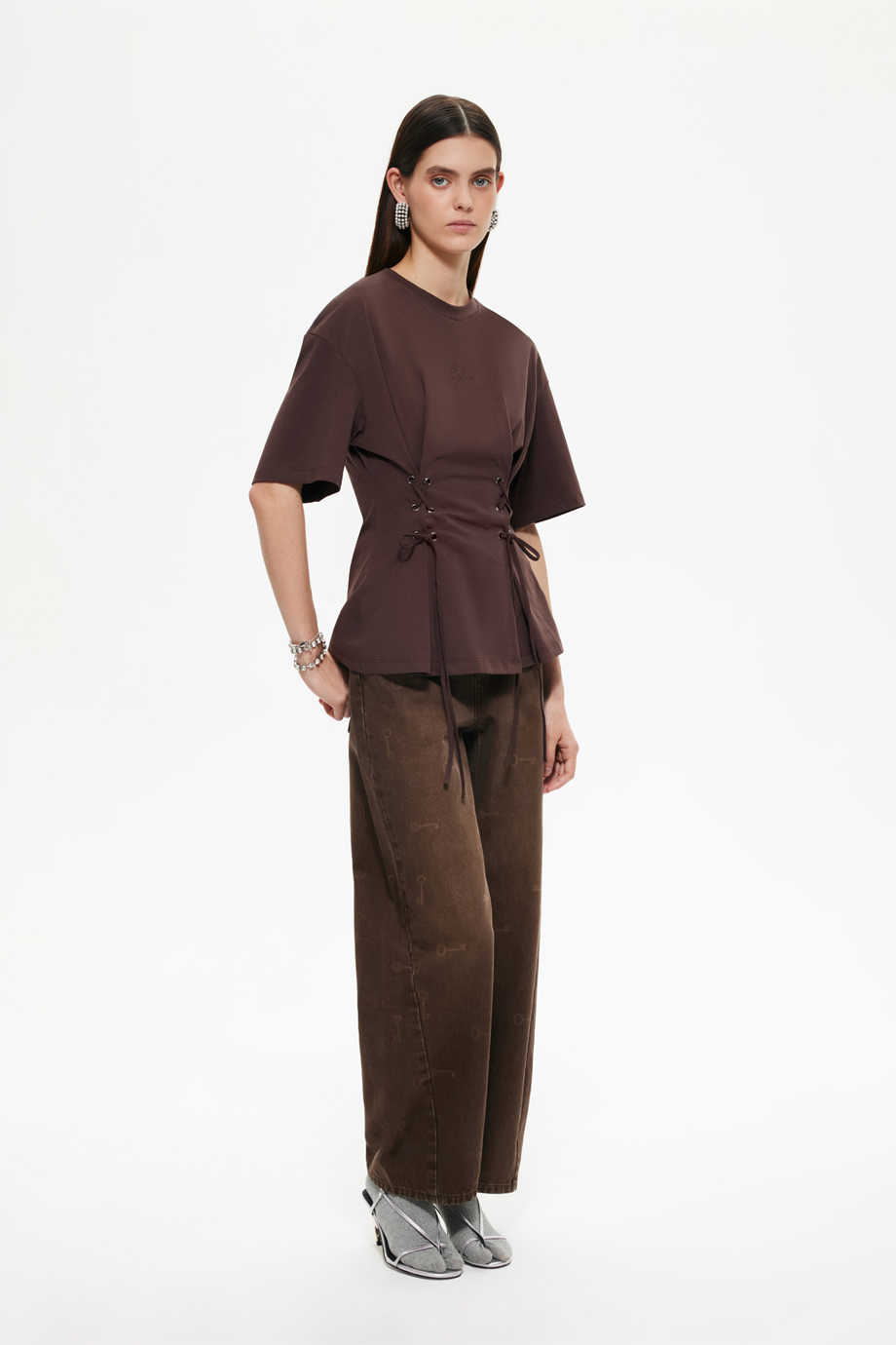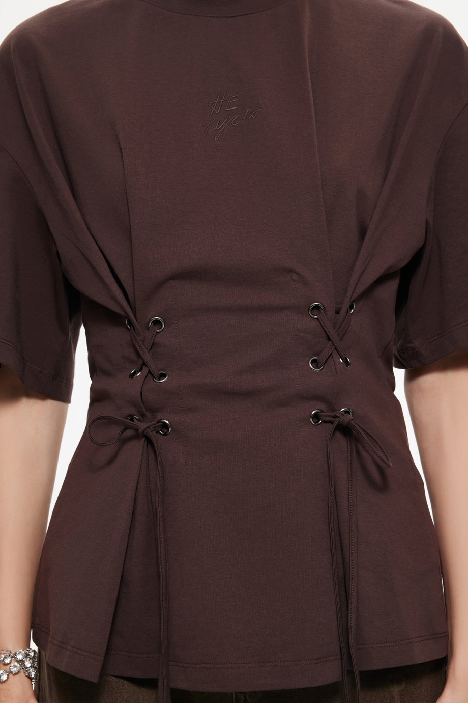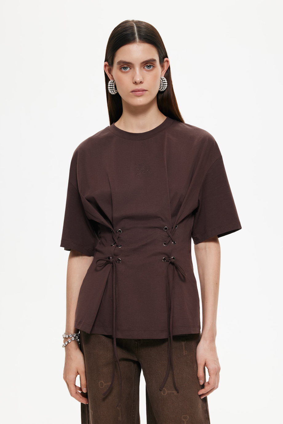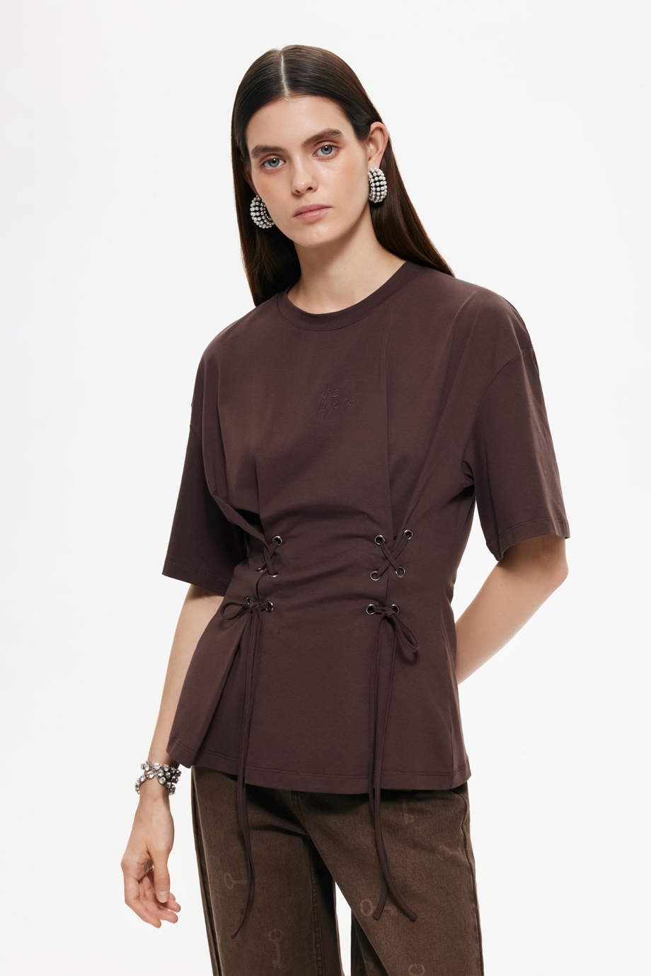 Стильная футболка со шнуровкой на талии — идеальный элемент гардероба для создания уникального образа. Коричневый цвет придаст вашему наряду теплоту и уют. Футболка отлично подойдёт для повседневного ношения, сочетая комфорт и модный дизайн.