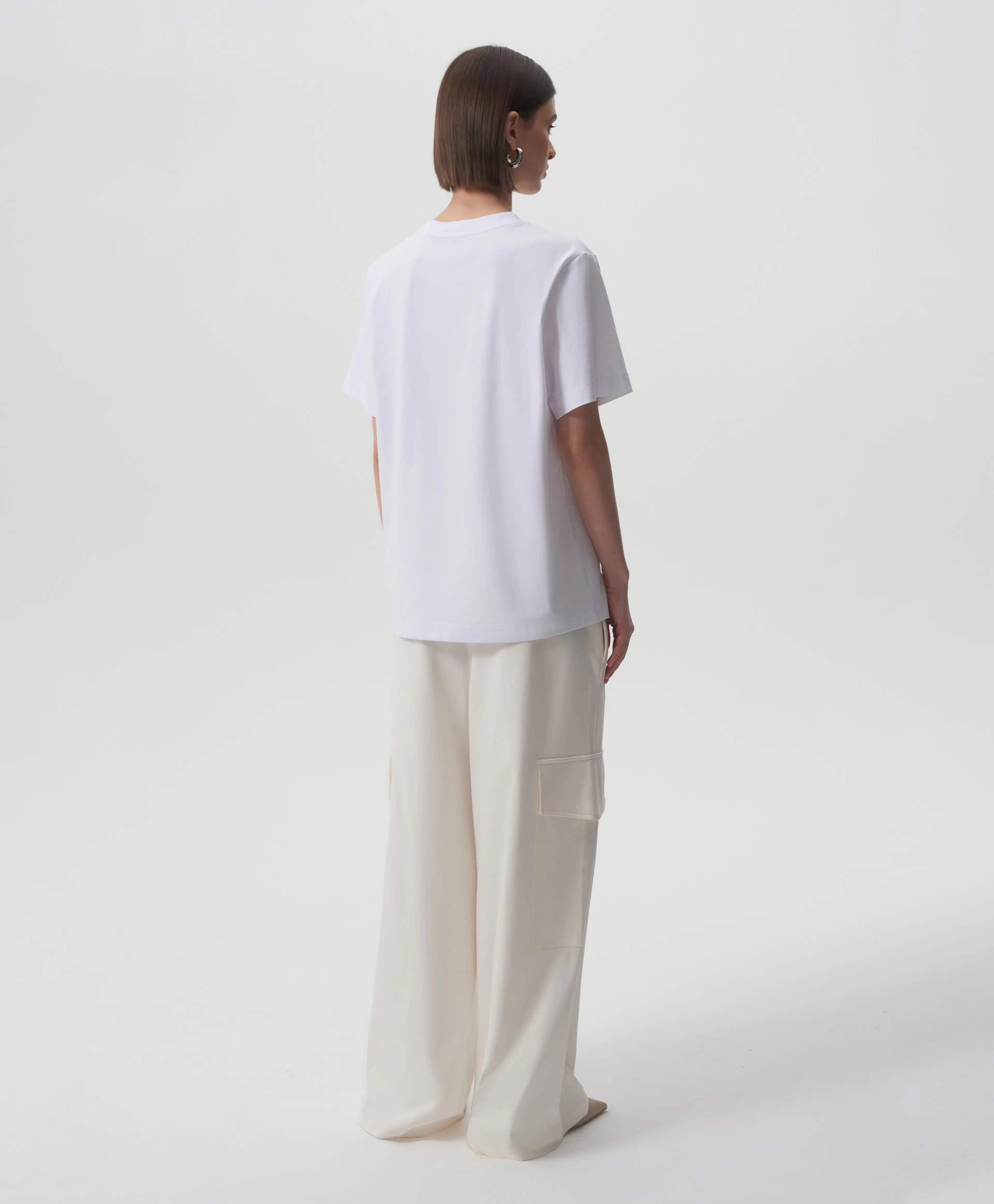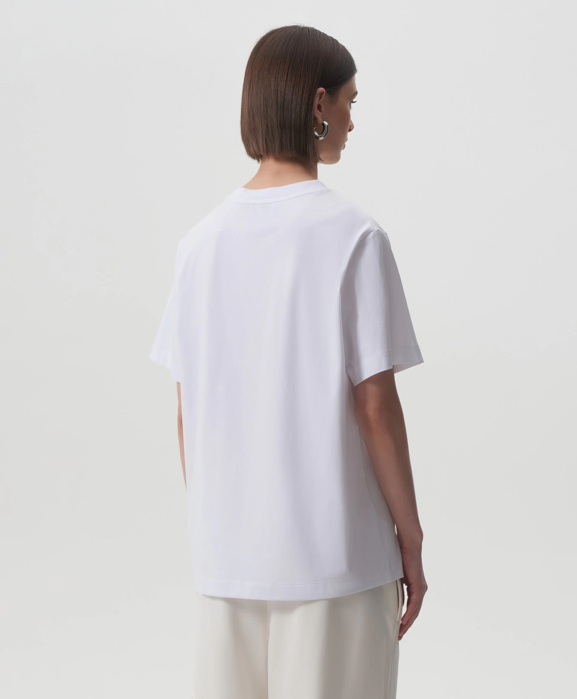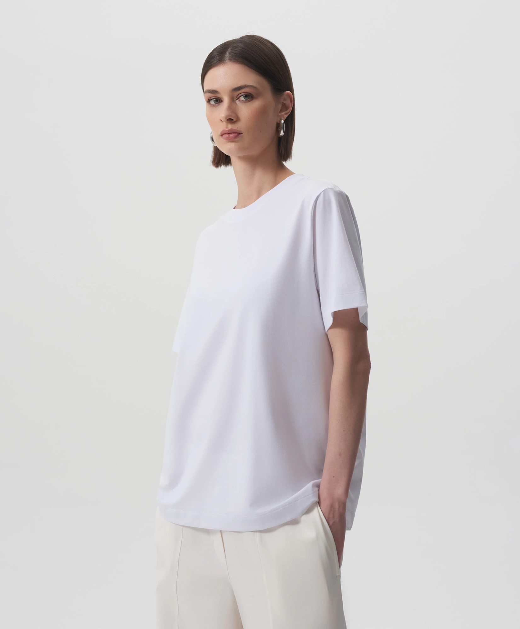 Белая футболка с коротким рукавом - идеальная базовая вещь, совместимая с любым гардеробом и образом жизни. Силуэт умеренный оверсайз, О-образная горловина, мягкий пластичный трикотаж высочайшего качества делают футболку образцом изделия из разряда необходимости.