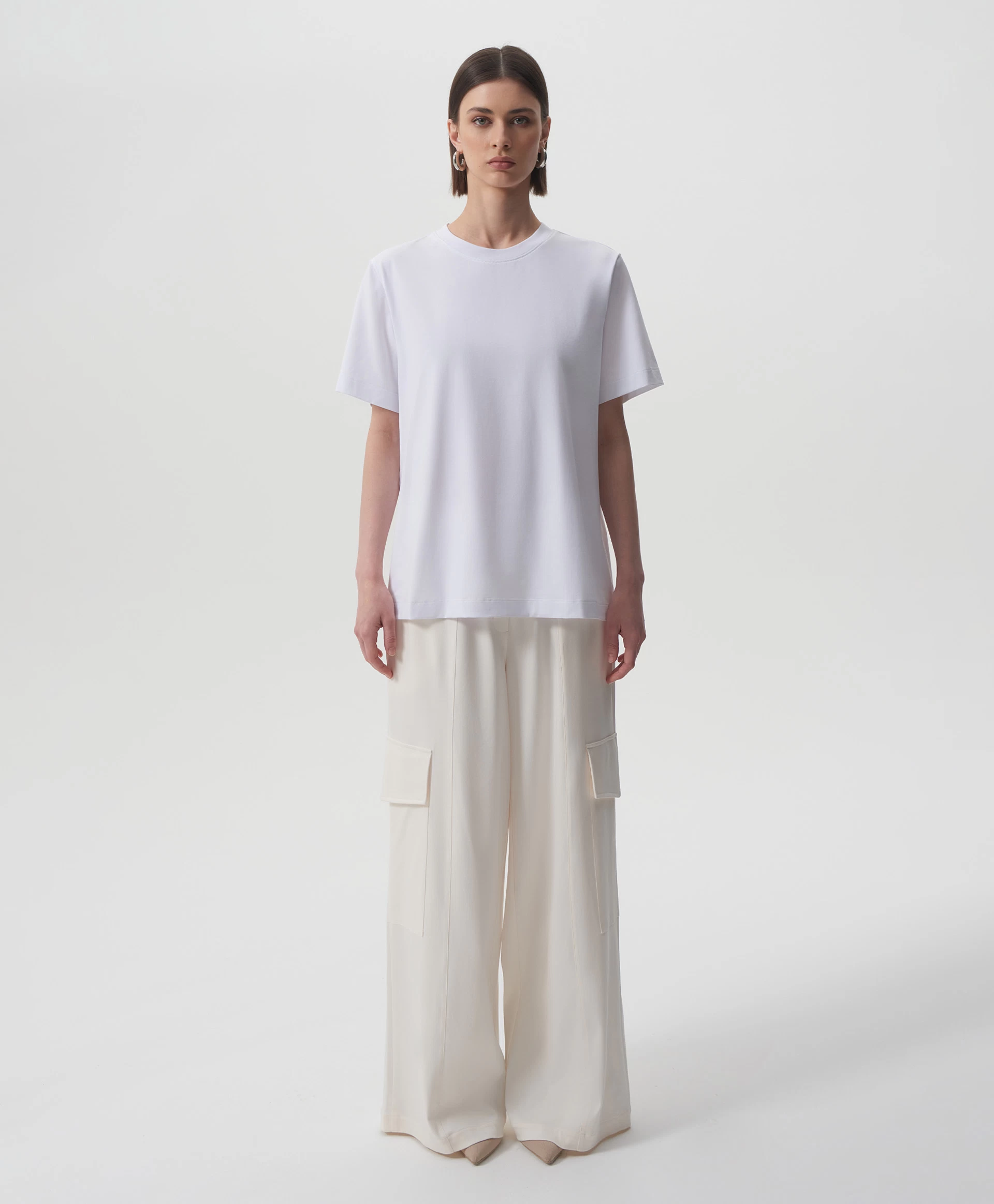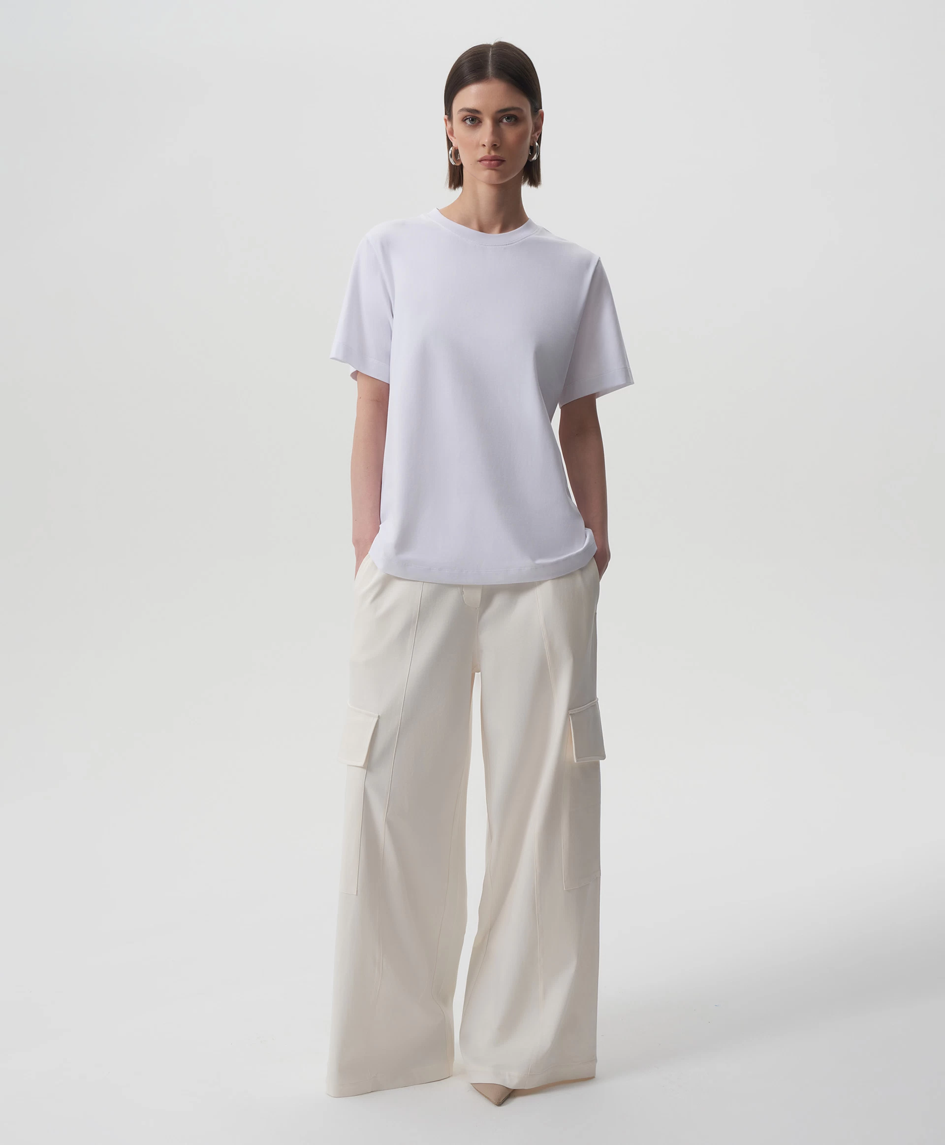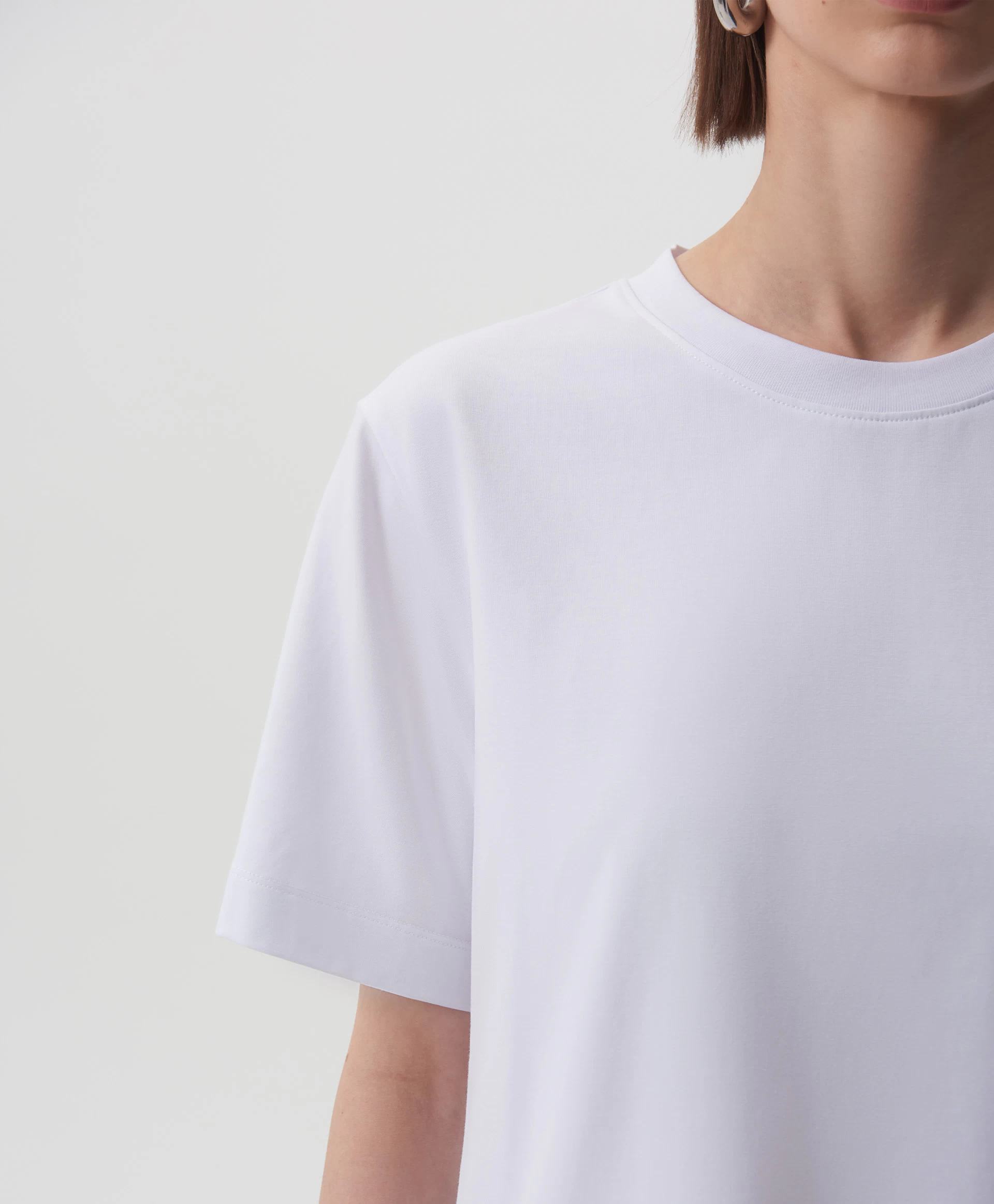 Белая футболка с коротким рукавом - идеальная базовая вещь, совместимая с любым гардеробом и образом жизни. Силуэт умеренный оверсайз, О-образная горловина, мягкий пластичный трикотаж высочайшего качества делают футболку образцом изделия из разряда необходимости.