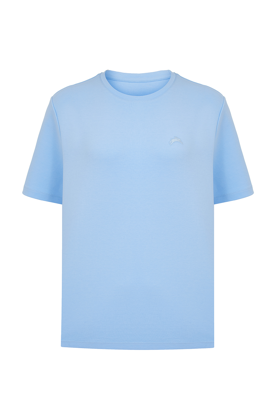 Классическая голубая футболка из хлопка - универсальная база для повседневных или спортивных комплектов. Модель свободного прямого силуэта с круглым вырезом дополнена изящным вышитым символом бренда.