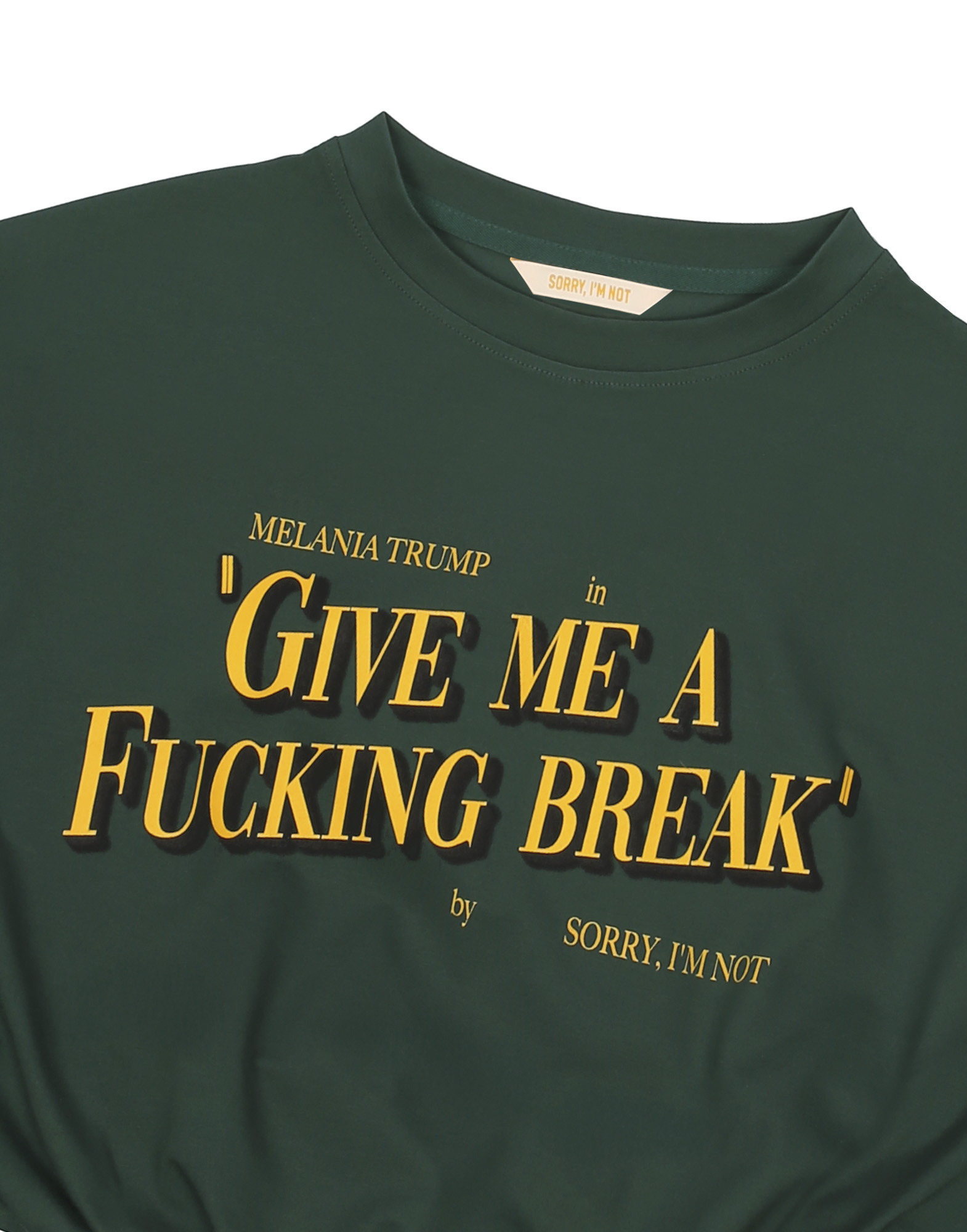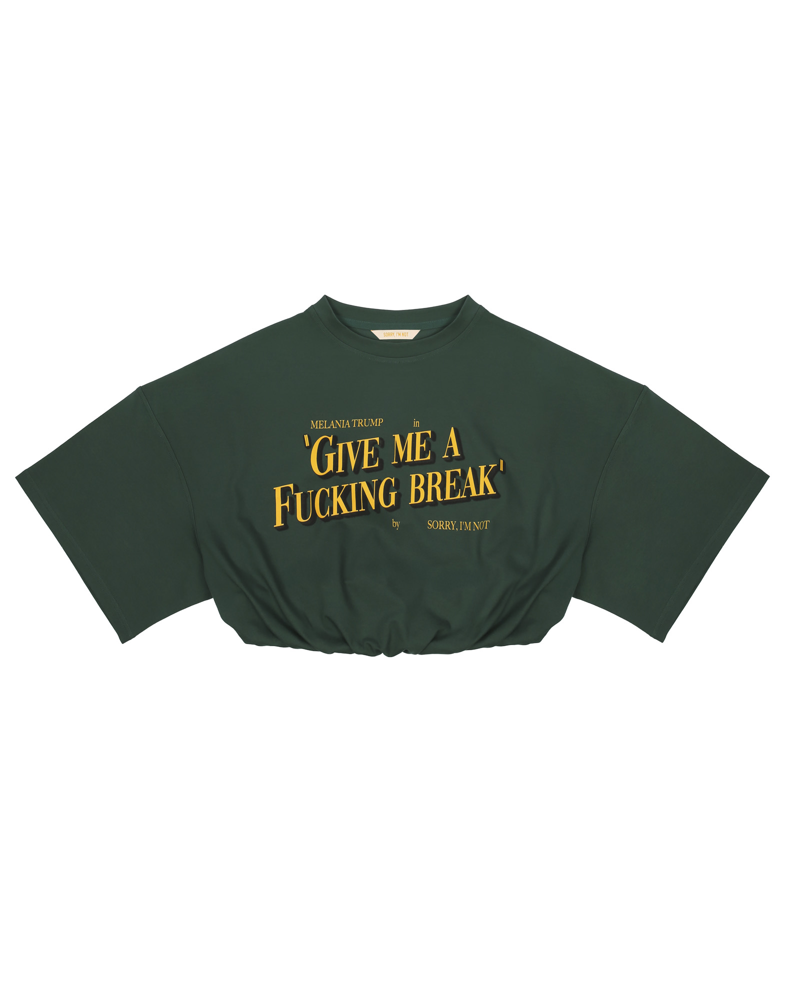 Свободный укороченный женский топ темно-зеленого цвета из легкой хлопковой ткани. Низ топа дополнен резинкой, обеспечивающей плотное прилегание к телу. Спереди на груди расположен авторский принт. Короткие рукава как у футболки, спущенная линия плеч.