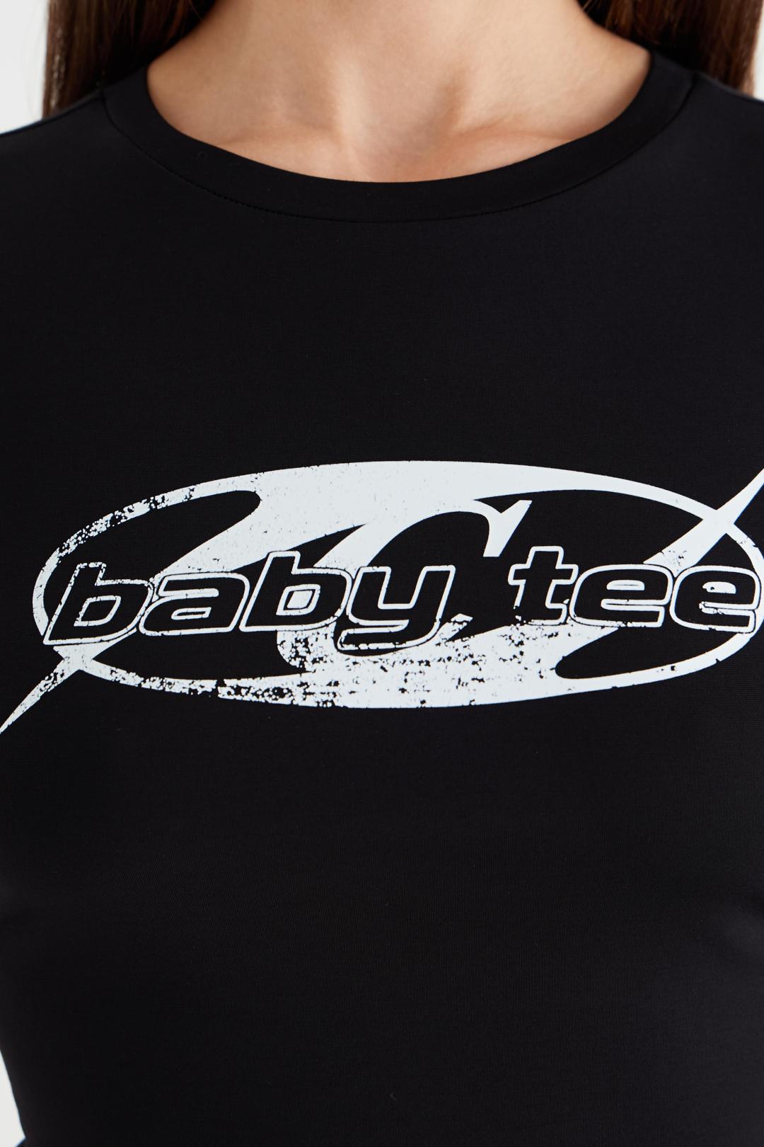 Футболка прилегающего силуэта с втачным рукавом из поливискозного трикотажа. Спереди по центру брендированный принт.