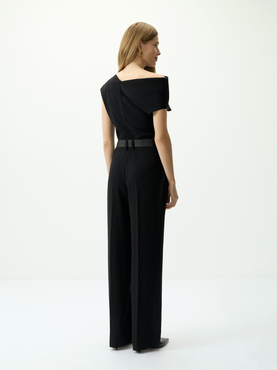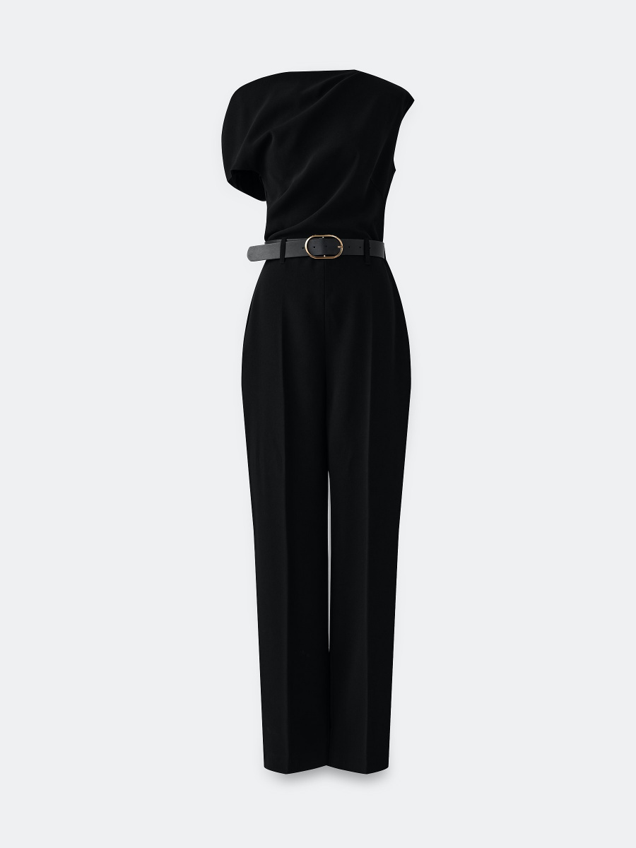 Брючный комбинезон с ассиметричной линией плеч и заутюженными стрелками — готовое решение для торжества, а также офиса. Выполнен в комфортном среднем облегании из плотной струящейся ткани. Дополнен шлевками под ремень и поясом из экокожи с металлической пряжкой. Застежка на потайную молнию в тон.