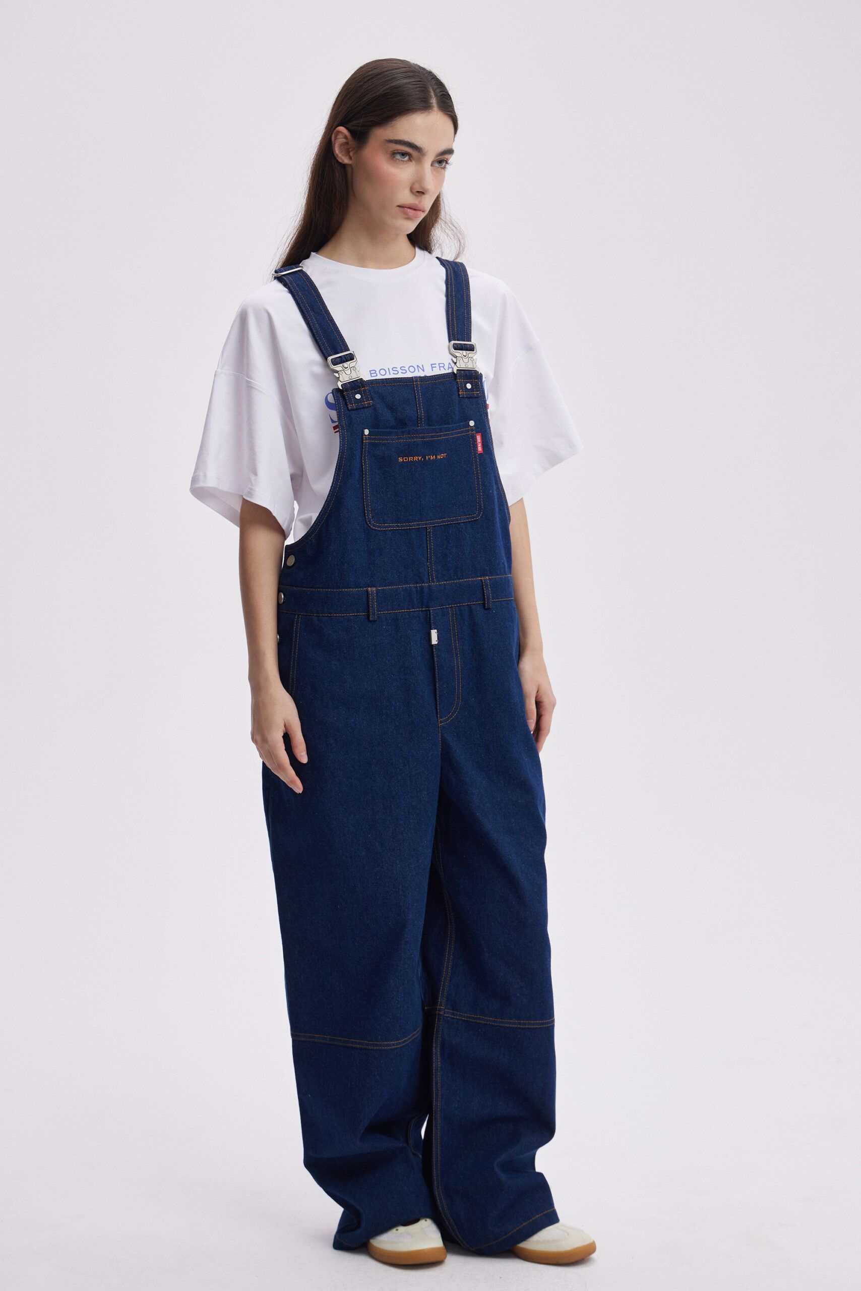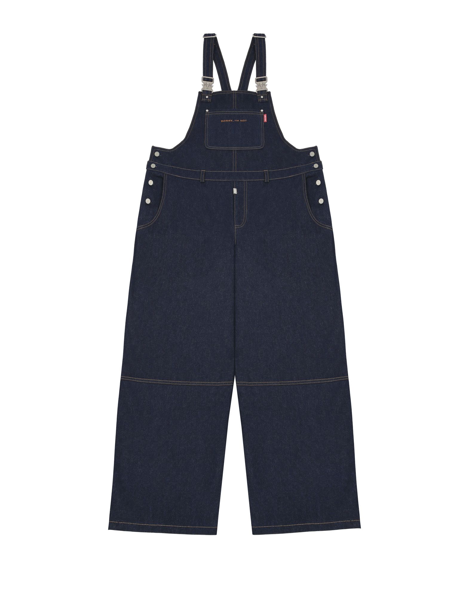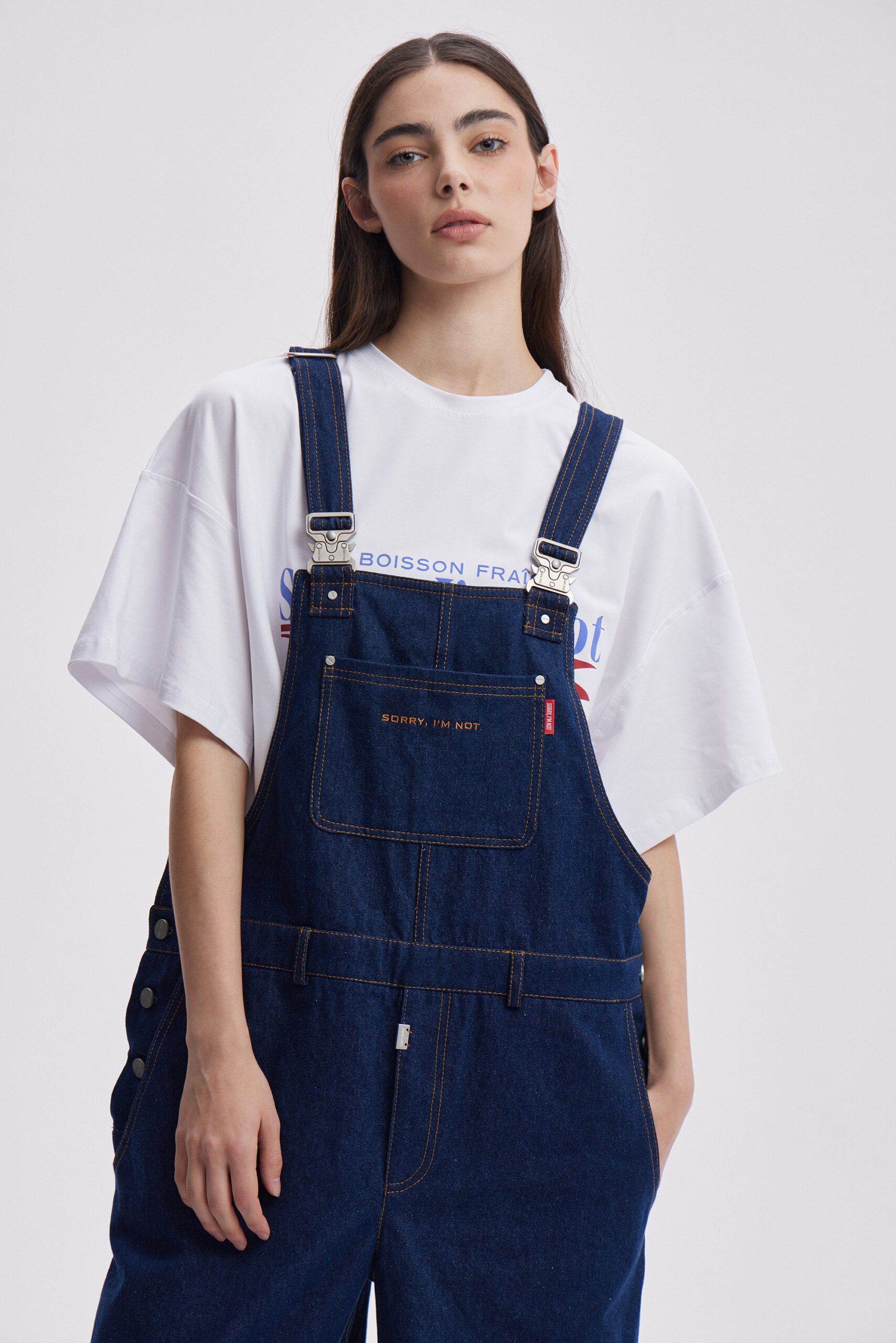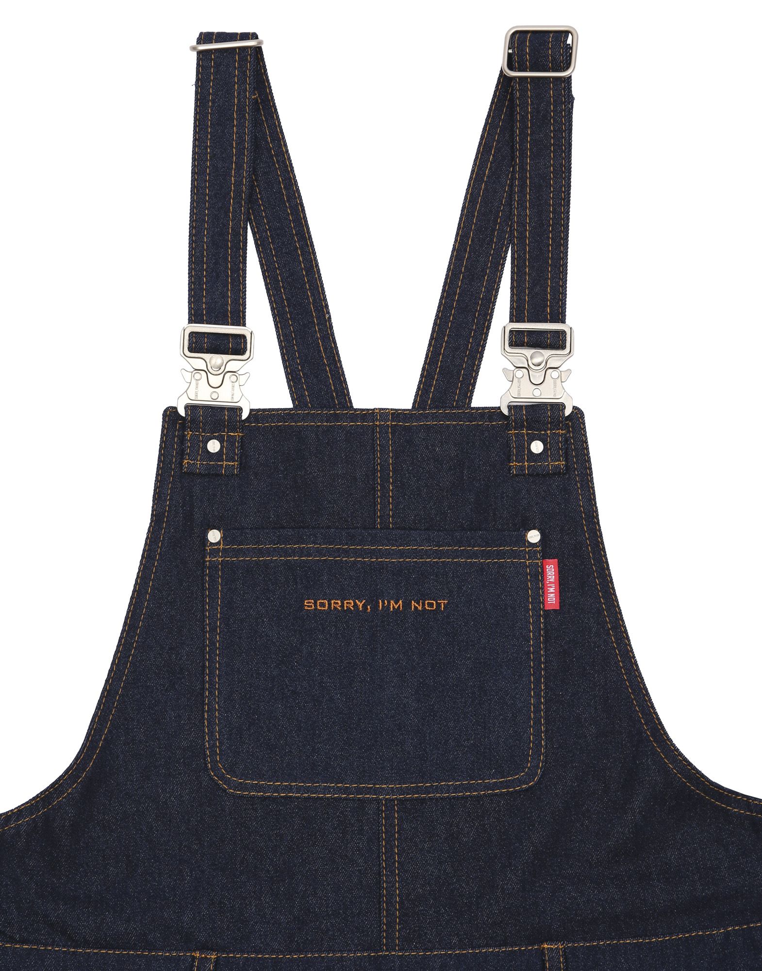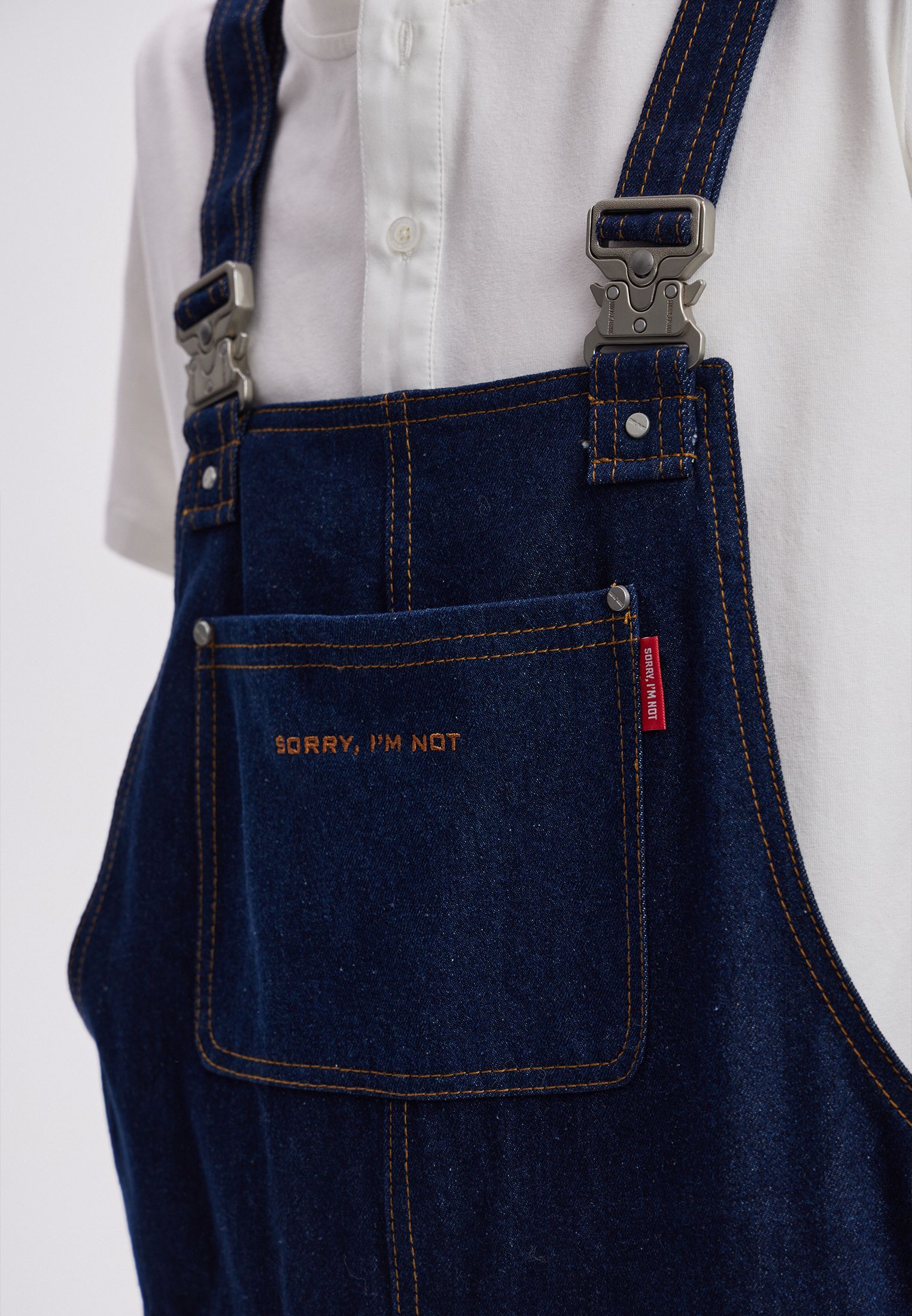Джинсовый комбинезон в темно-синем оттенке. Спереди на кармане красное лого SORRY, I’M NOT. Подойдет как для парней, так и для девушек.