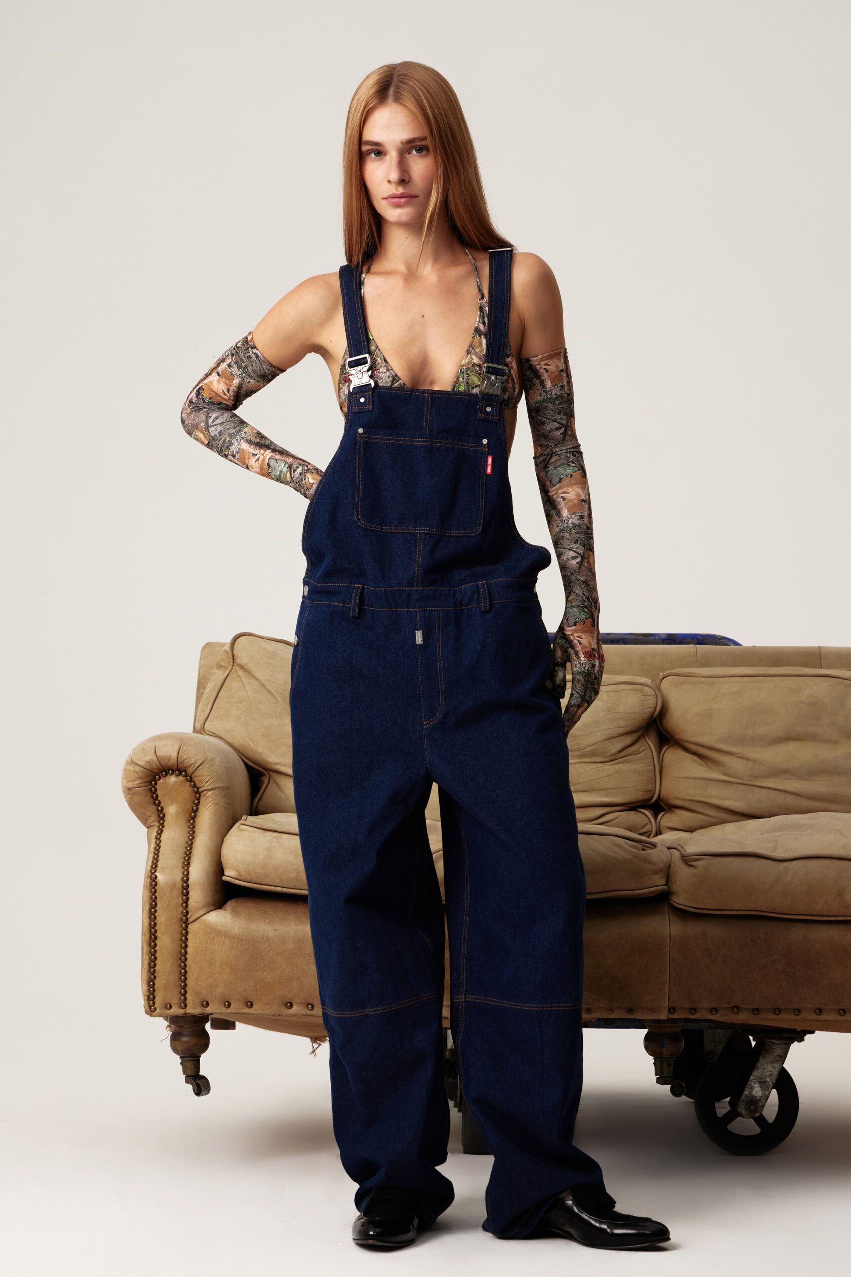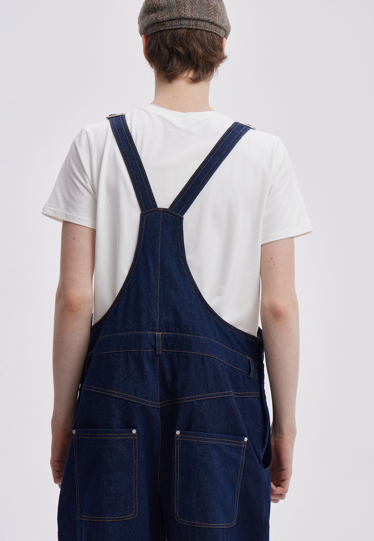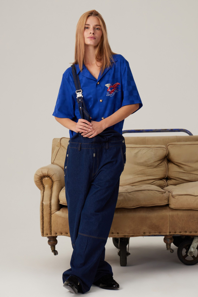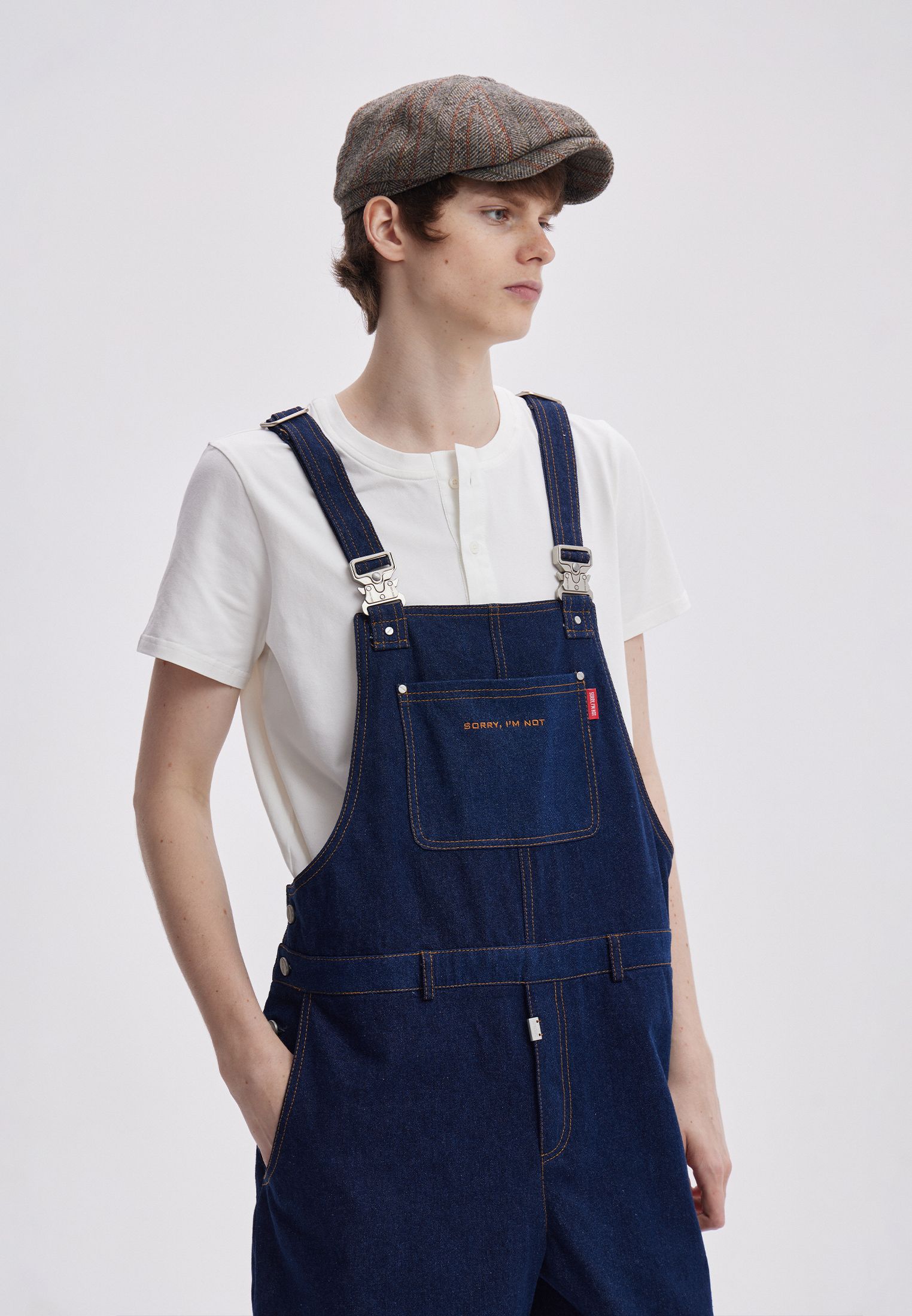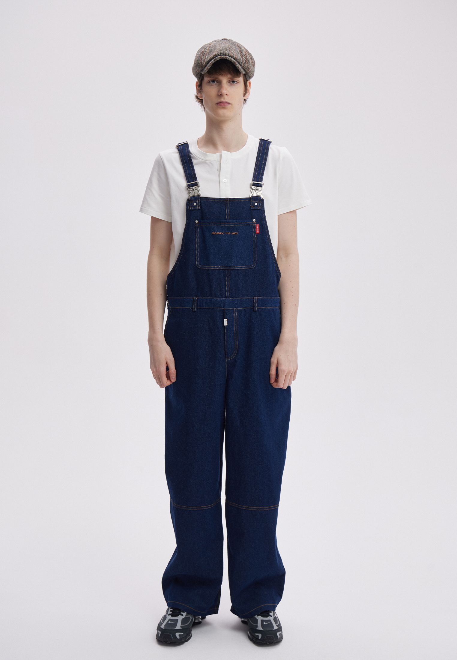 Джинсовый комбинезон в темно-синем оттенке. Спереди на кармане красное лого SORRY, I’M NOT. Подойдет как для парней, так и для девушек.