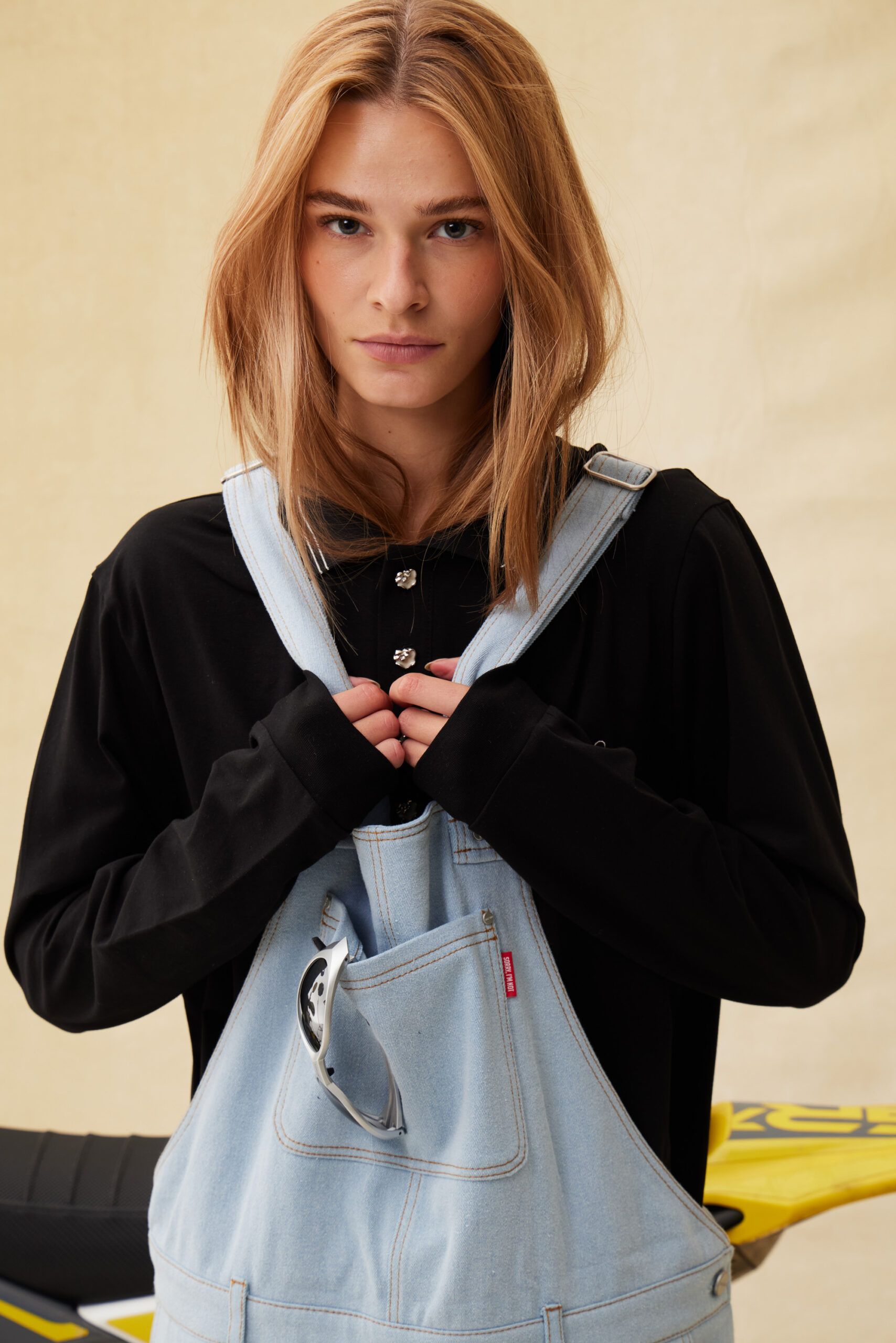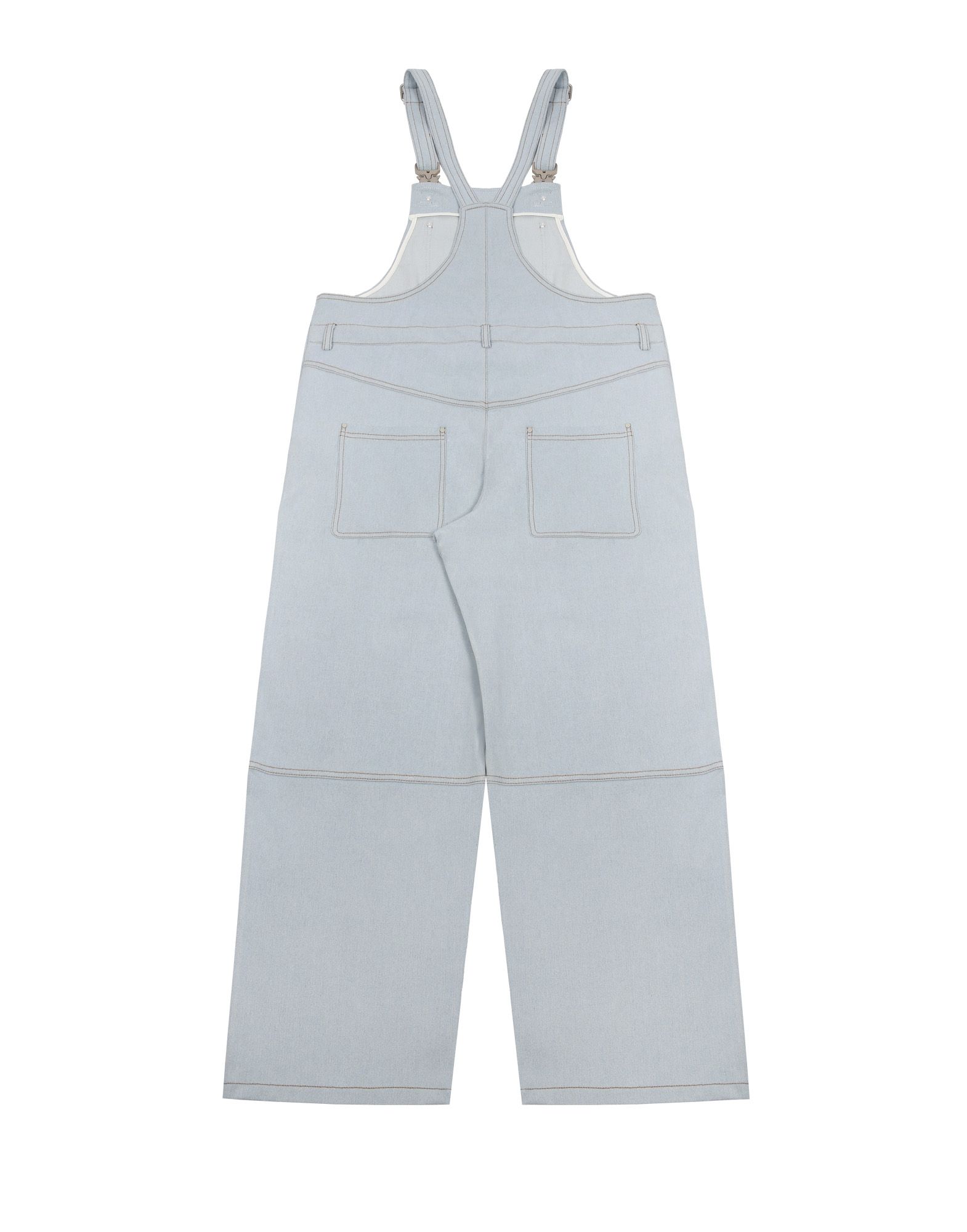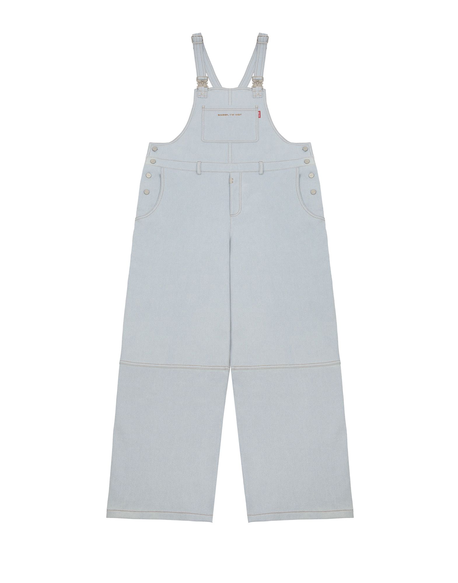 Джинсовый комбинезон в голубом цвете. Карман спереди дополнен вышитым лого. Подойдет как для парней, так и для девушек.