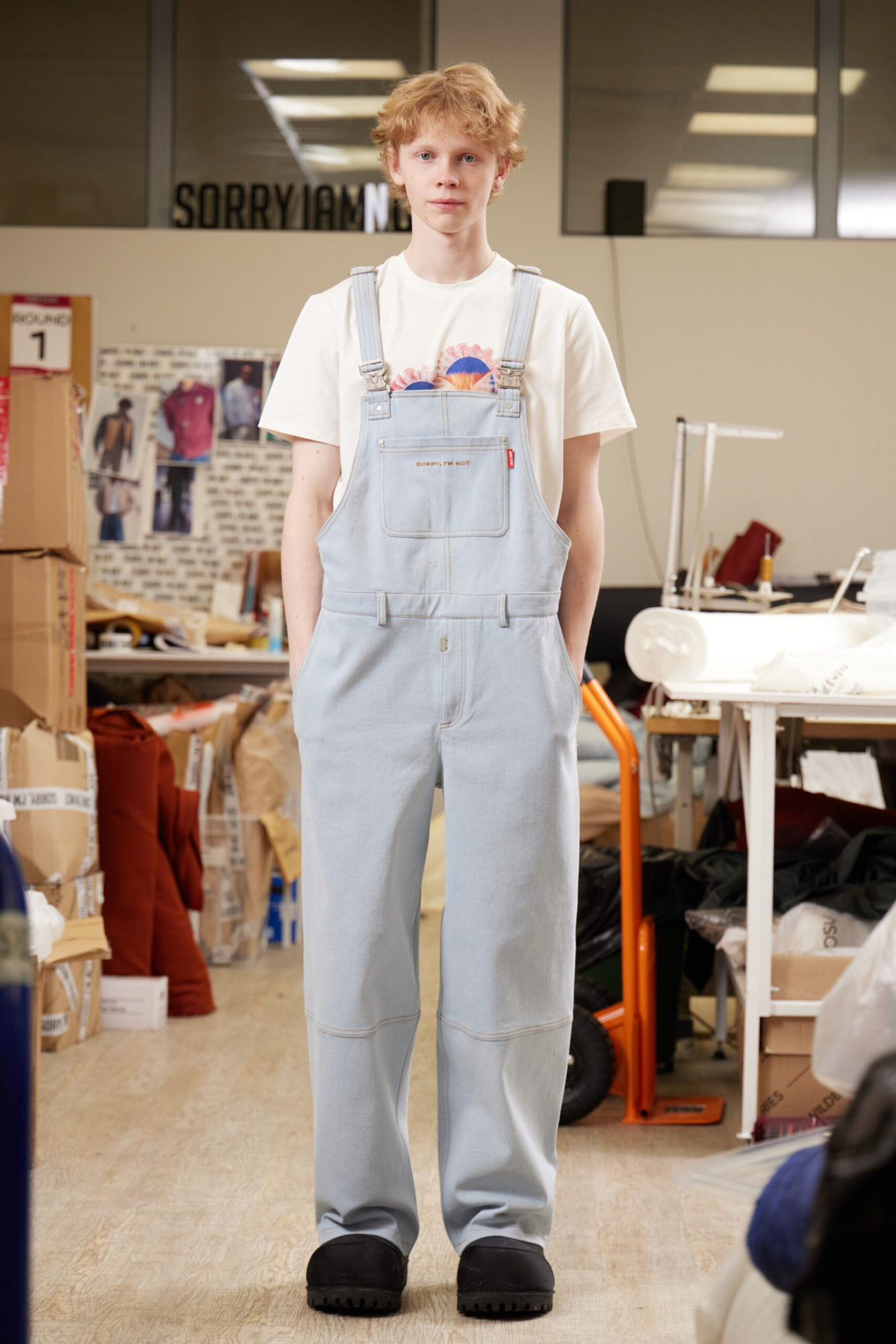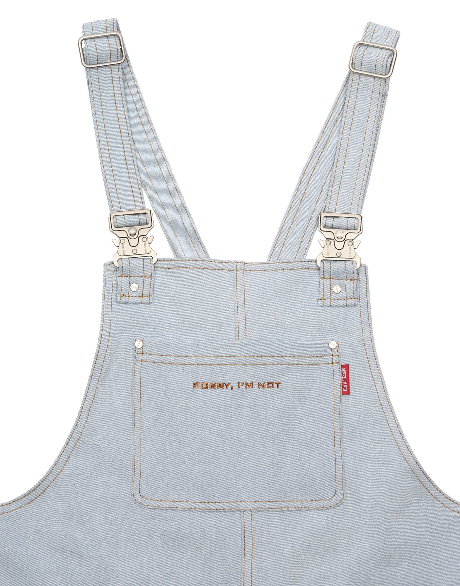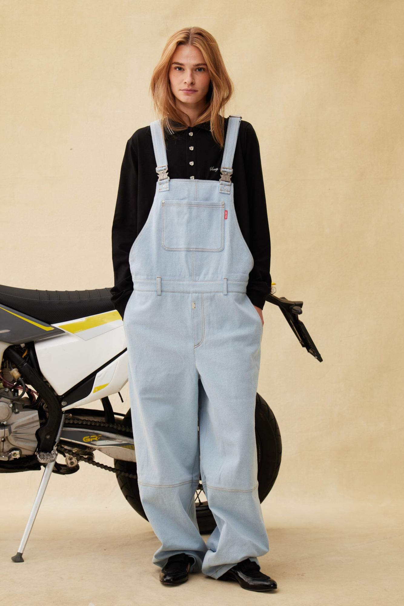 Джинсовый комбинезон в голубом цвете. Карман спереди дополнен вышитым лого. Подойдет как для парней, так и для девушек.