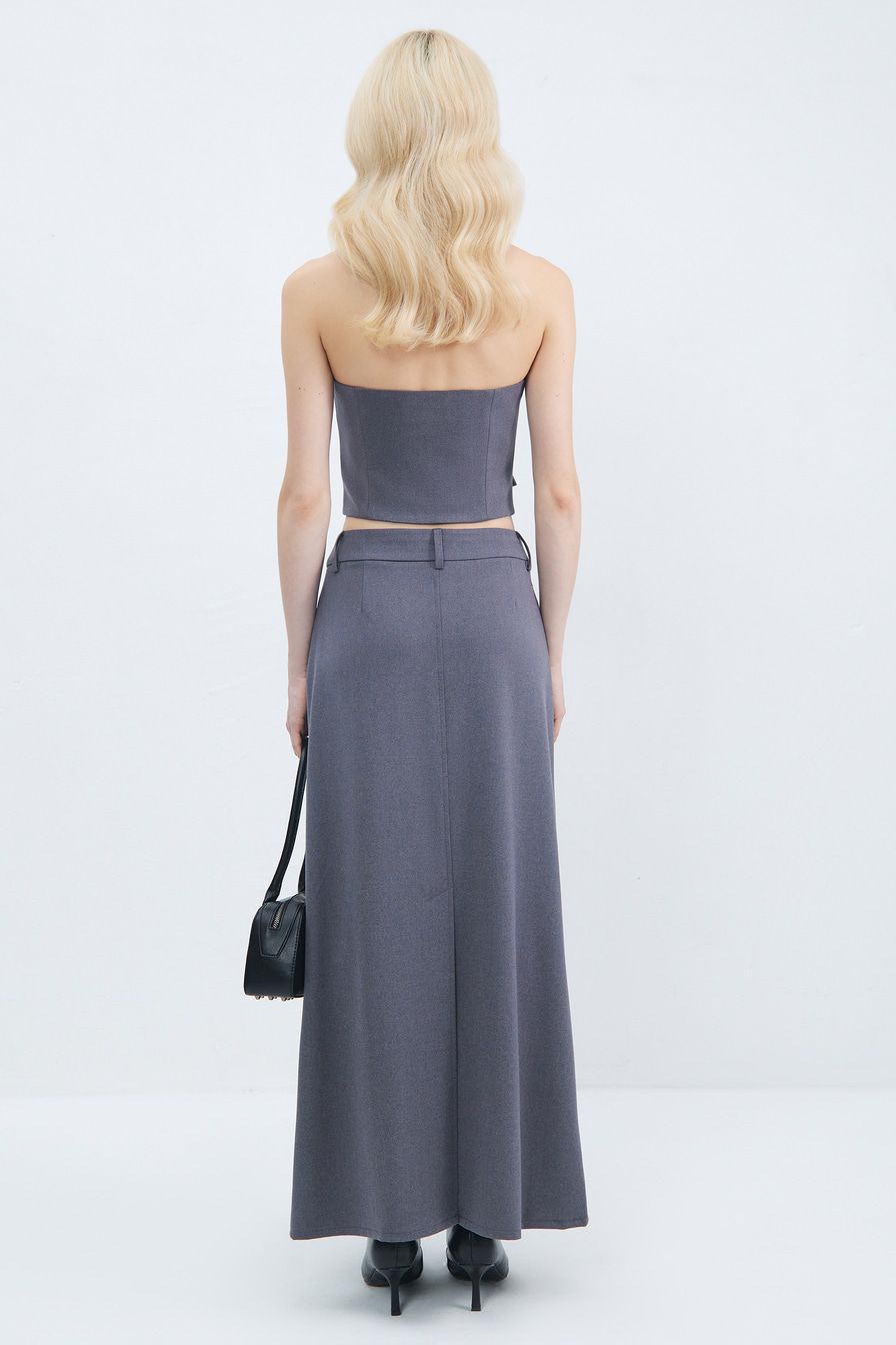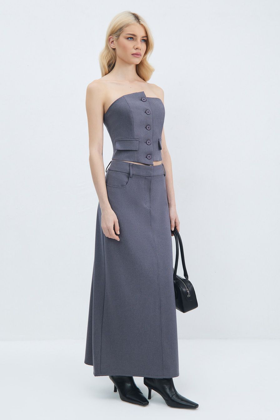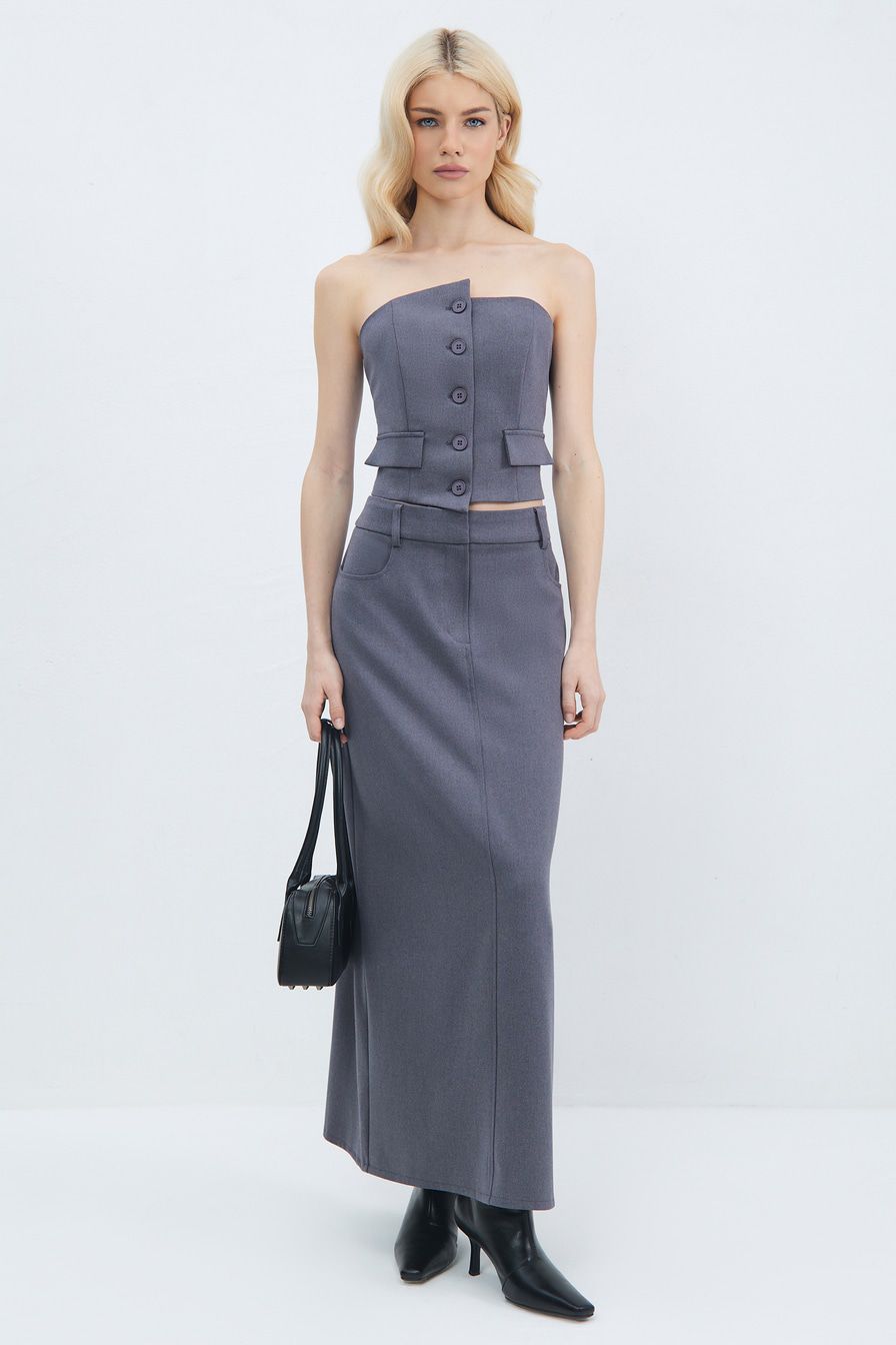 Серый топ-жилет из смесовой вискозы – модель асимметричного кроя. Жилет дополнен декоративными карманами с клапанами, застежкой с пуговицами и подкладкой из смесовой вискозы.