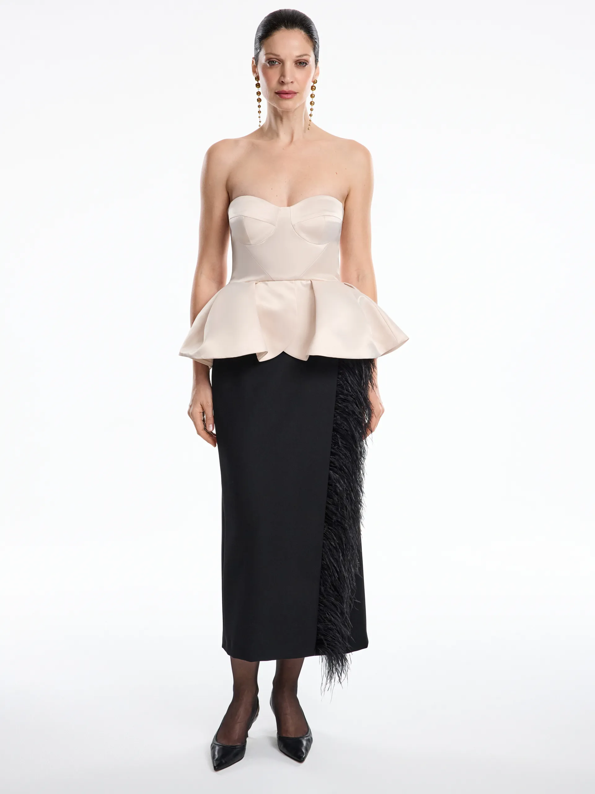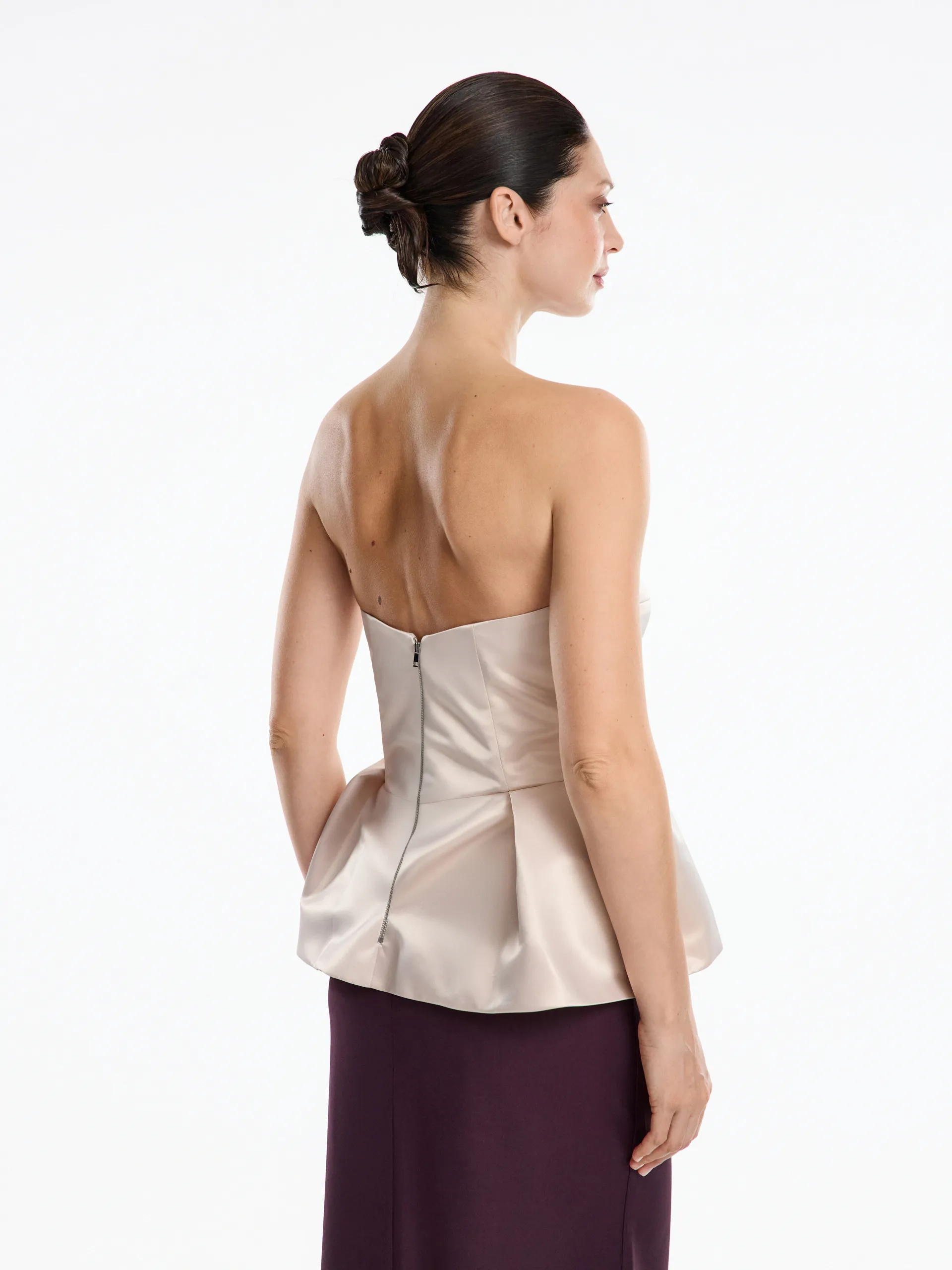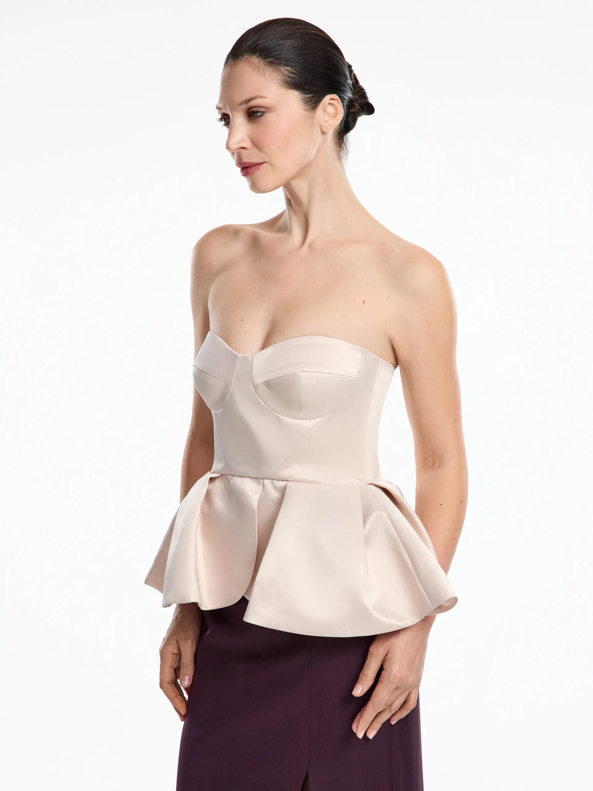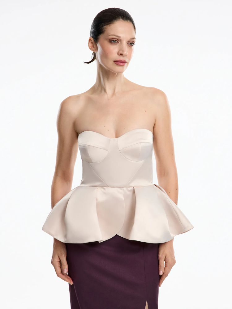 Корсетная модель из плотного атласа, которая создаёт чёткий графичный силуэт и подчёркивает талию. Акцентная баска выполнена из структурной ткани, благодаря чему держит форму, остаётся объёмной и аккуратной в течение всего дня. Плотный атлас придаёт образу глубину и благородный блеск, а качественная фурнитура обеспечивает идеальную посадку без деформации. Этот топ станет выразительной акцентной деталью в любом образе: комбинируйте его с костюмными брюками, прямыми юбками или жакетами из нашей коллекции для создании продуманного и сильного образа.