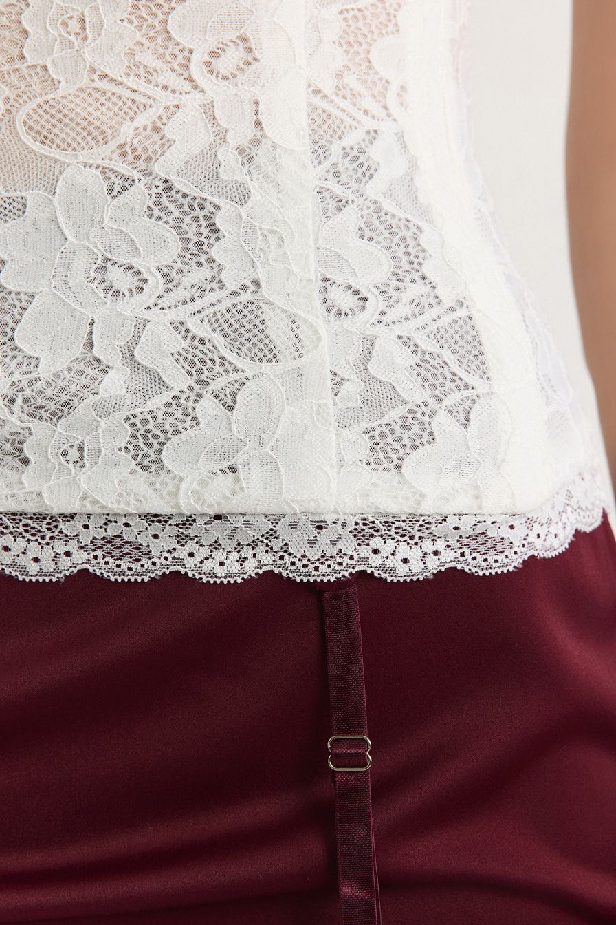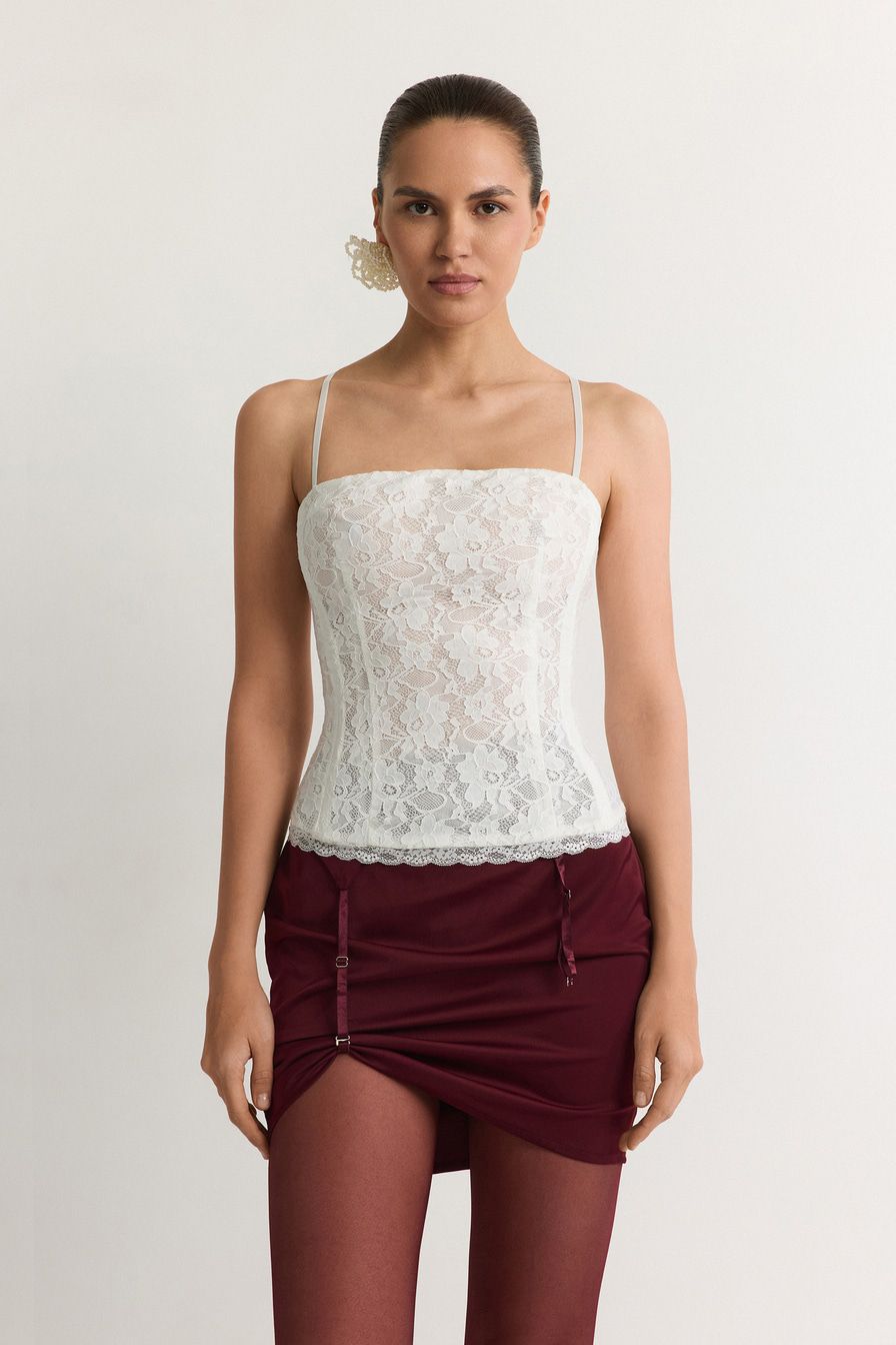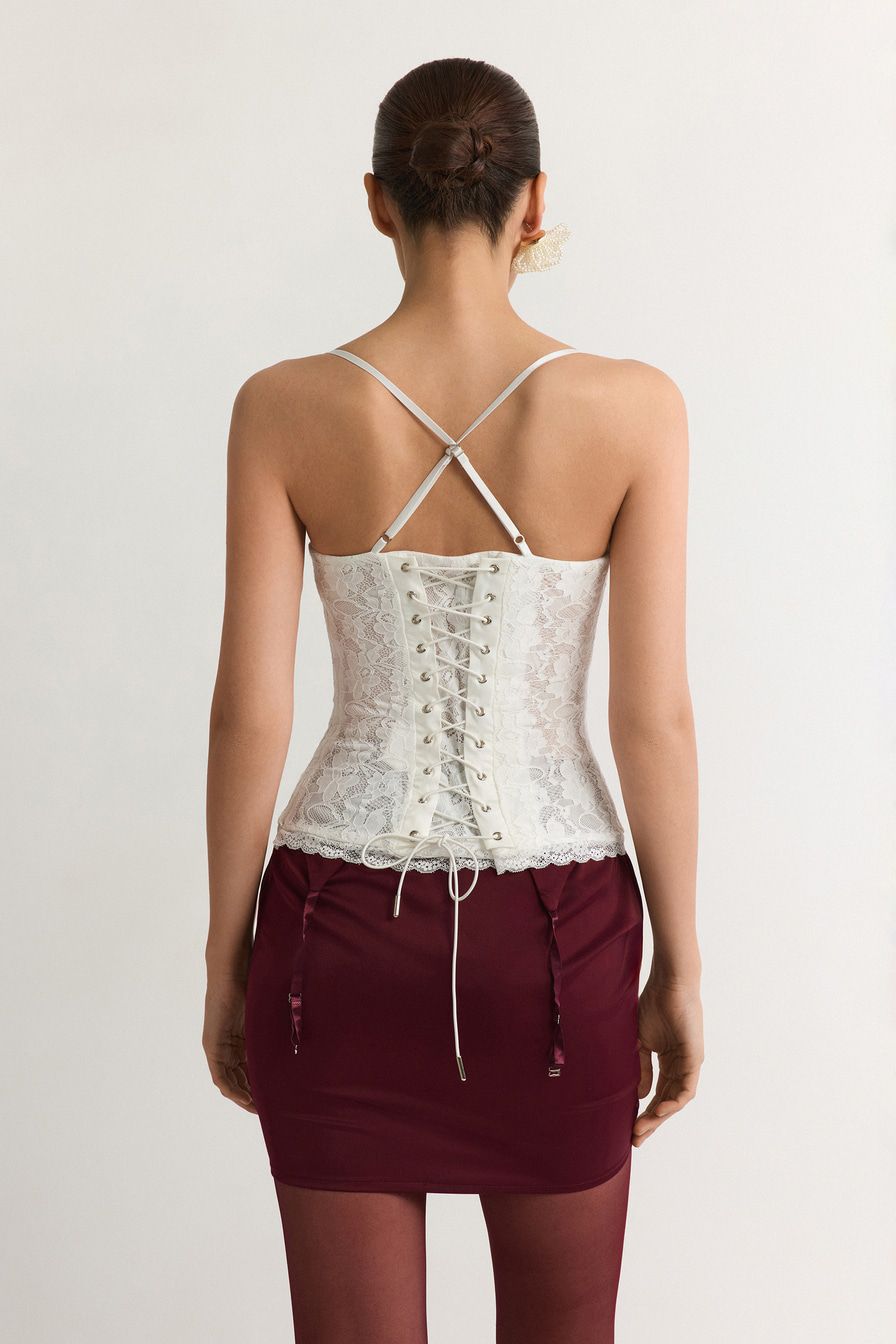Белый кружевной корсет с конструкцией, усиленной регилином, дополнен тонкими бретелями и шнуровкой на спине.