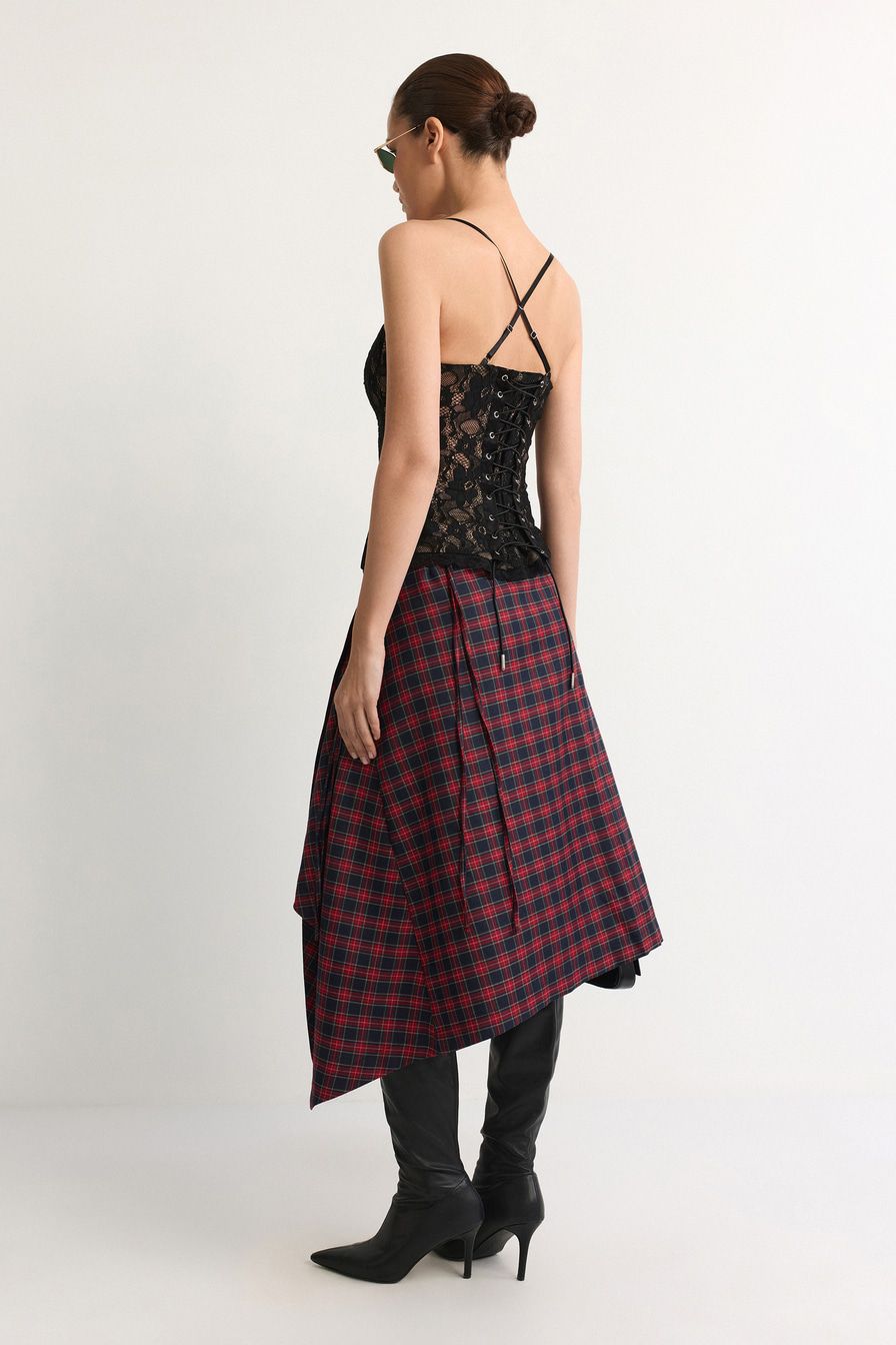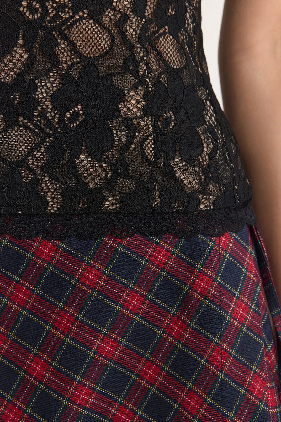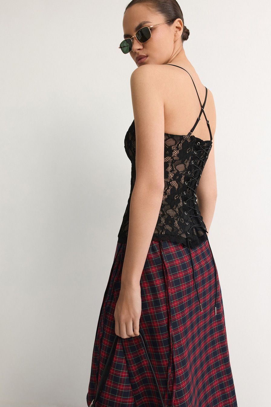 Черный кружевной корсет с конструкцией, усиленной регилином, дополнен тонкими бретелями и шнуровкой на спине.