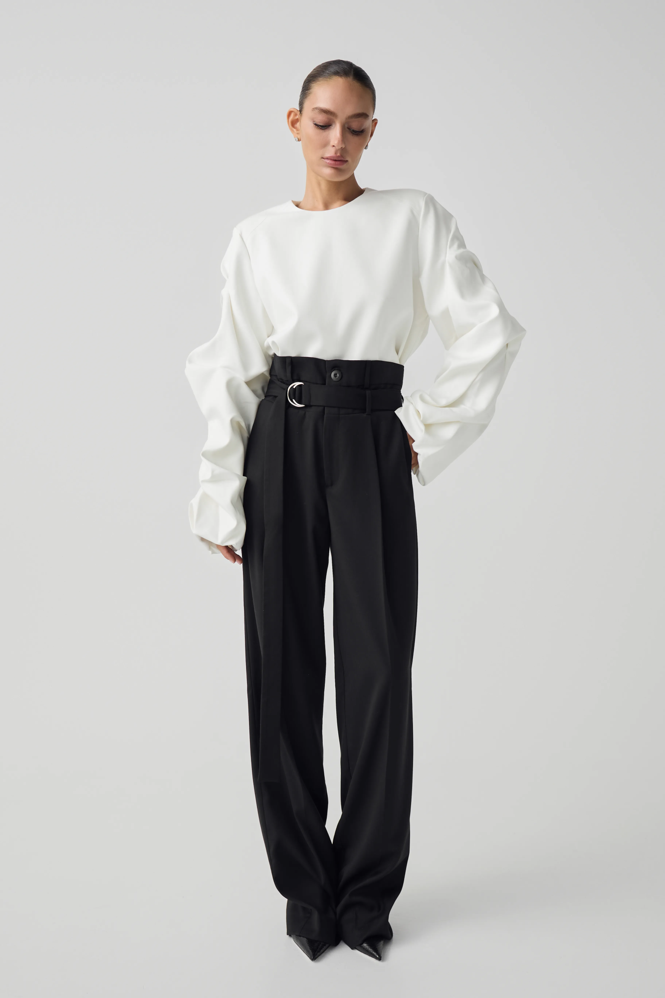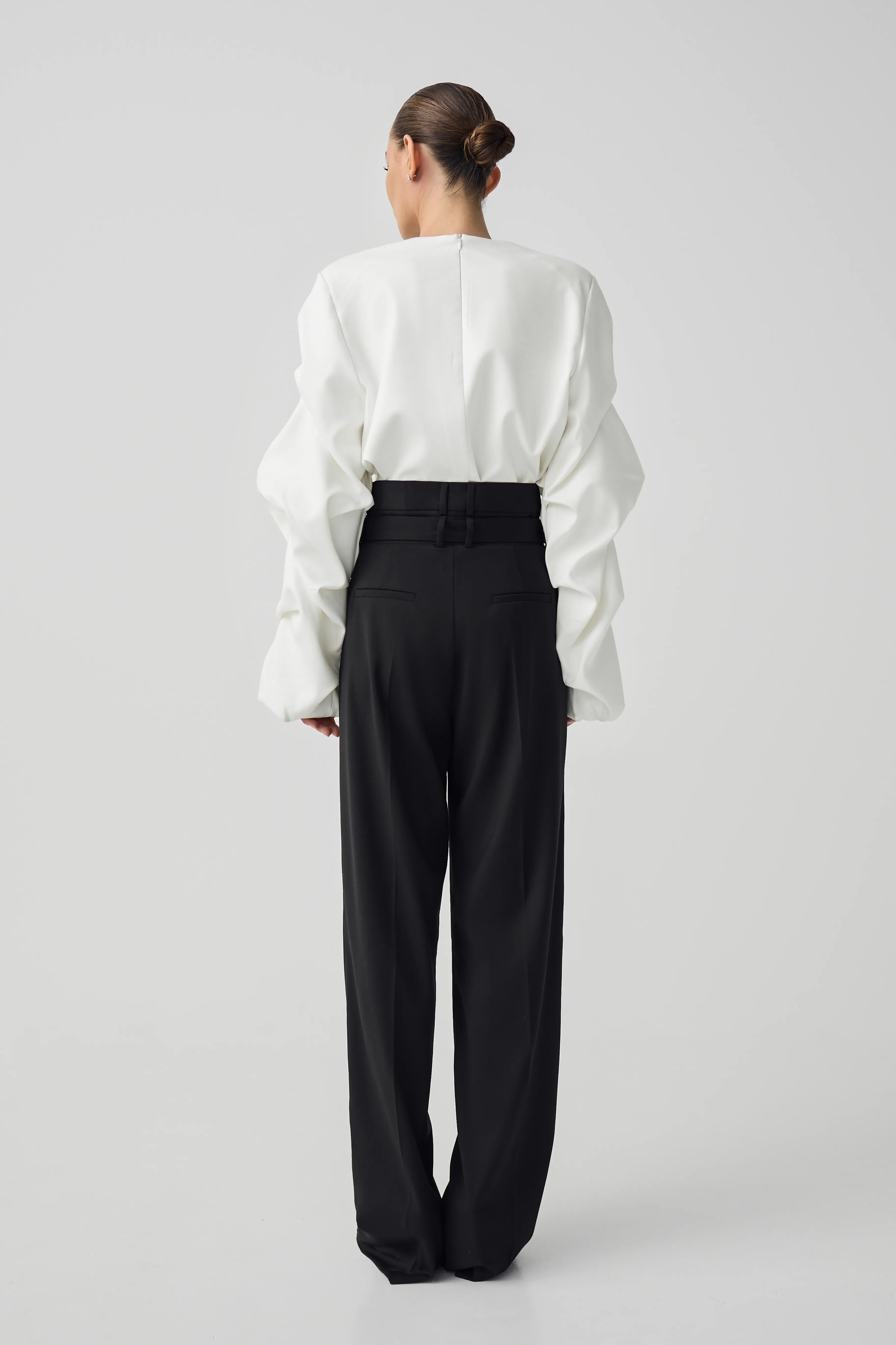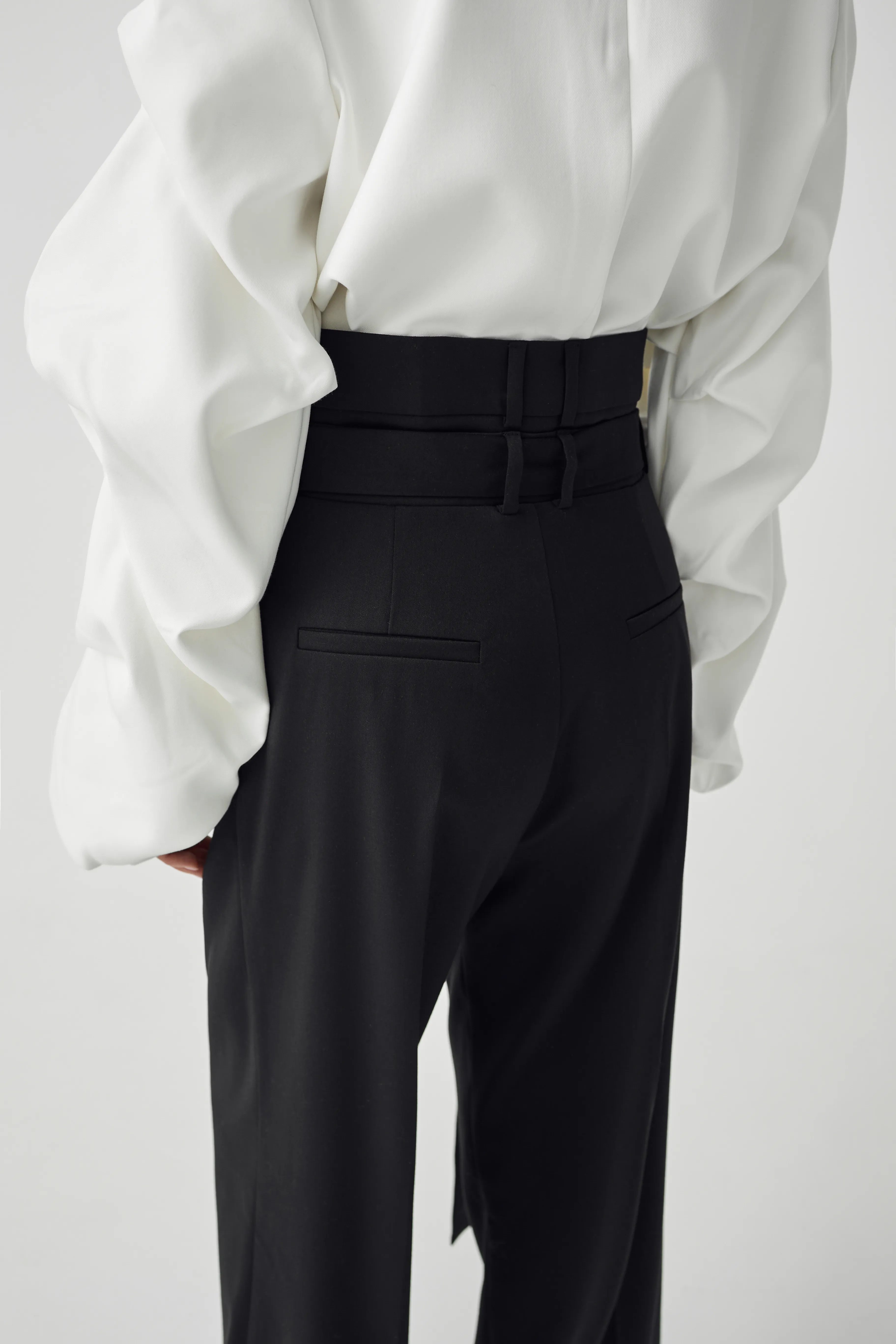 Брюки прямого кроя с высокой талией и двойным поясом.