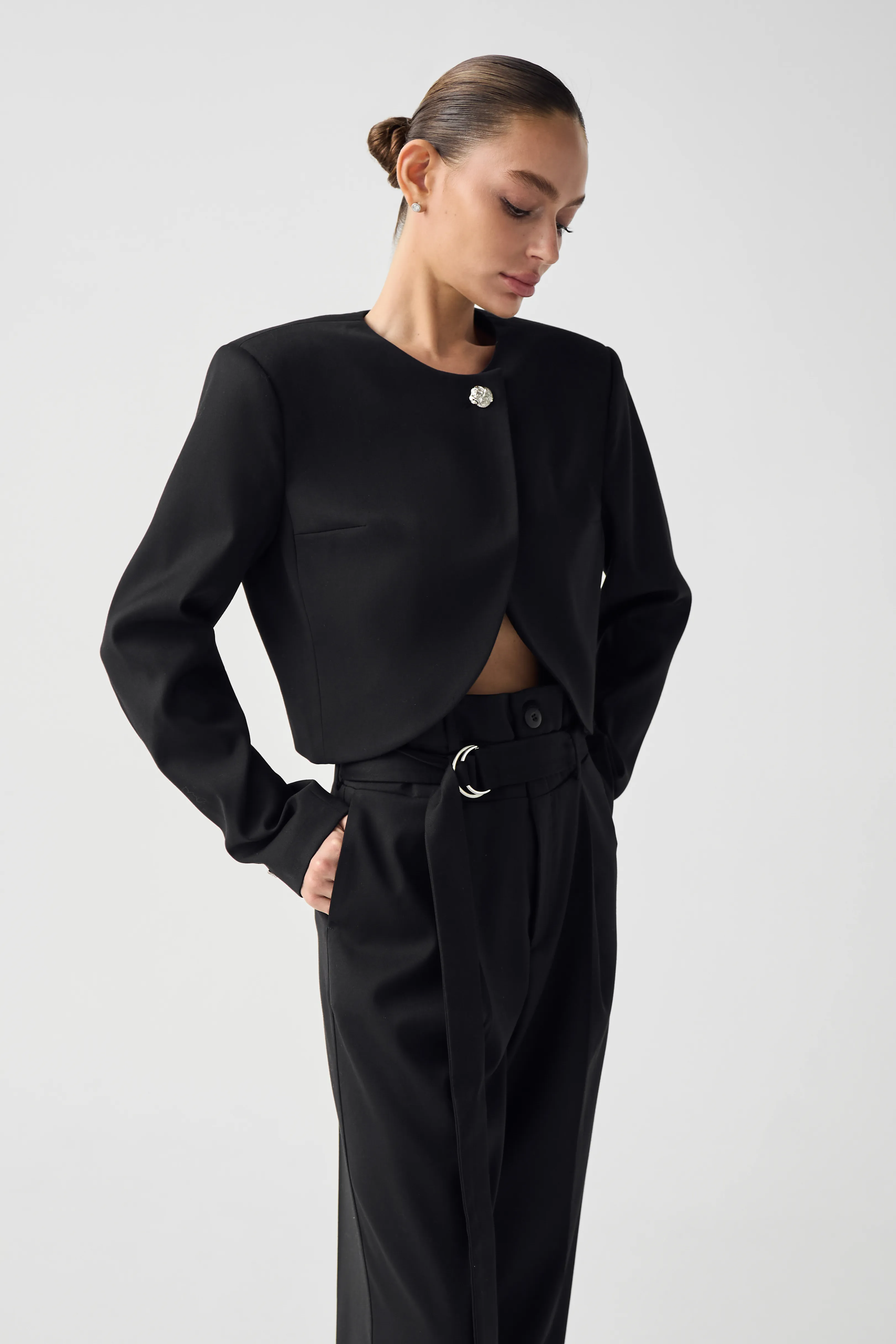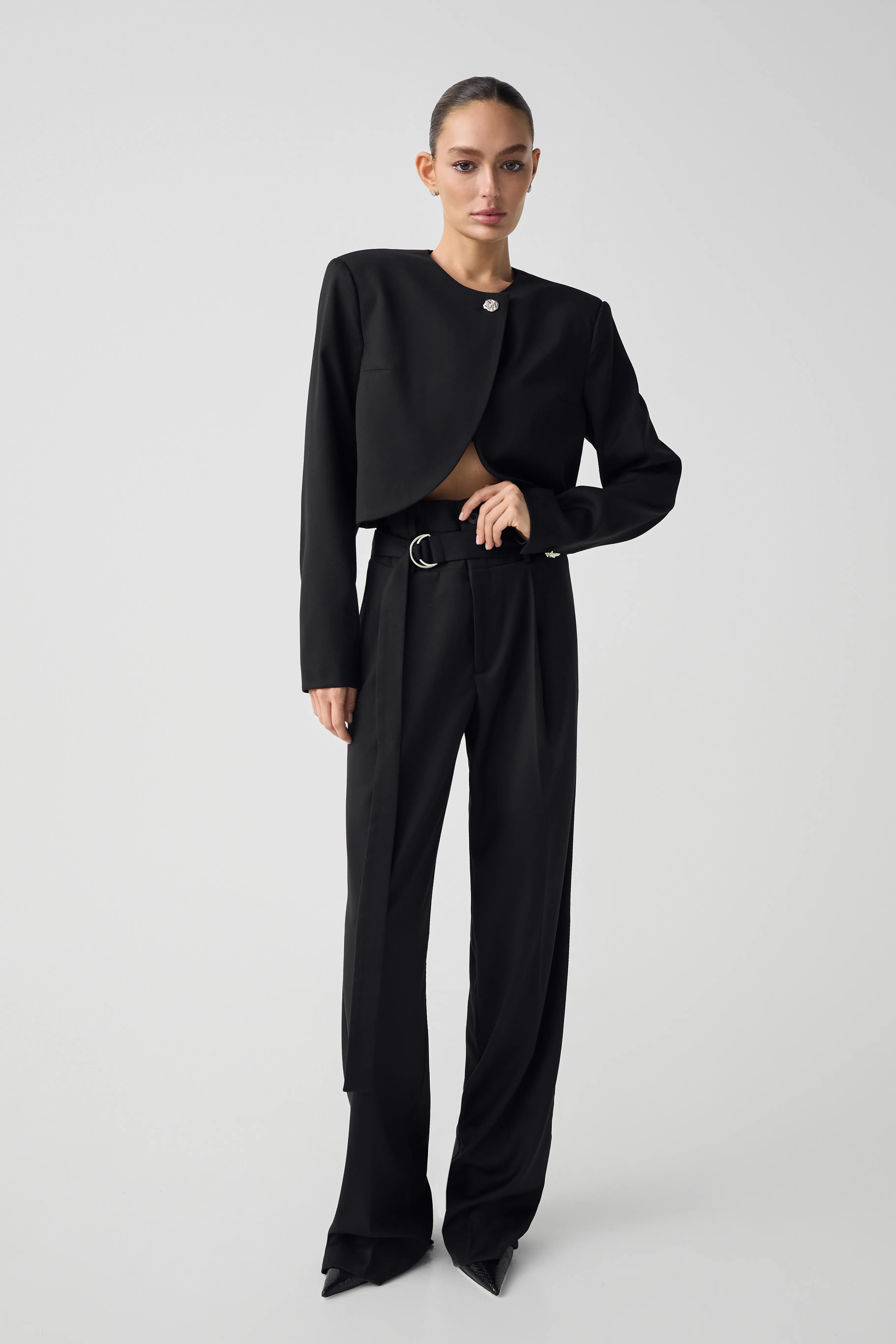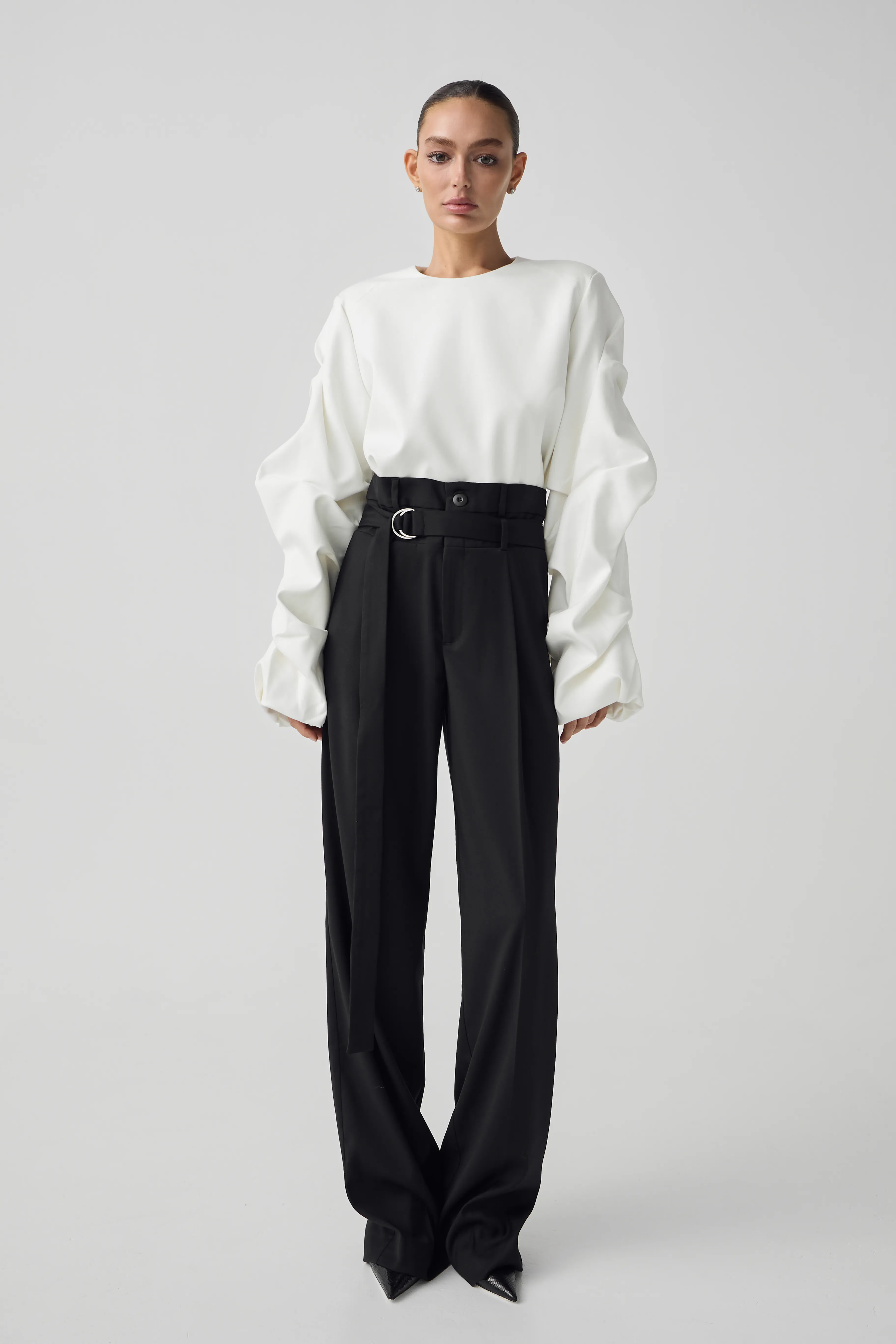 Брюки прямого кроя с высокой талией и двойным поясом.