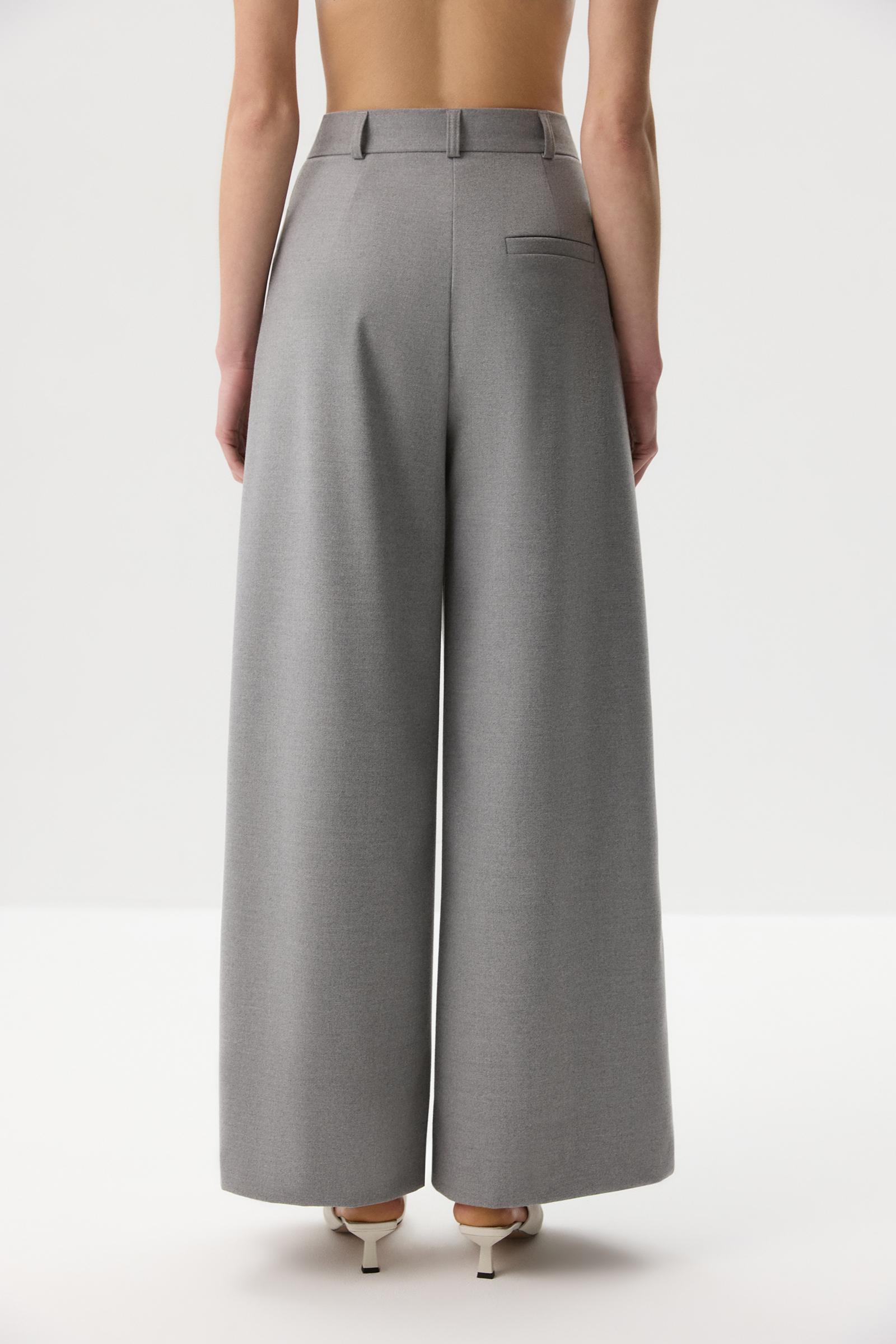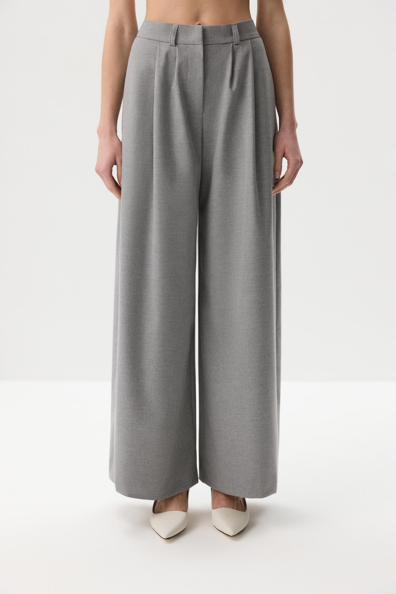 Объемные брюки палаццо с широким поясом. Благодаря плотной мягкой костюмной ткани, защипам и правильной высокой посадке изделие изящно струятся при ходьбе. Застежка на молнию и крючок, карманы в боковых швах.