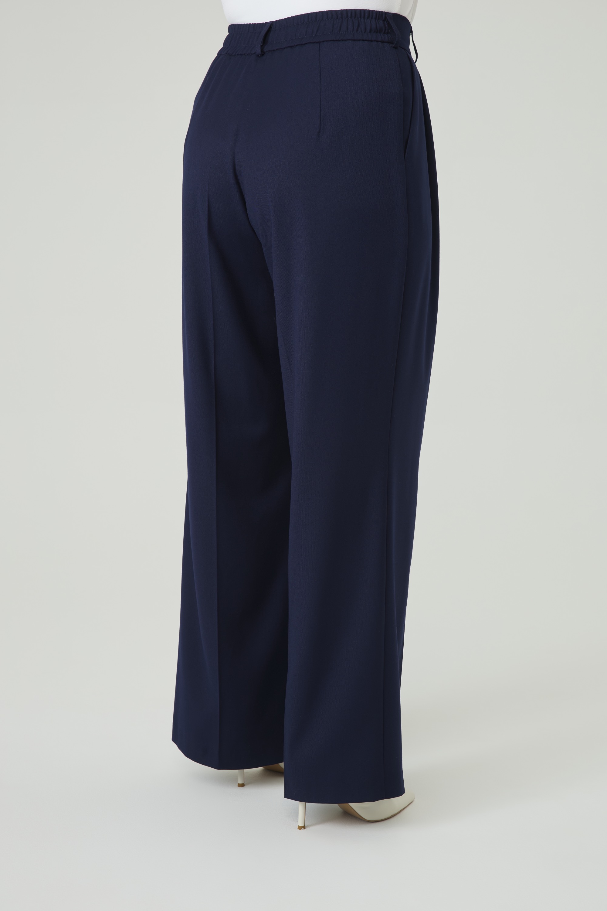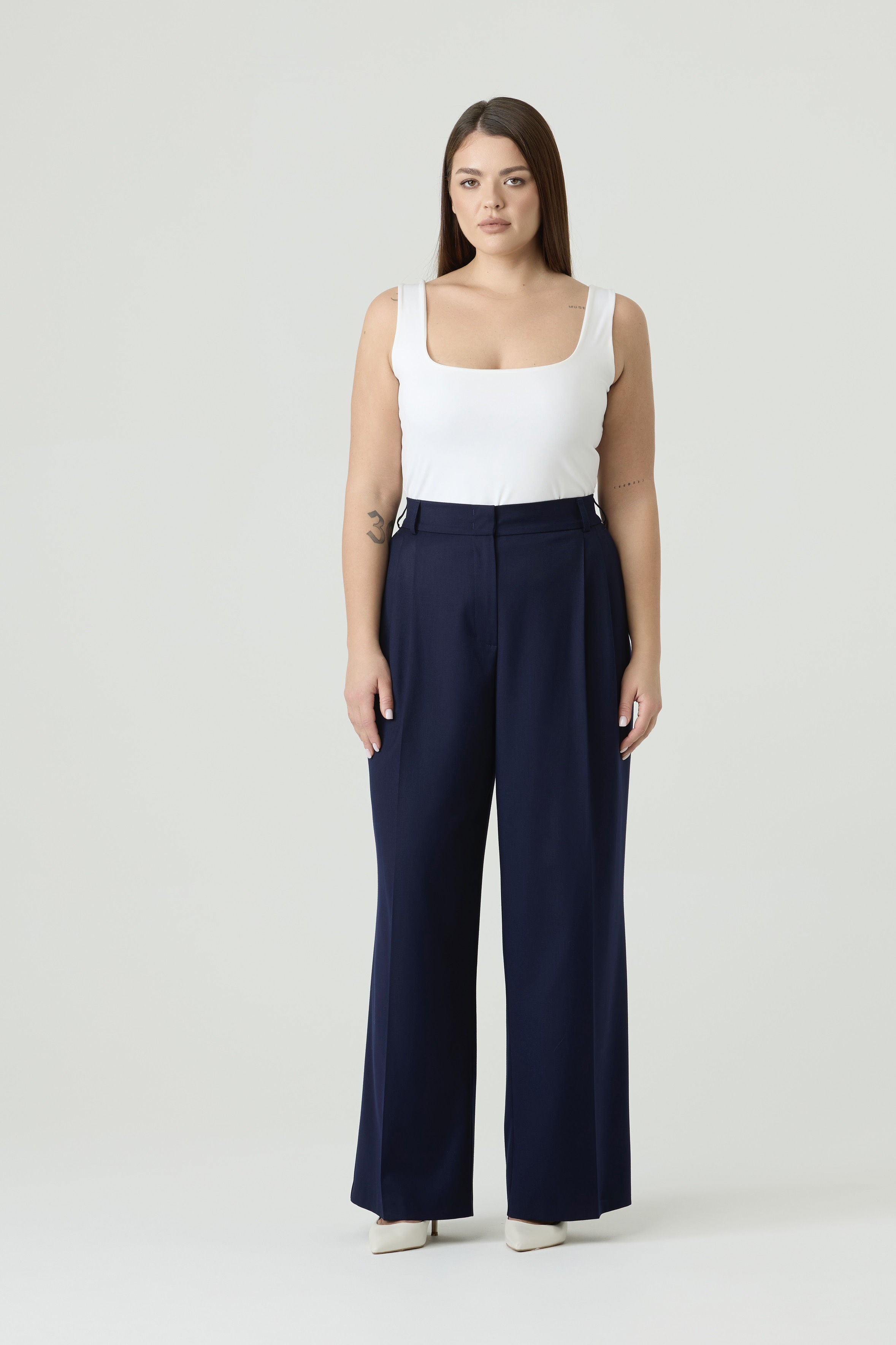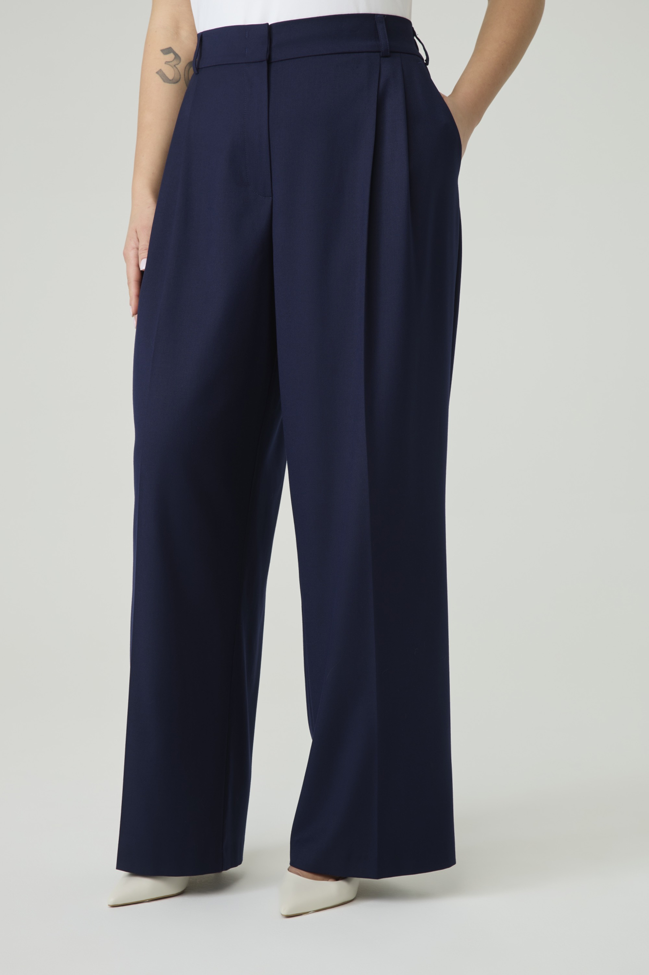 Брюки прямого кроя со стрелками глубокого синего цвета.