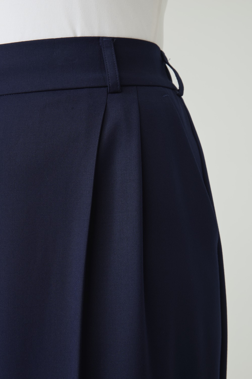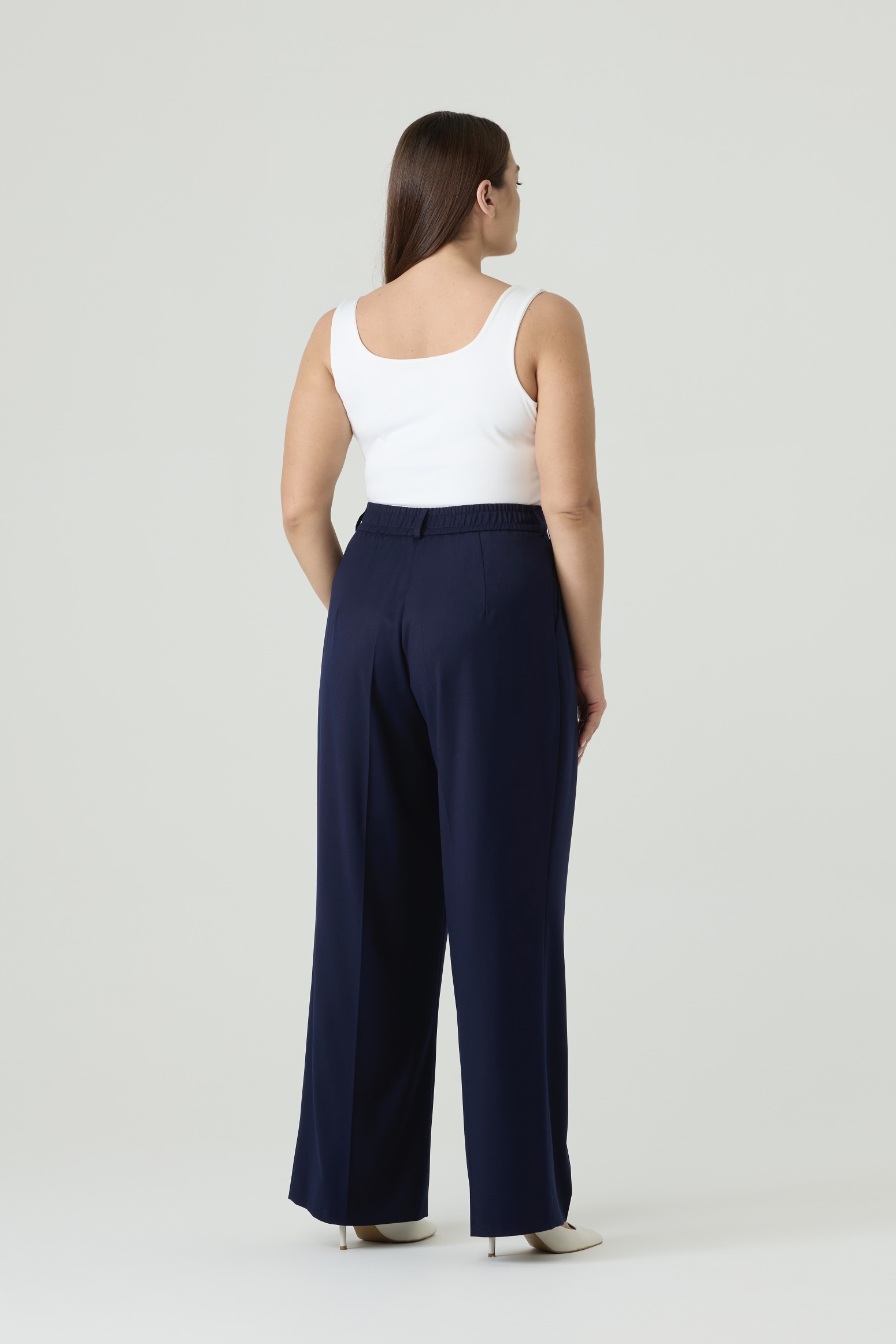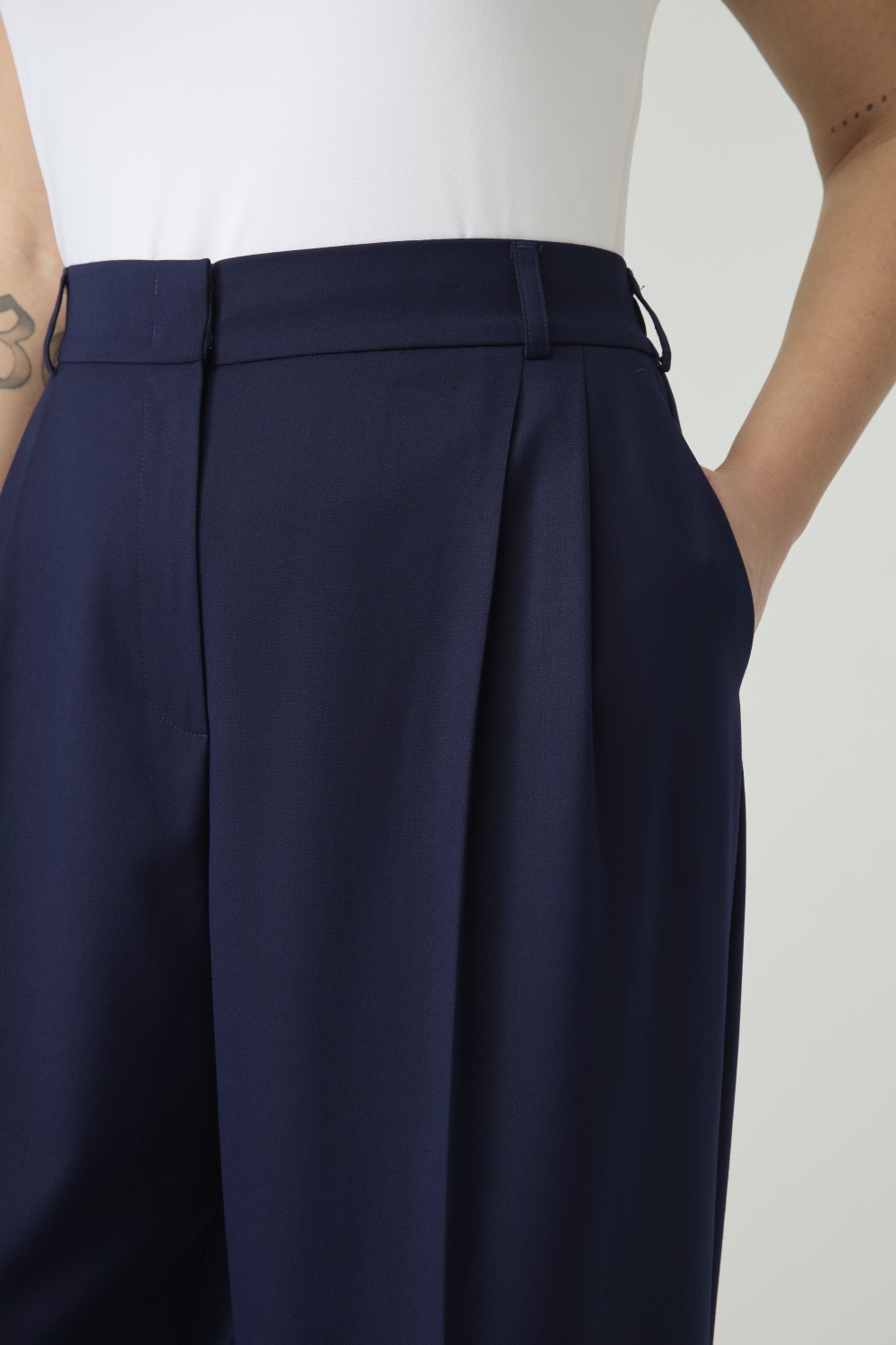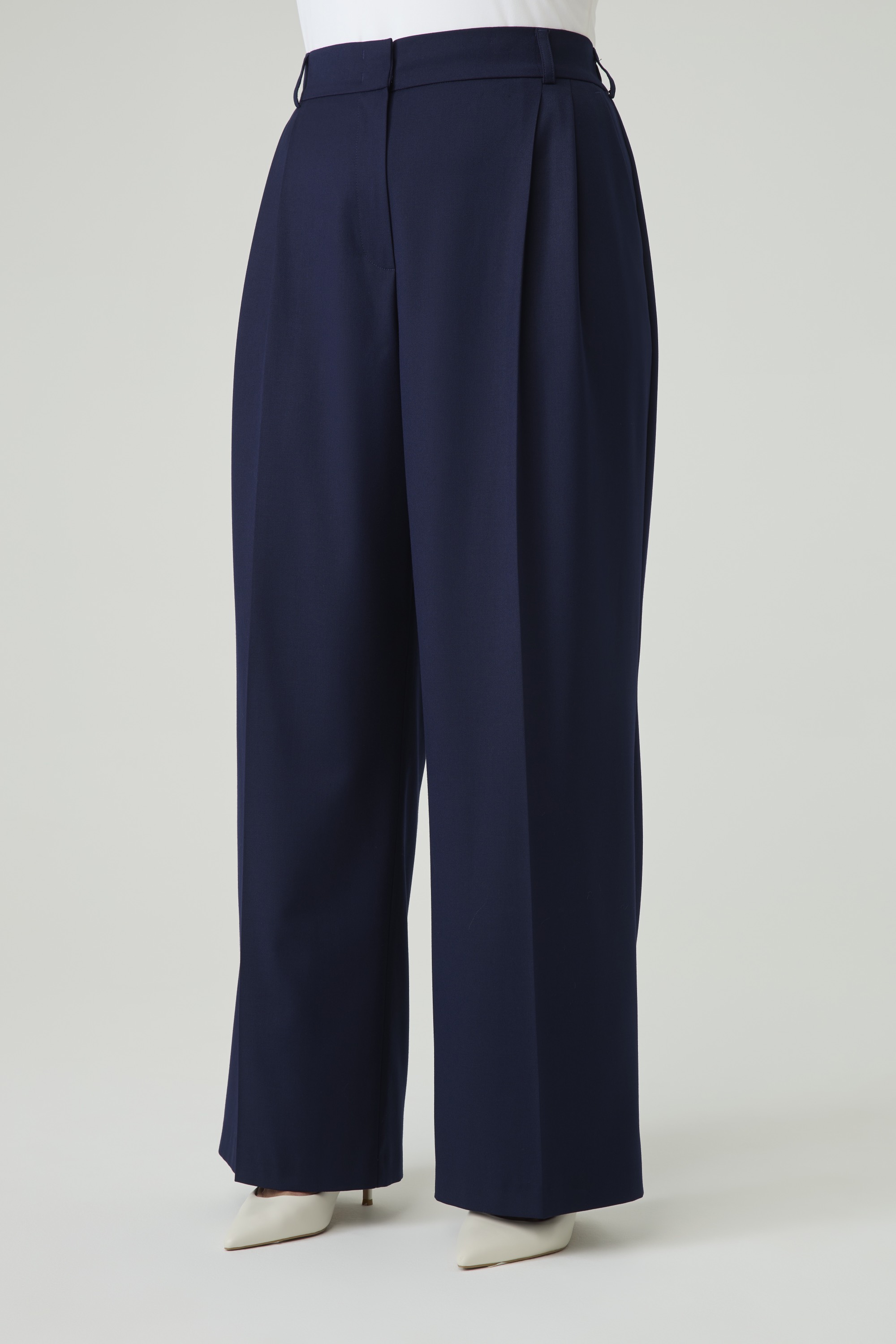 Брюки прямого кроя со стрелками глубокого синего цвета.
