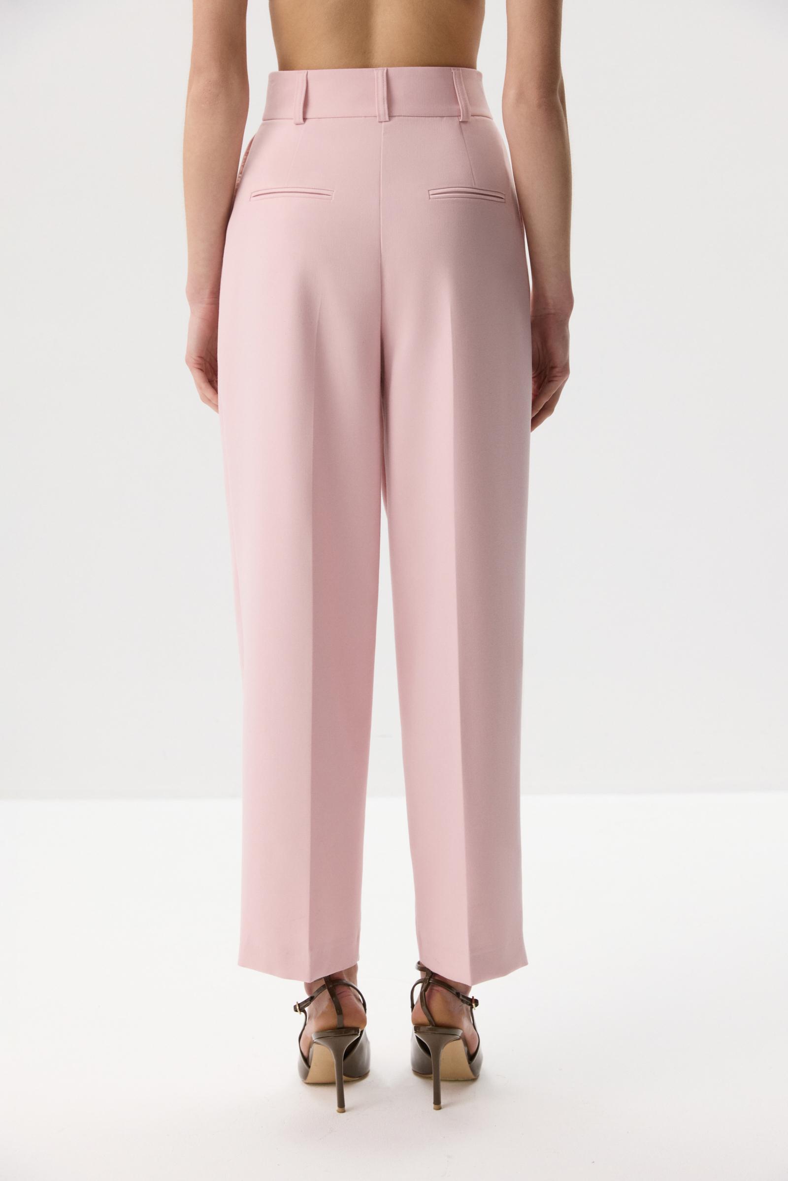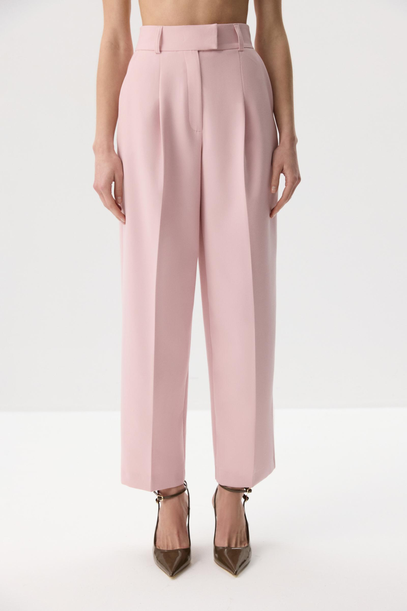 Брюки о-образного силуэта - модель, отличающаяся мягко расширяющейся линией бедер, с заметным объемом по бокам и постепенным сужением книзу. Такая форма создает характерную округлую форму. Брюки с высокой посадкой и широким поясом. Застежка на молнию и крючки, на полочке застрочены высокие складки.