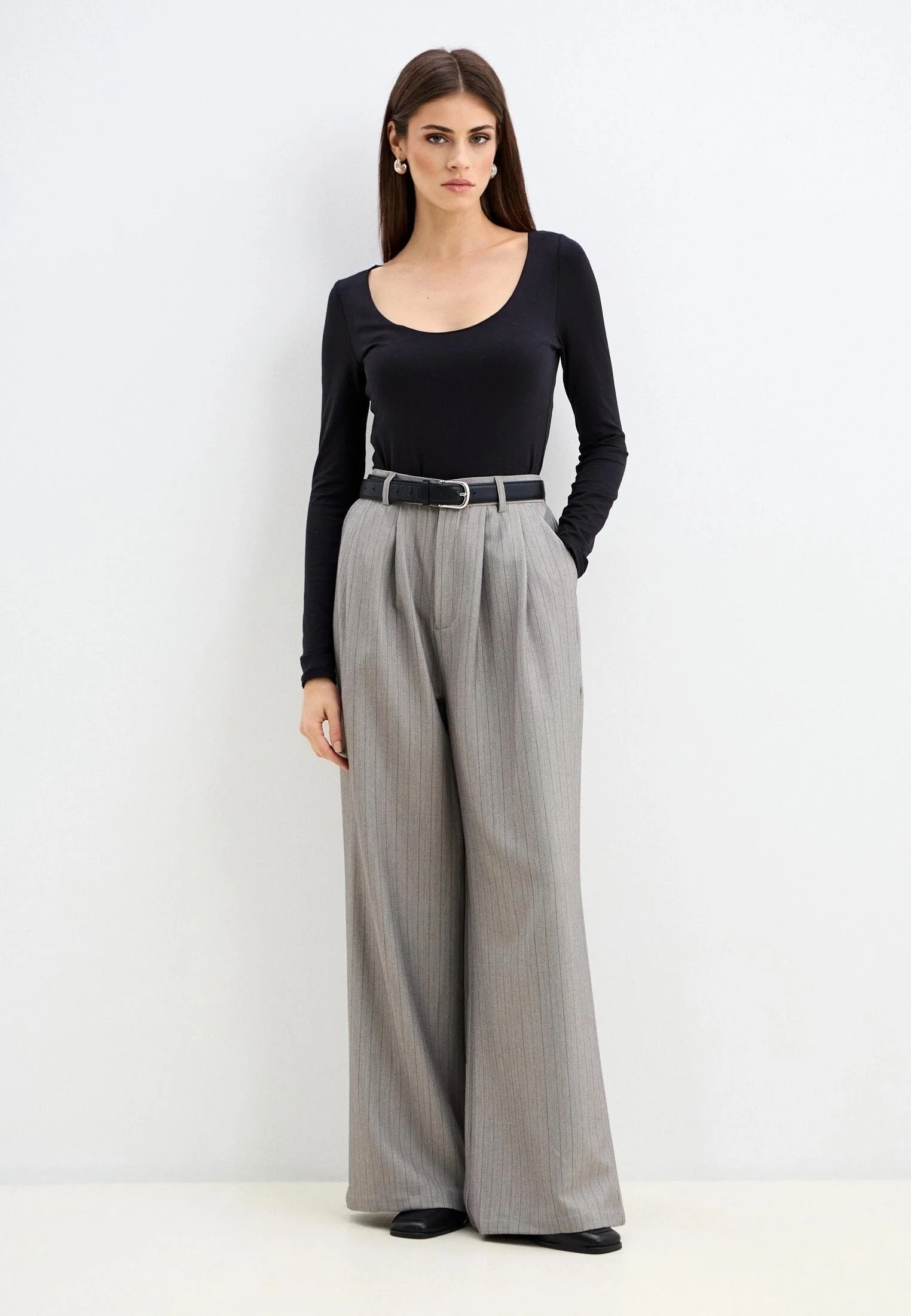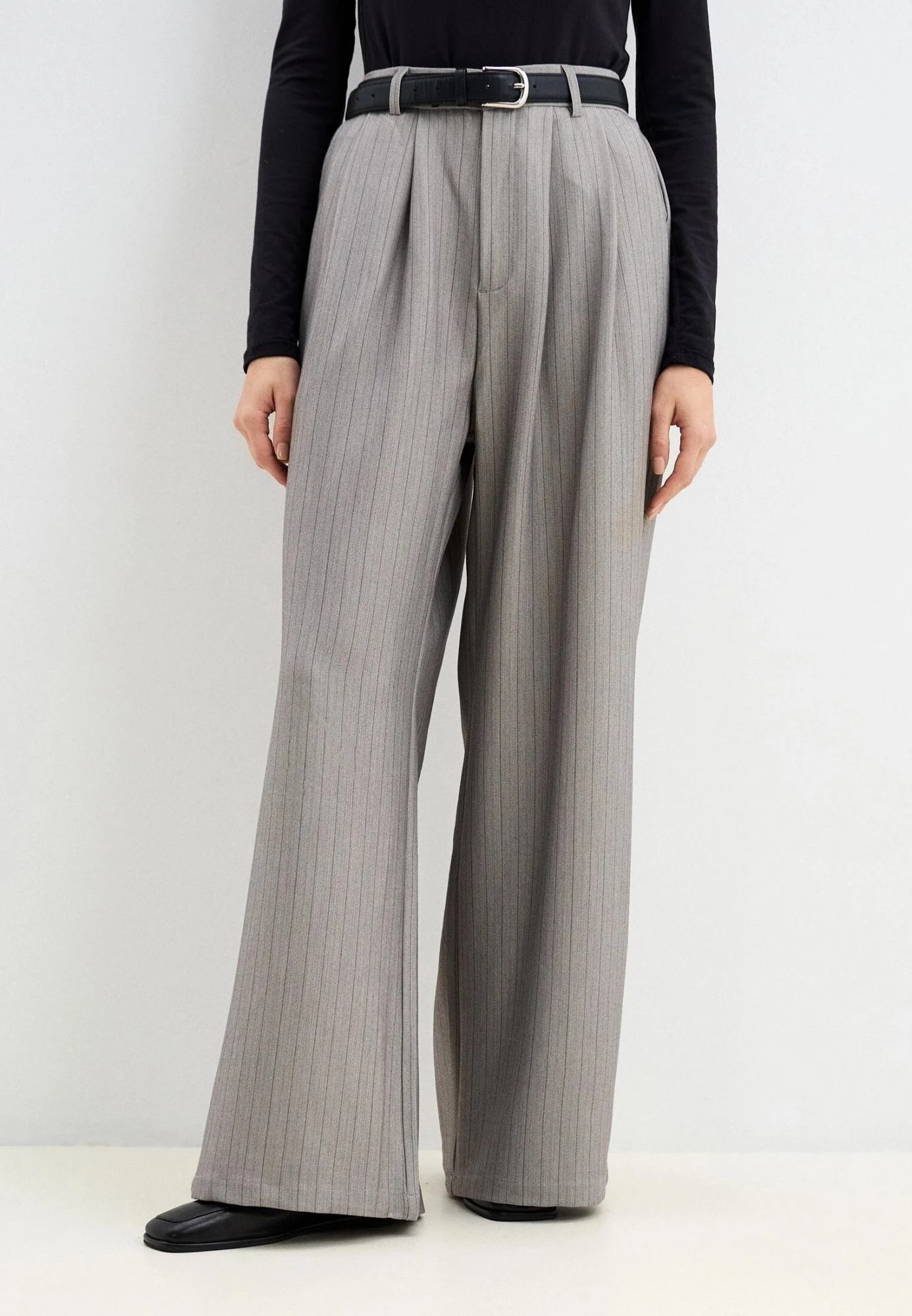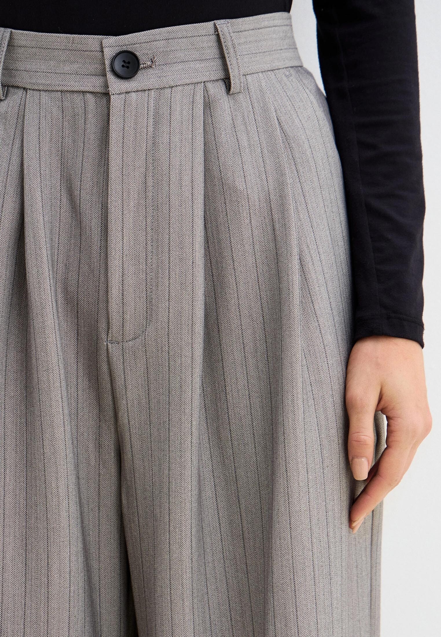 Брюки DUBER сдержанного серого оттенка и деликатной полоской подчеркивают элегантность образа. Высокая посадка и свободный крой дарят комфорт, а акцентные стрелки добавляют строгости. Идеальны для офиса и повседневных сочетаний.