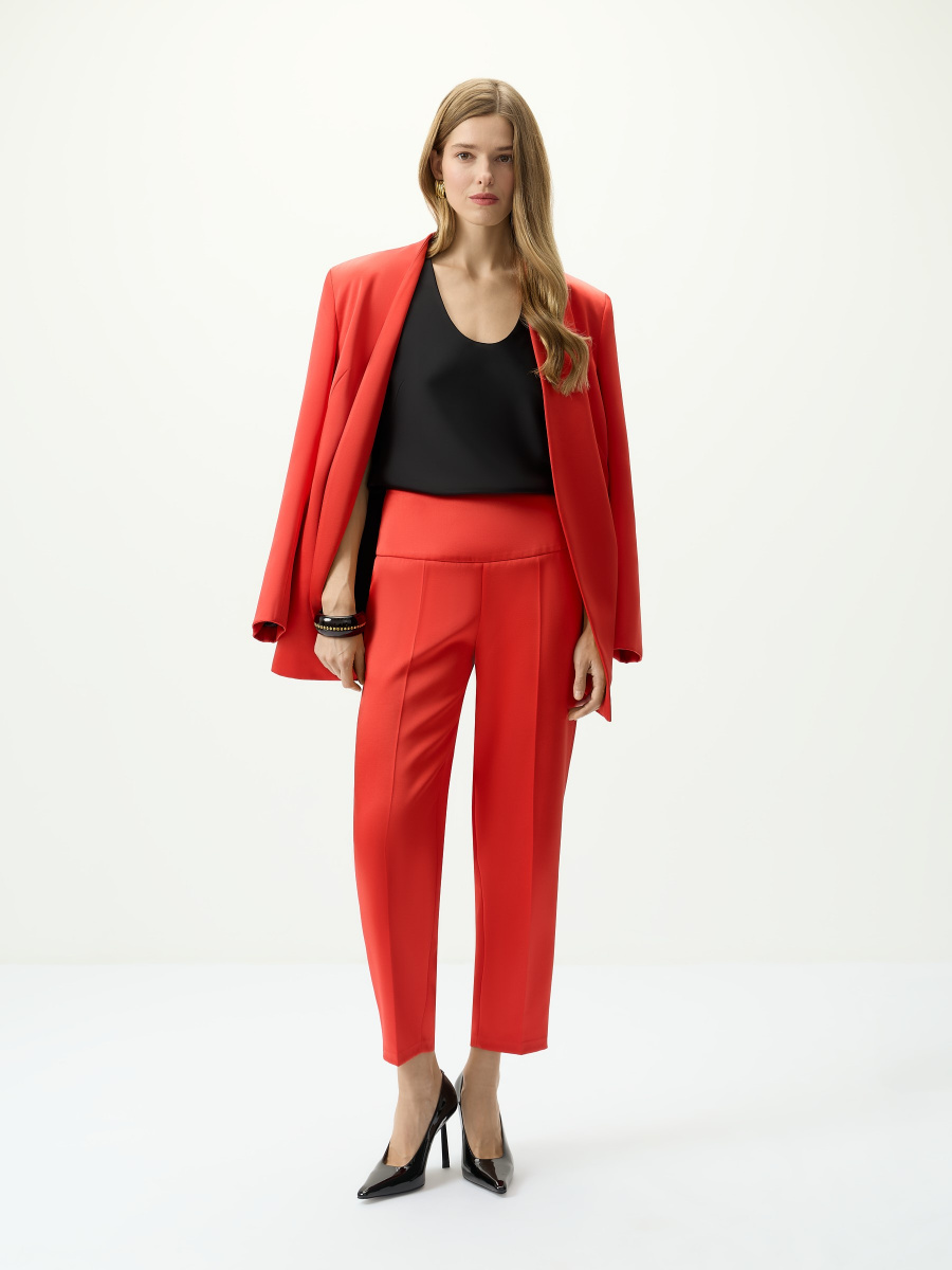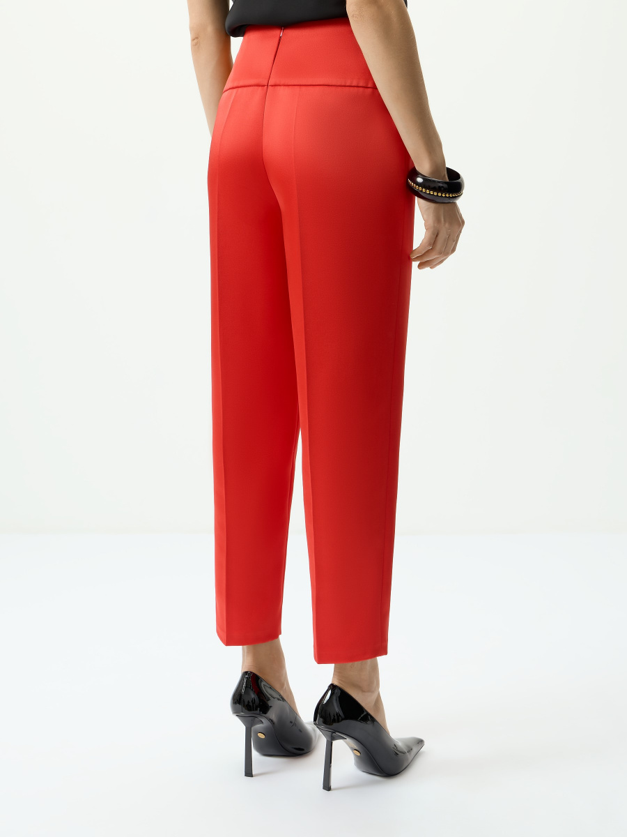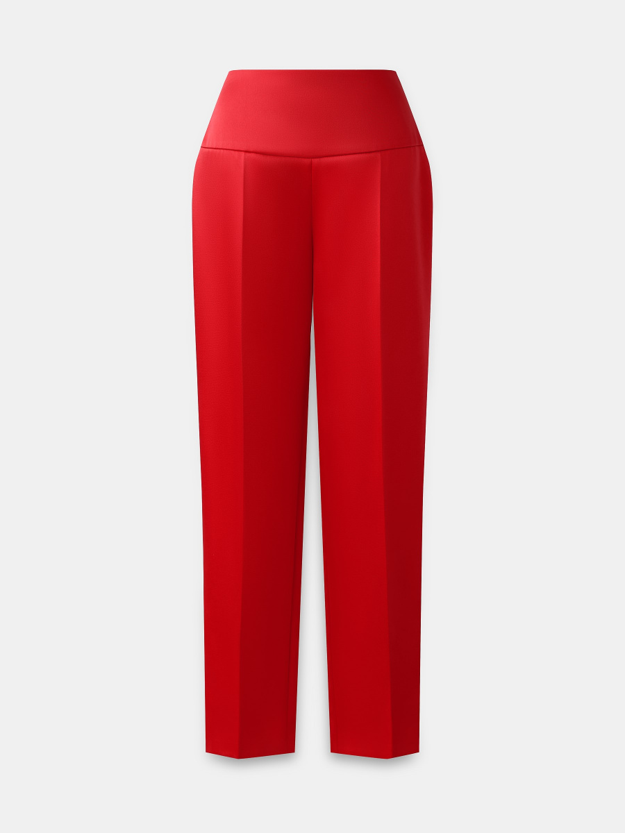 Укороченные брюки из плотного несминаемого материала с шелковистым блеском. Комфортного среднего облегания, чуть зауженные к низу. Широкий отрезной пояс моделирует область талии, заутюженные стрелки добавляют элегантной графичности. Потайная застежка на нейлоновую молнию в тон.