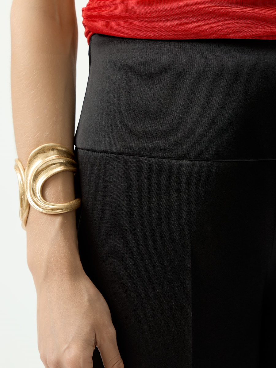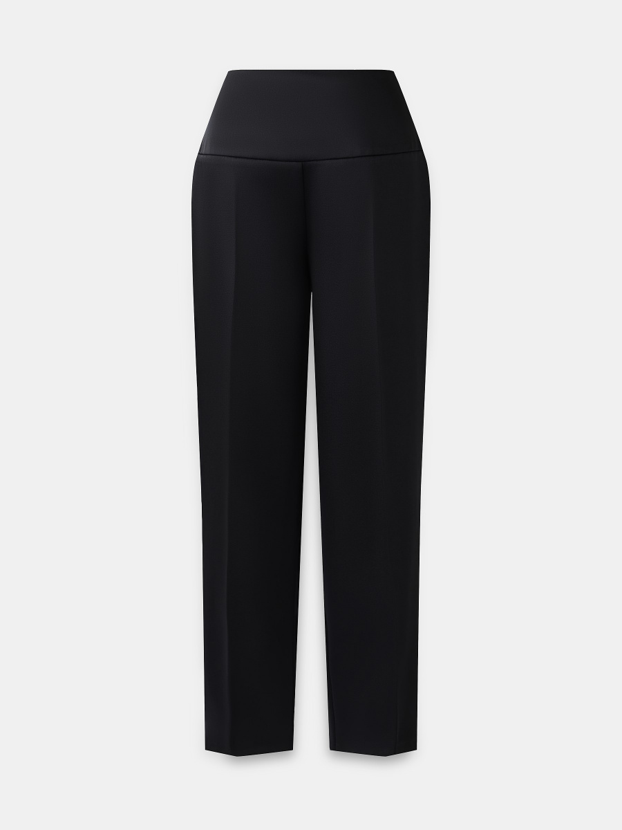 Укороченные брюки из плотного несминаемого материала с шелковистым блеском. Комфортного среднего облегания, чуть зауженные к низу. Широкий отрезной пояс моделирует область талии, заутюженные стрелки добавляют элегантной графичности. Потайная застежка на нейлоновую молнию в тон.