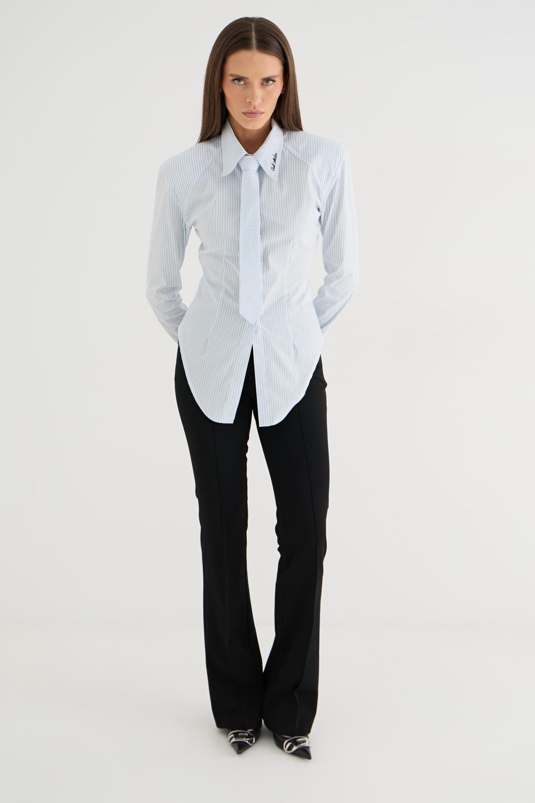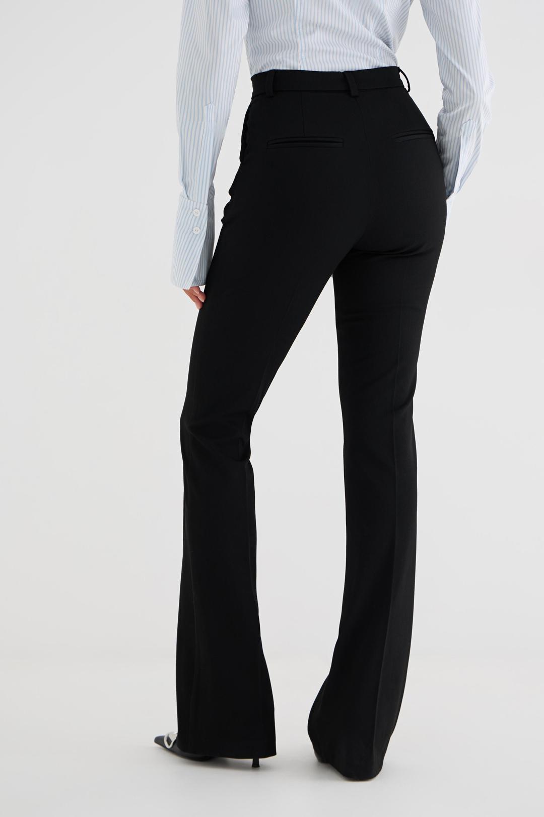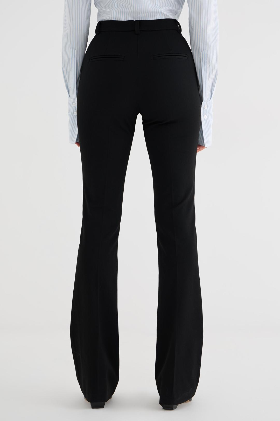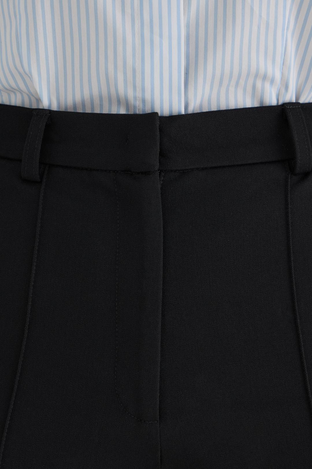 Брюки женские из костюмной ткани силуэта 'cigarette'. Изделие с боковыми карманами и застёжкой гульфик на молнию, крючок и пуговицу. Задние половинки с талиевыми вытачками и ложными прорезными карманами в рамку.