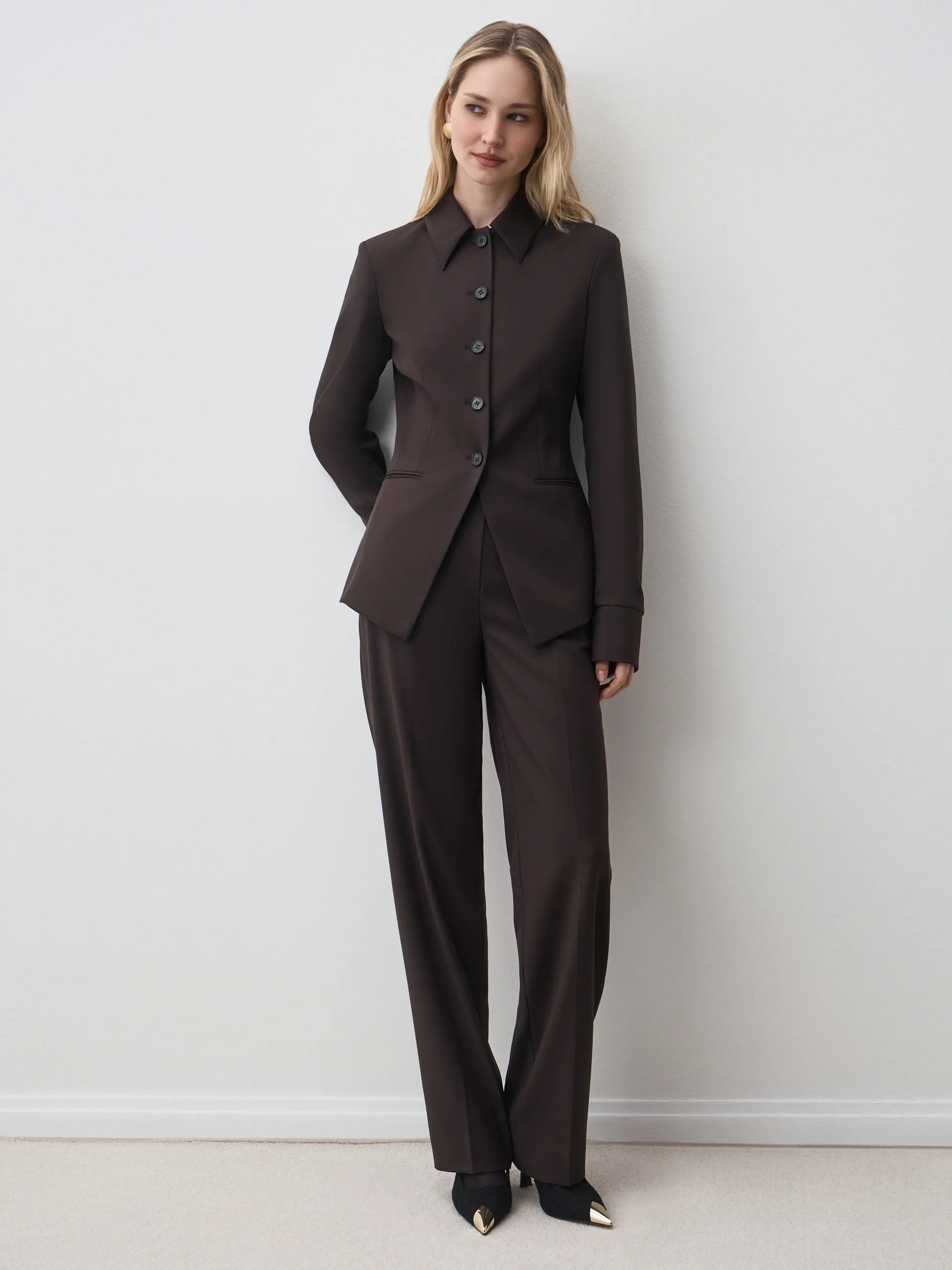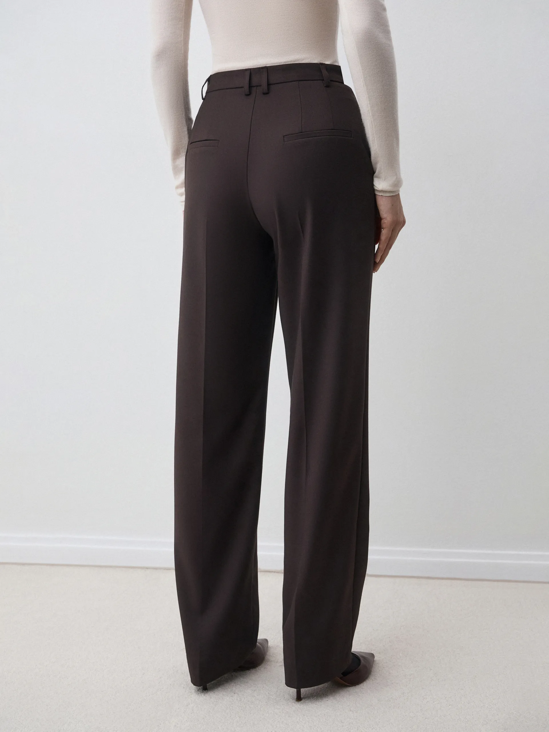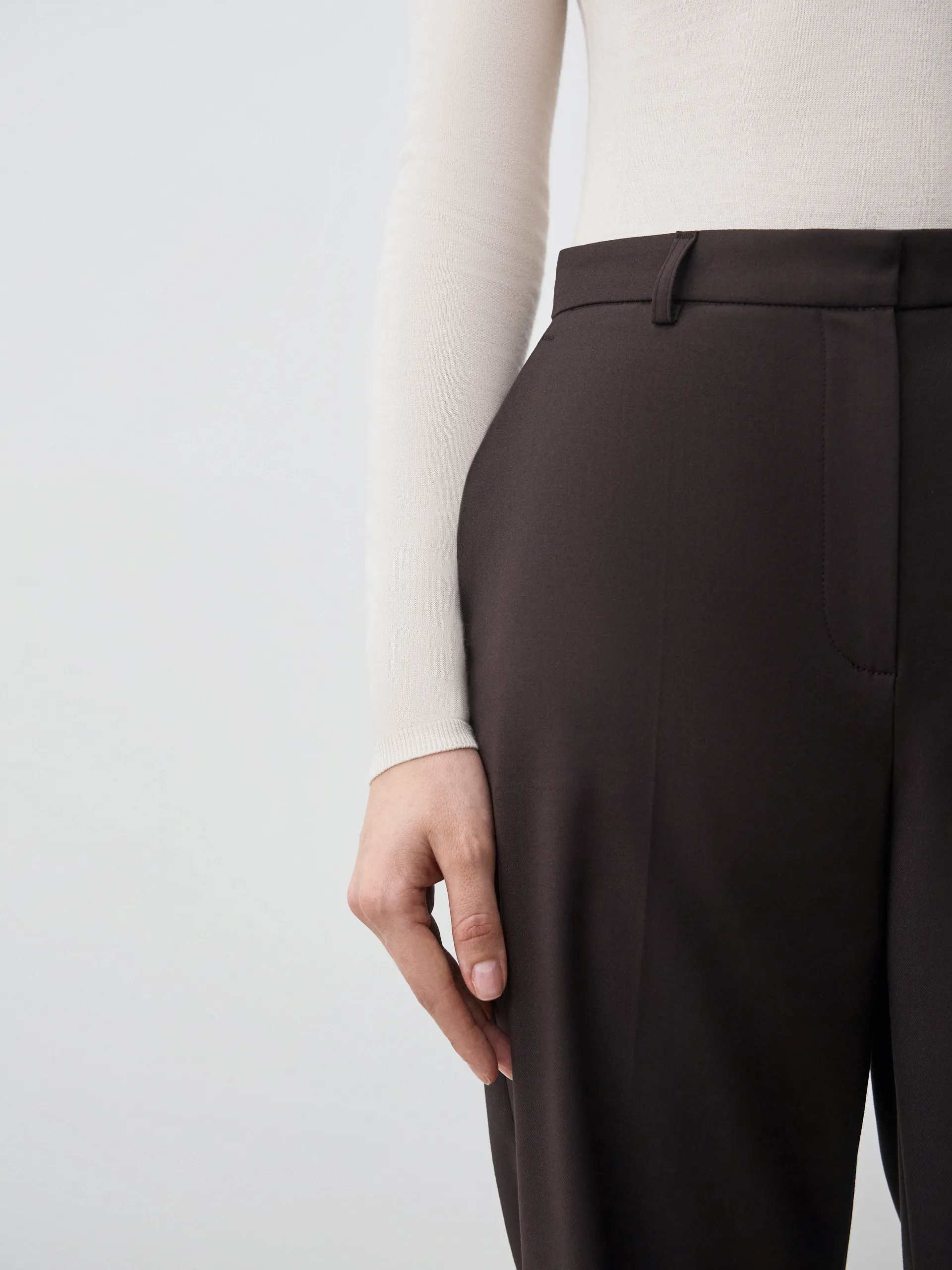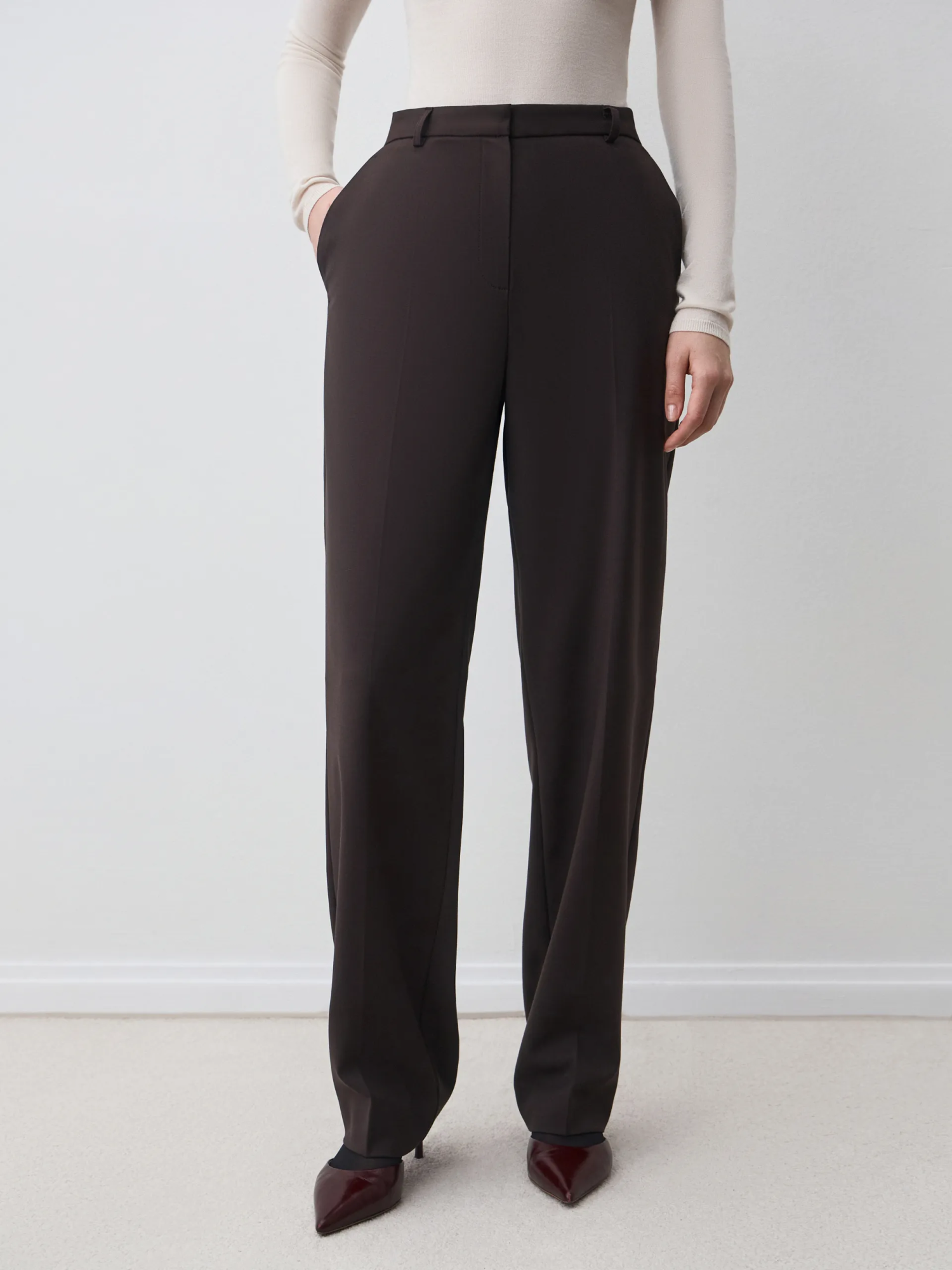 Брюки Dottie — лаконичная модель прямого зауженного кроя, выполненная из костюмной ткани с добавлением вискозы. Плотный, но пластичный материал обеспечивает комфорт и отличную посадку по фигуре. Оттенок темного шоколада делает брюки универсальной основой гардероба: они гармонично сочетаются с рубашками, жакетами и трикотажем, подойдут как для офиса, так и для повседневных образов.