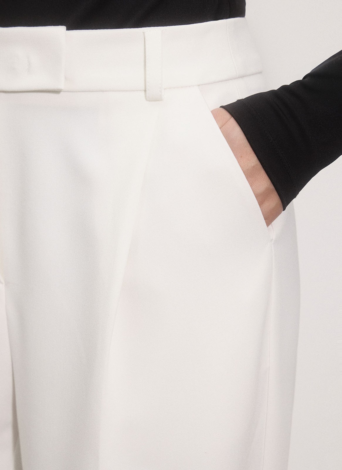 Классический крой, дополненный аккуратными складками и заутюженными стрелками, визуально удлиняет ноги. Застёжка на потайную пуговицу и крючок обеспечивает комфортную посадку. Спереди расположены удобные карманы, а сзади – имитация кармана в качестве акцента.
