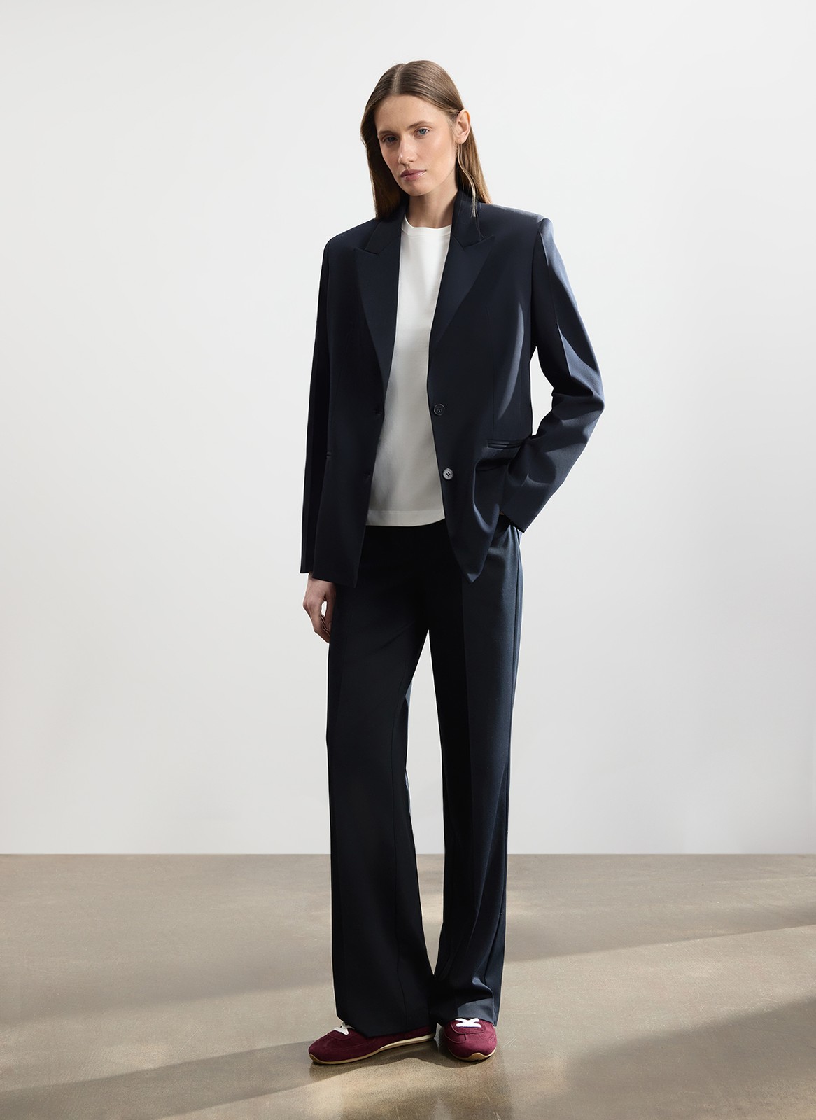 Приятная на ощупь костюмная ткань хорошо держит форму и не сковывает движения.