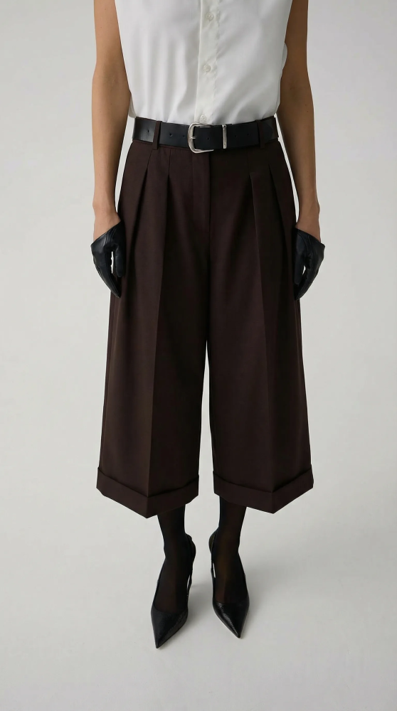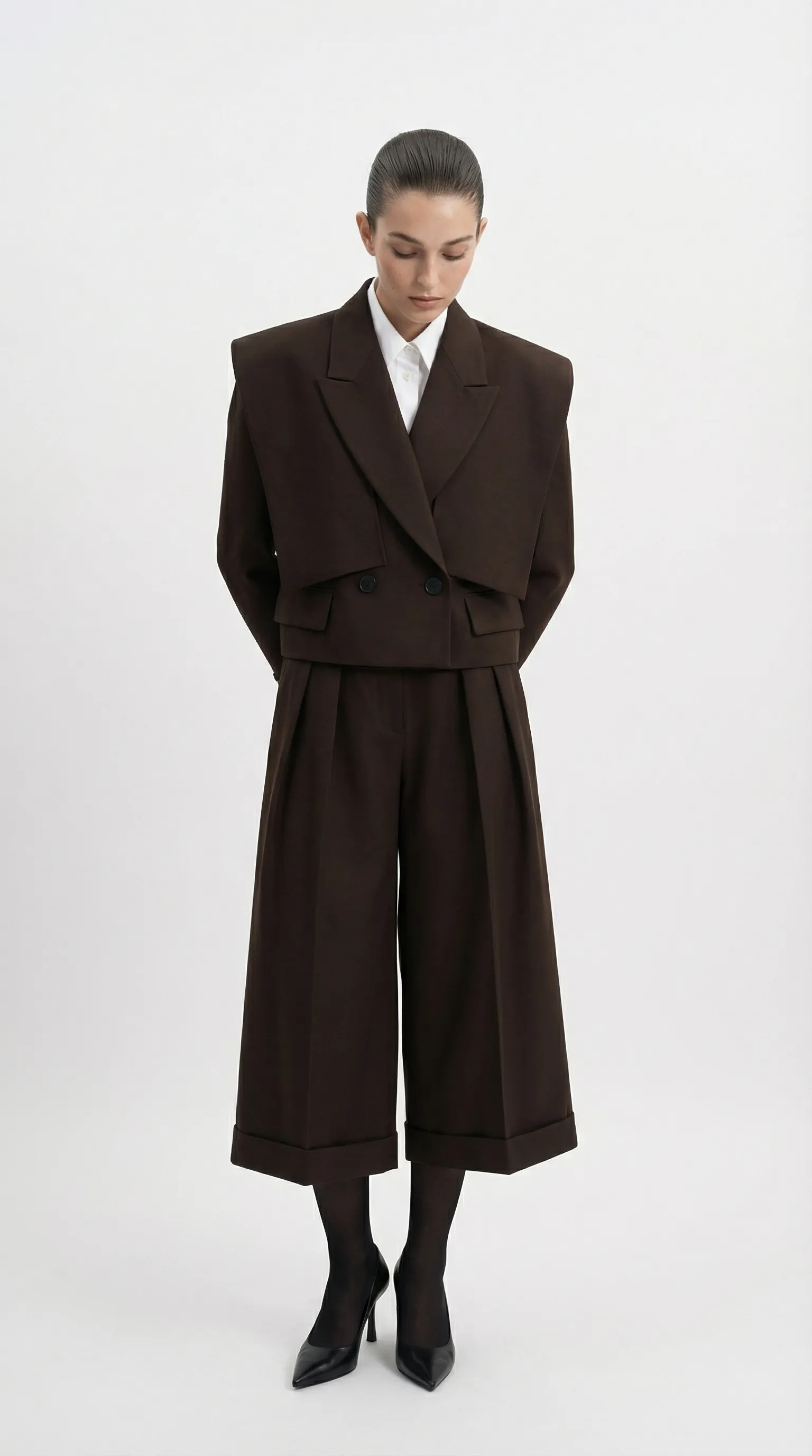 Наш бестселлер - кюлоты из шерсти в сочетании с укороченным жакетом с акцентными деталями в новом шоколадном оттенке шерсти.