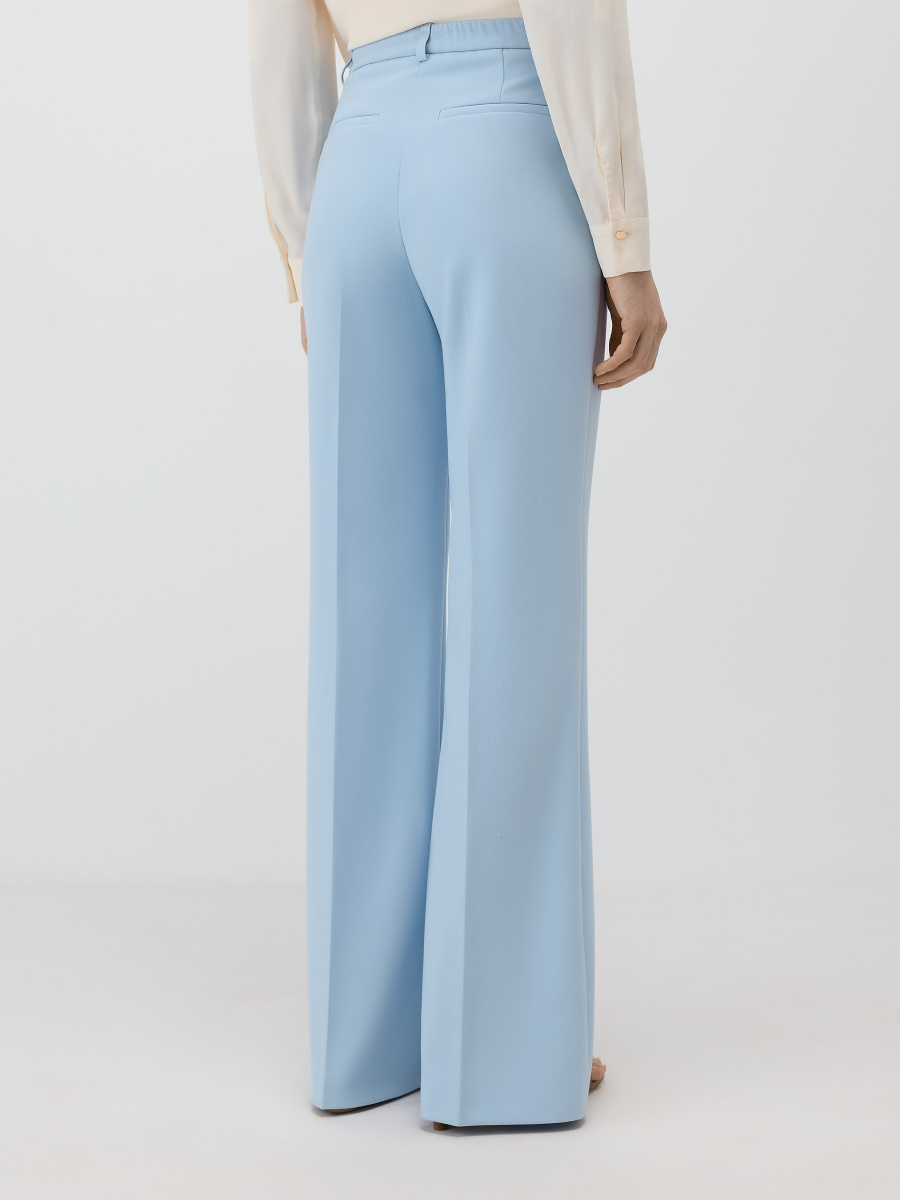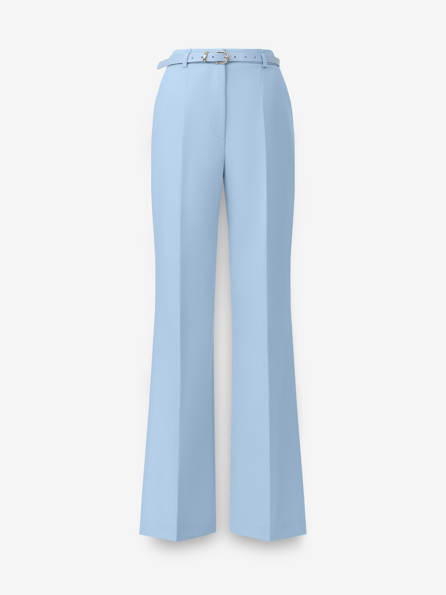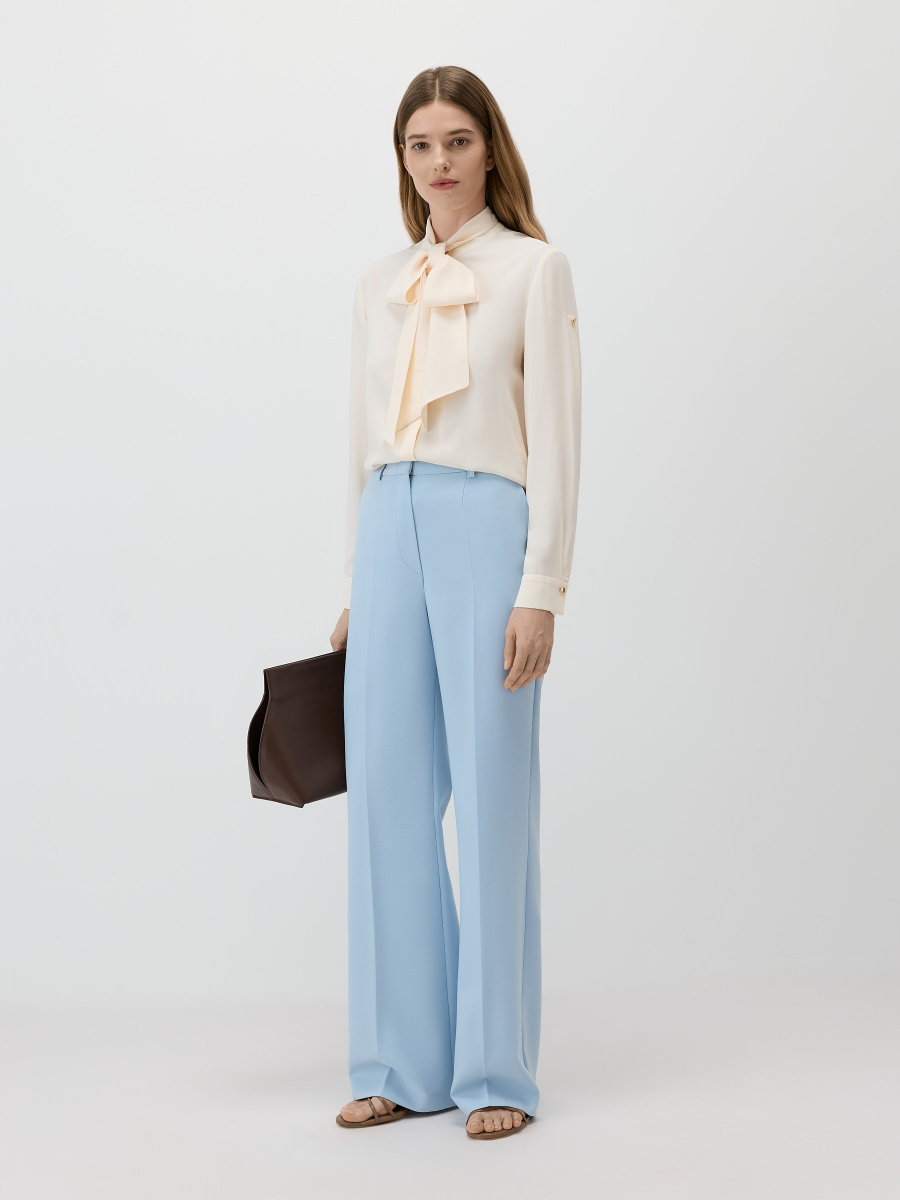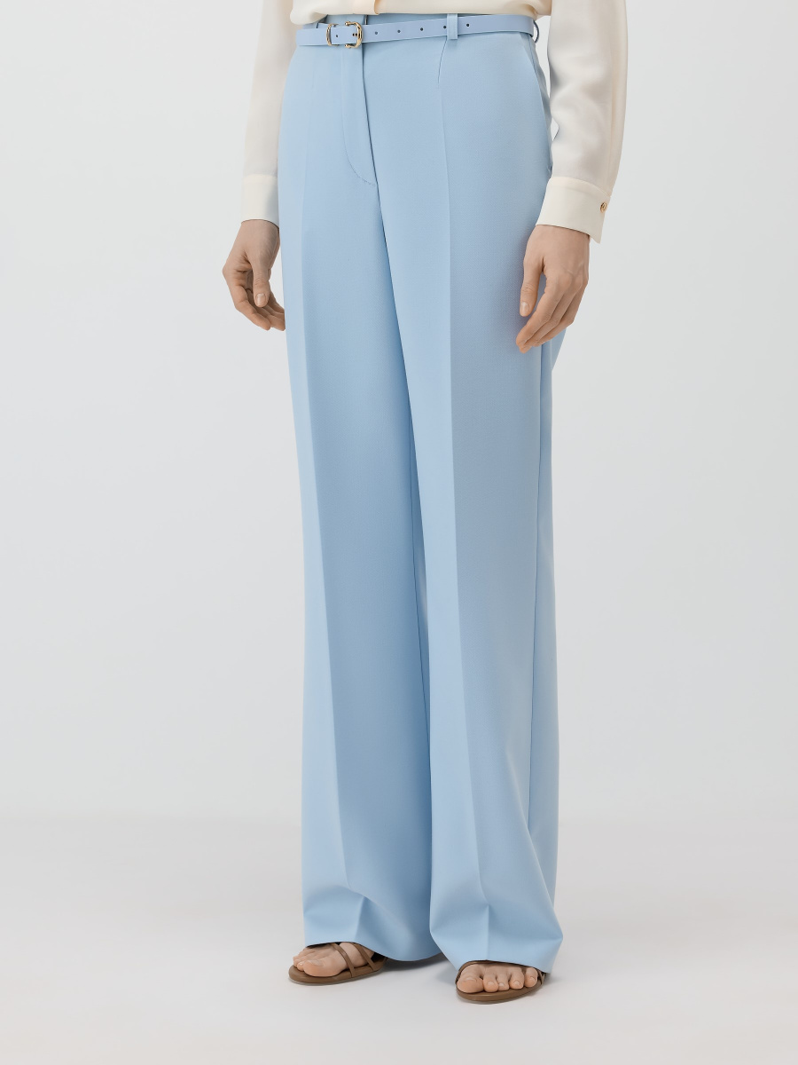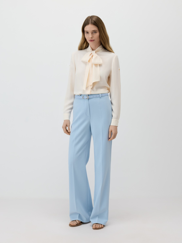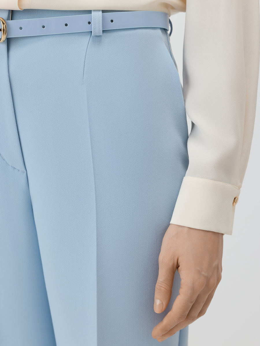 Свободные брюки из немнущейся костюмной поливискозы, сохраняющей четкость линий. Посадка на талии, длина в пол и заутюженные стрелки моделируют силуэт. Слегка заужены у колена. Пояс с эластичной вставкой на спинке создает дополнительный комфорт. Модель дополнена шлевками, функциональными боковыми и задними карманами-имитациями, а также ремнем из экокожи в тон. Застежка на молнию, крючок и пуговицу.